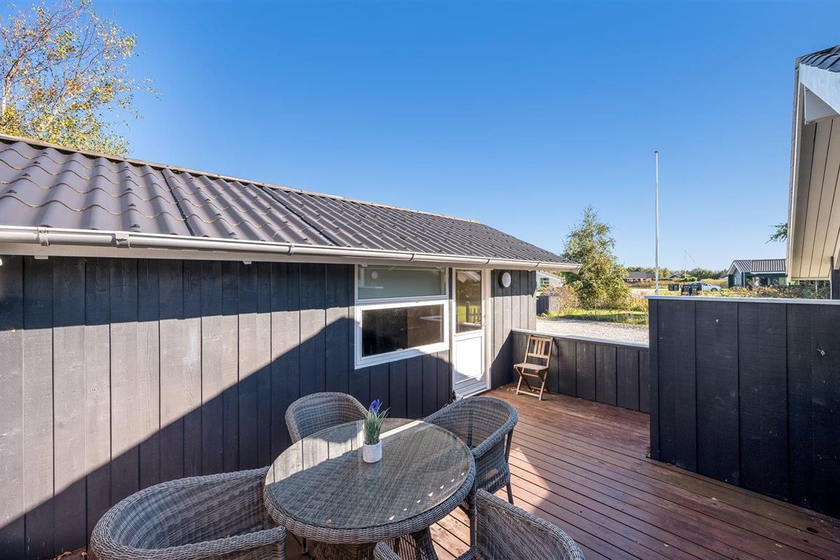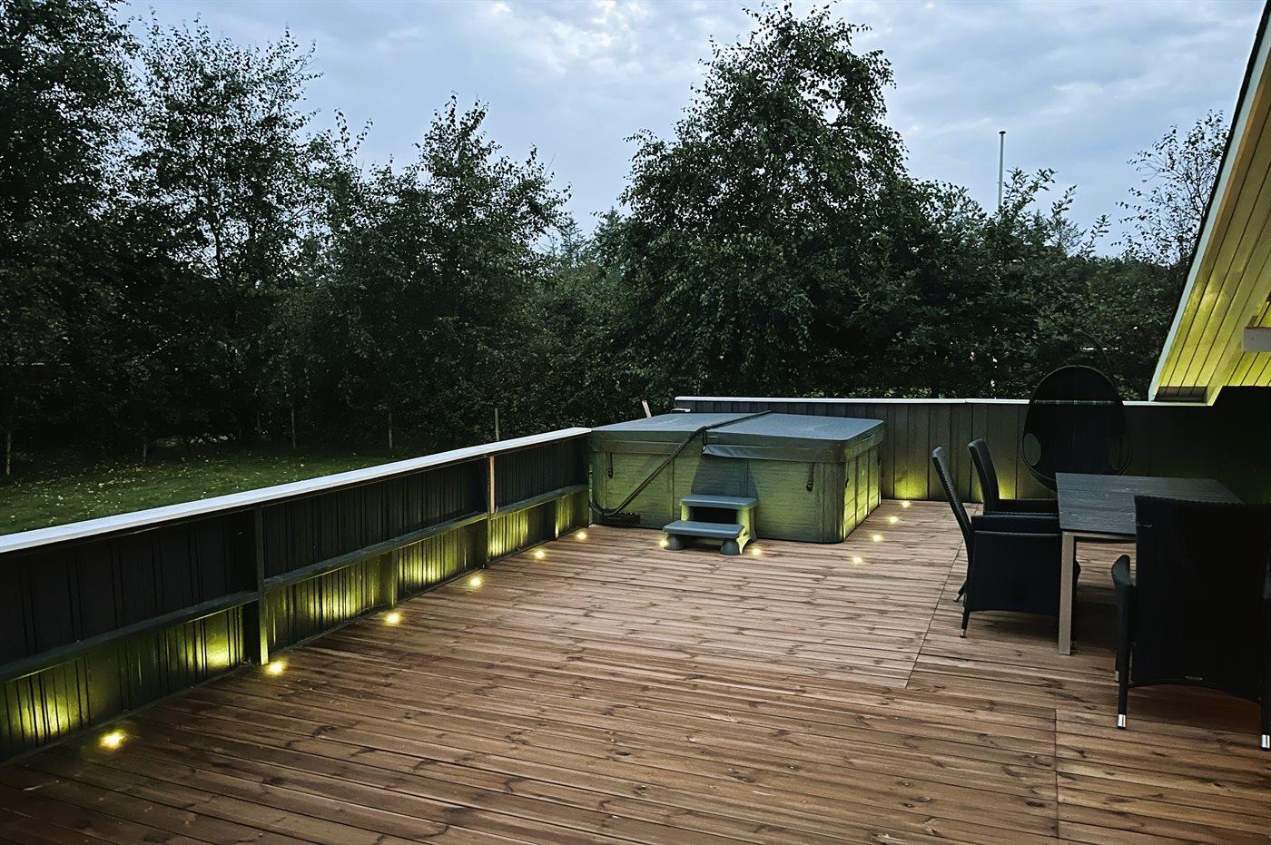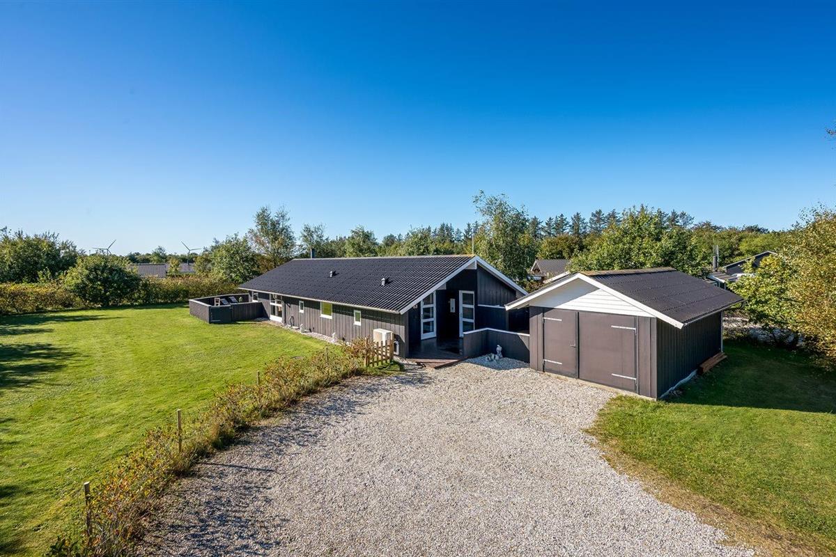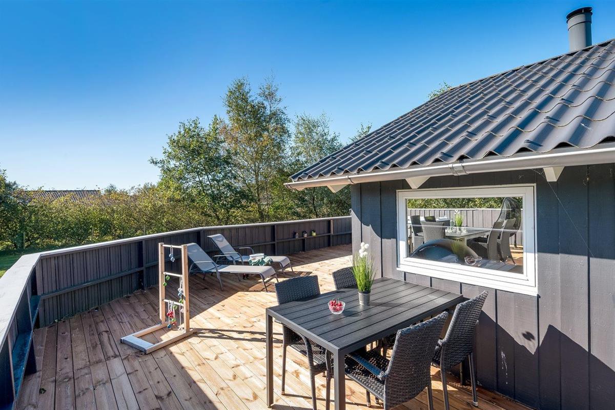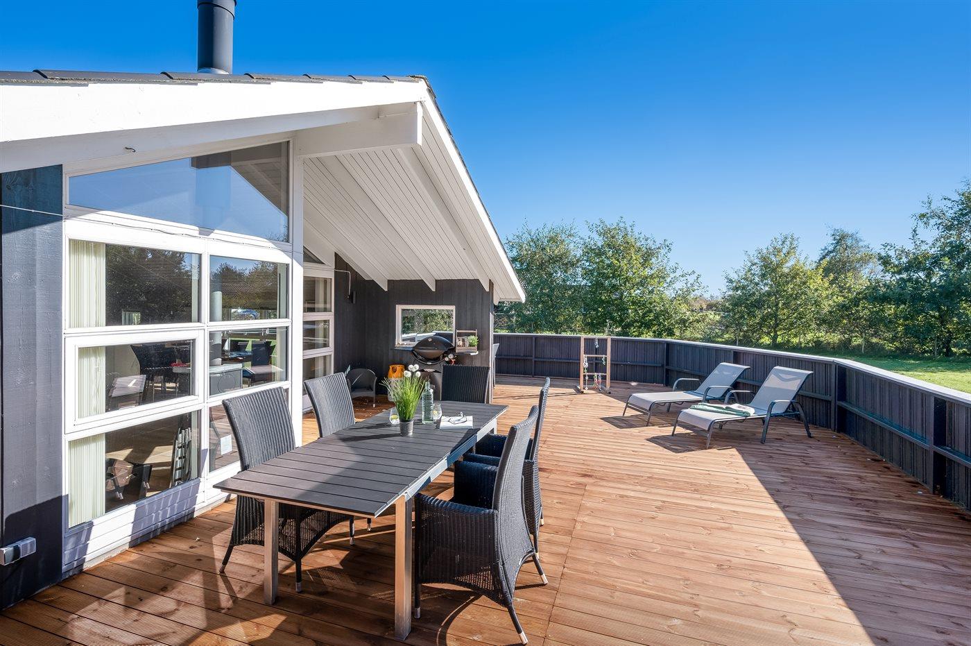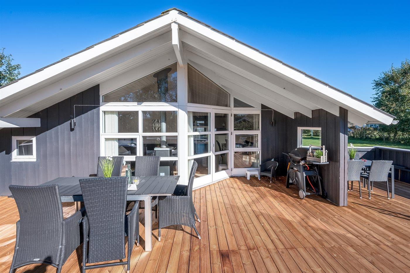 De vakantiewoning is gelegen op een 1205 m² groot natuural grond. De grond is omheind. Afstand tot de zee 7100 m. Afstand tot de fjord 1000 m. Dichtstbijzijnde winkel 1000 m. Bij de vakantiewoning hoort terras, gedeeltelijk overdekt terras en beschut terras. Er is een Weber barbecue beschikbaar. Parkeerplaats bij het huis.