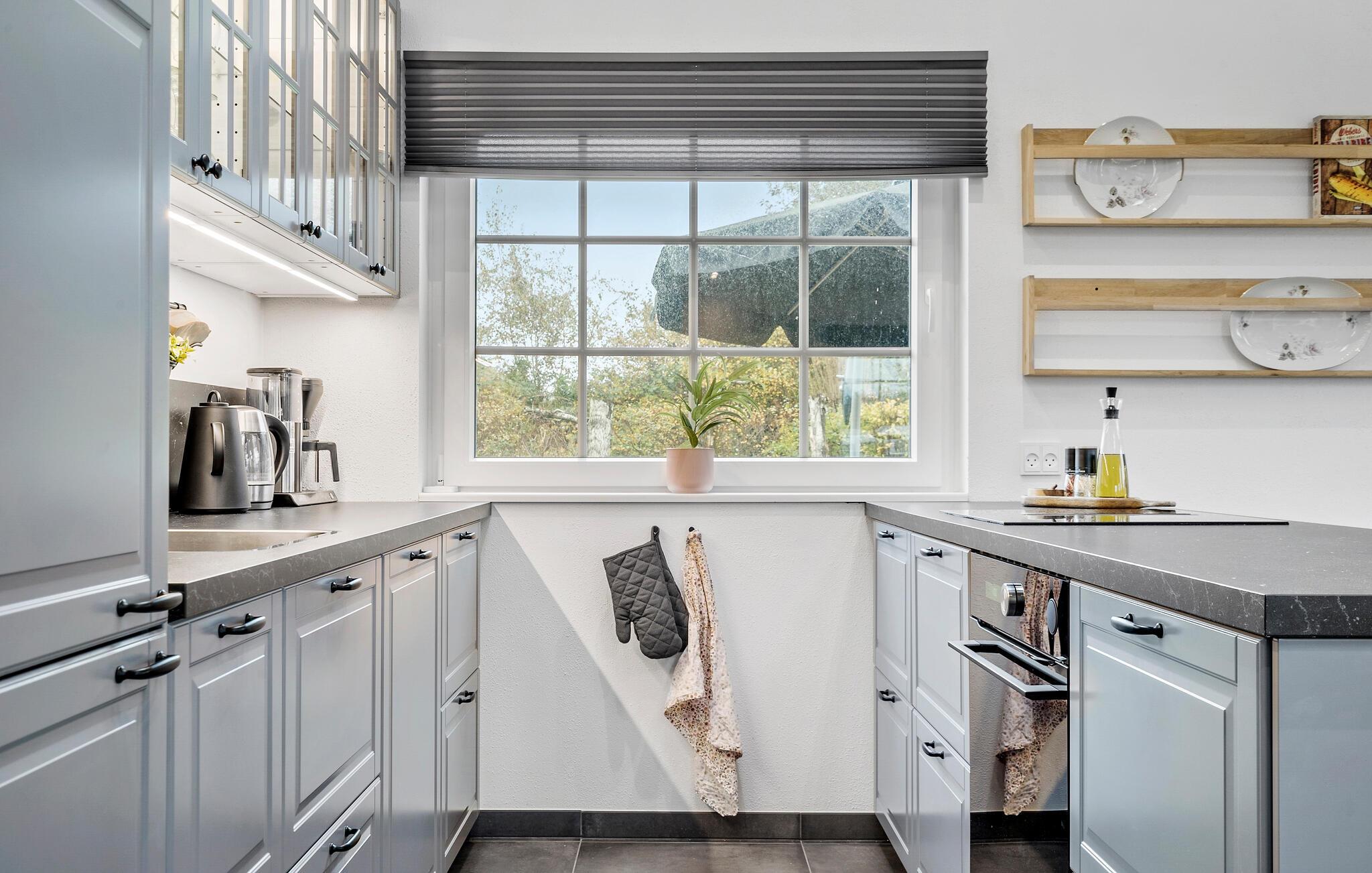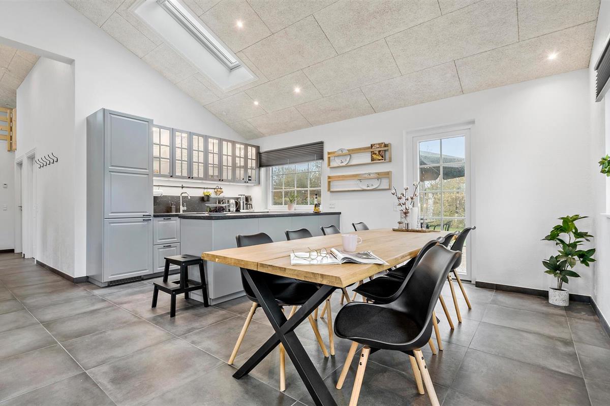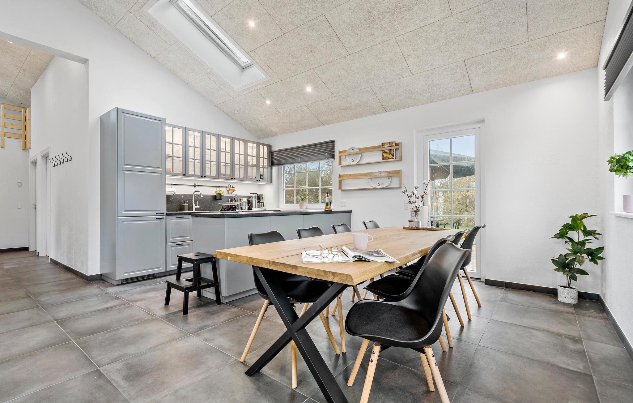 De open woonkamer met hoge plafonds en grote ramen creëert een lichte, vriendelijke sfeer. Ontspan in de ruime zithoek en geniet van de tijd met je familie of vrienden. De moderne, goed uitgeruste keuken met aangrenzende eettafel biedt ruimte voor gezamenlijke maaltijden en gezellige avonden.