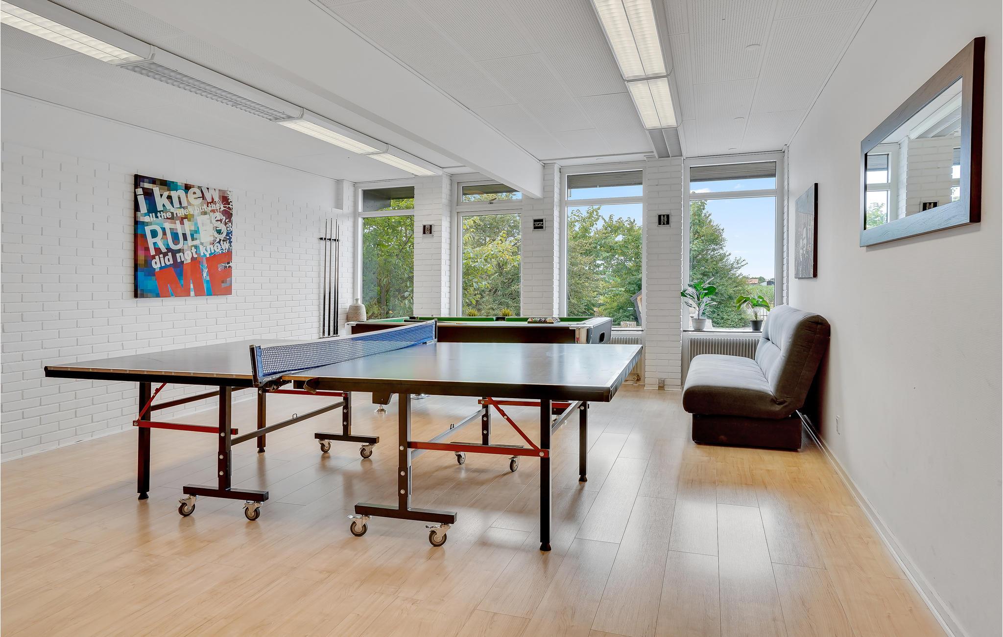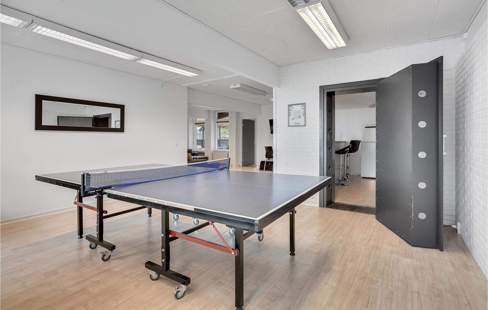 De banken in het woongedeelte van je vakantiehuis nodigen je uit om te ontspannen terwijl je samen een film kijkt of gewoon geniet van de rust. Gebruik de open keuken met moderne apparatuur om samen te koken en geniet van maaltijden aan de lange eettafel. Vlak ernaast is de bar met hoge krukken ideaal om 's avonds samen te zijn en de dag gezellig af te sluiten. Speel een spelletje biljart, tafeltennis of tafelvoetbal in de aangrenzende activiteitenruimte en breng gezellige uren door met familie of vrienden.