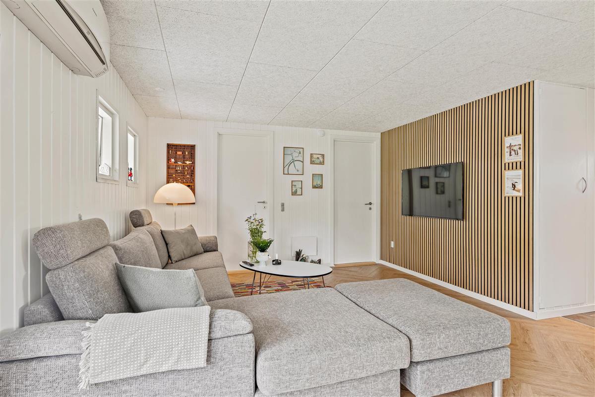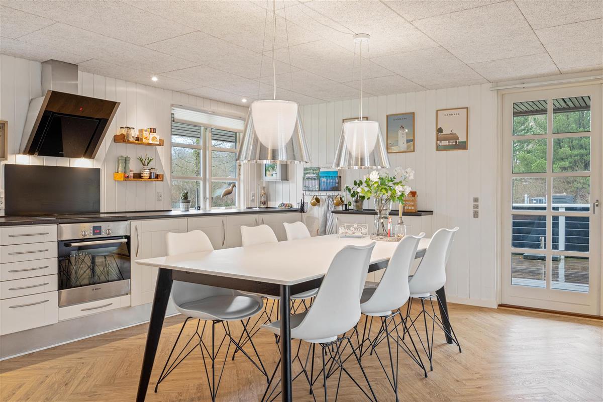 The heart of the living area features a welcoming wood-burning stove, providing a cosy atmosphere on cooler evenings. Here you can unwind after an eventful day – whether with a good book or during a family film night. The perfect blend of modern amenities and Scandinavian charm makes the space particularly inviting.