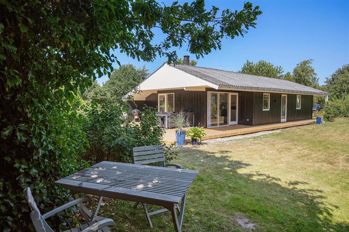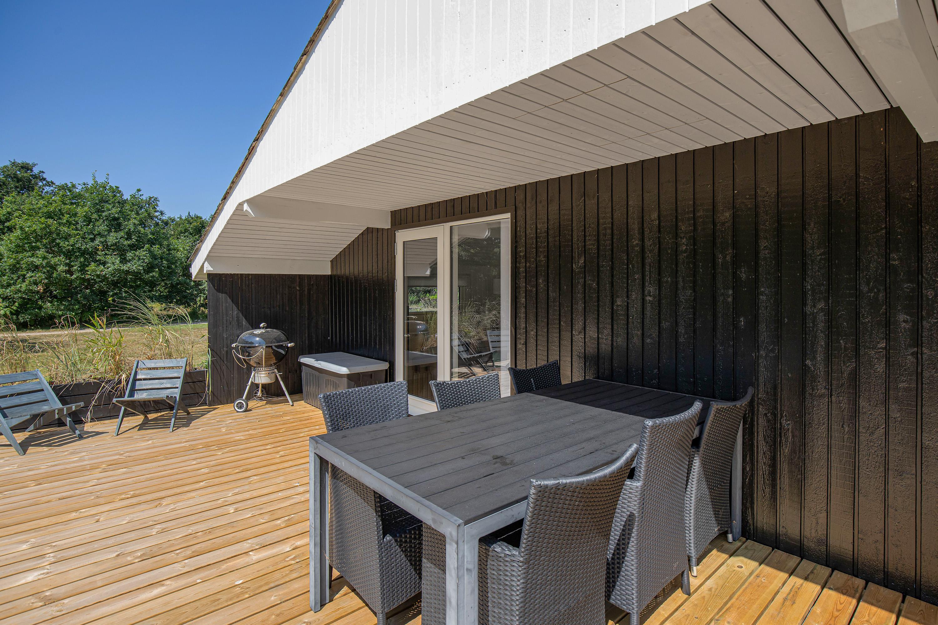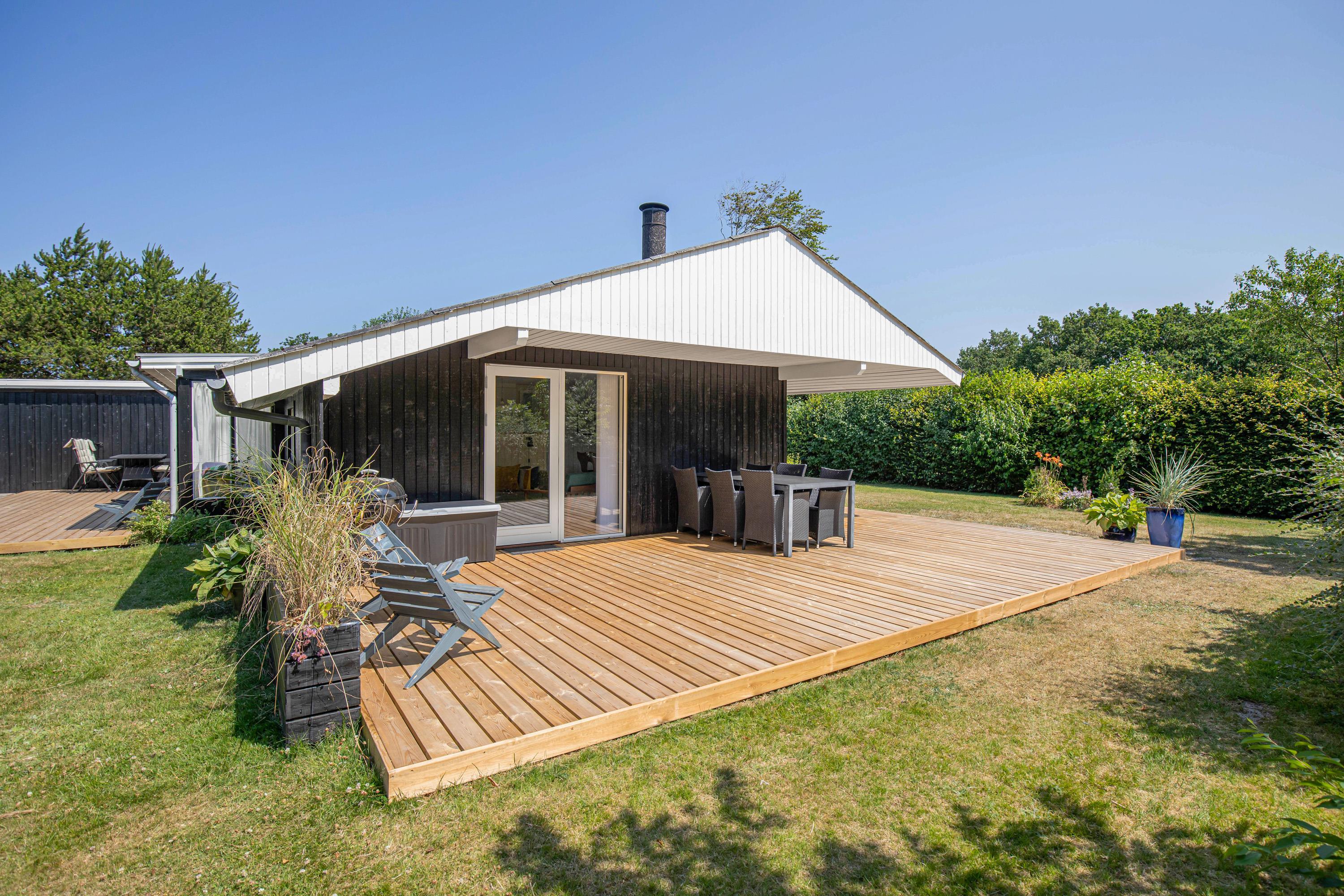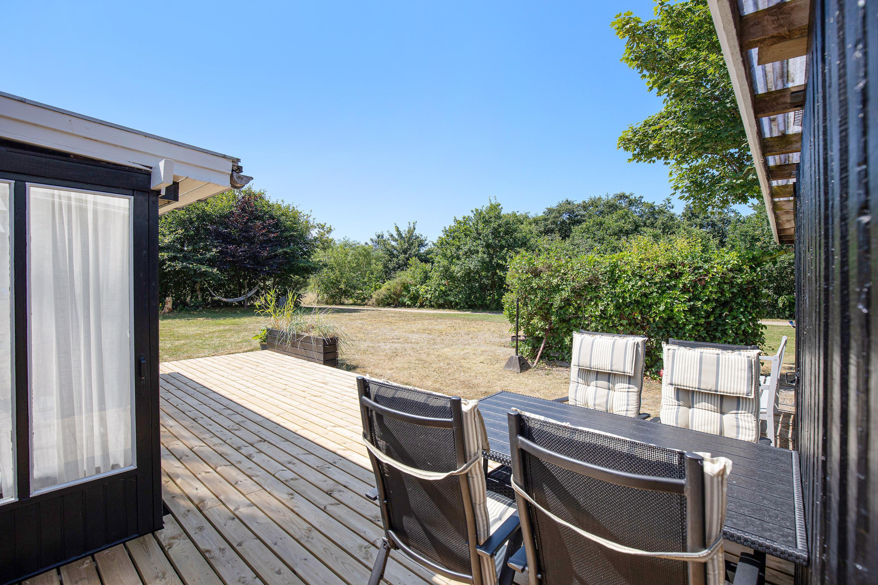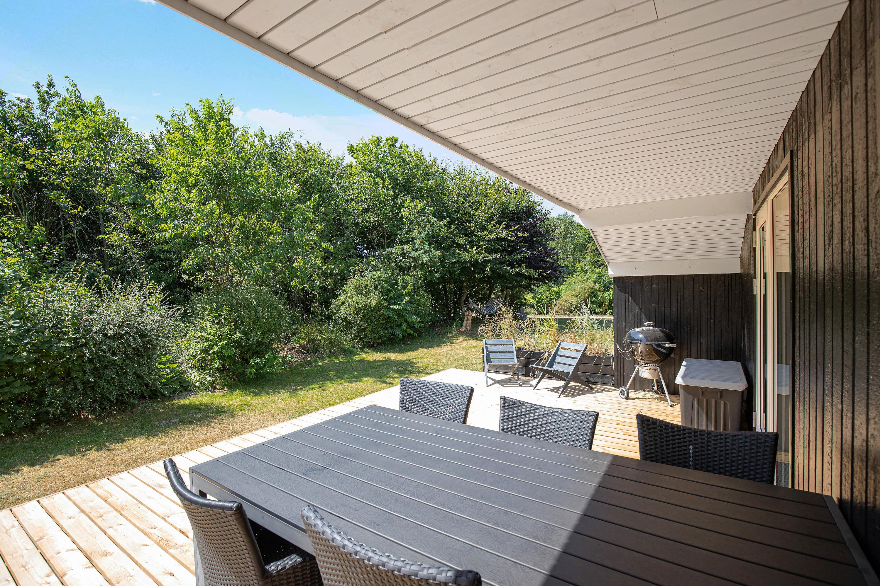 The terrace, which wraps almost entirely around the holiday home, is simply wonderful. Partially covered and equipped with a barbecue, sun loungers and garden furniture, it provides an ideal spot for summer relaxation. Put your feet up and listen to the birds singing and the wind rustling through the treetops.