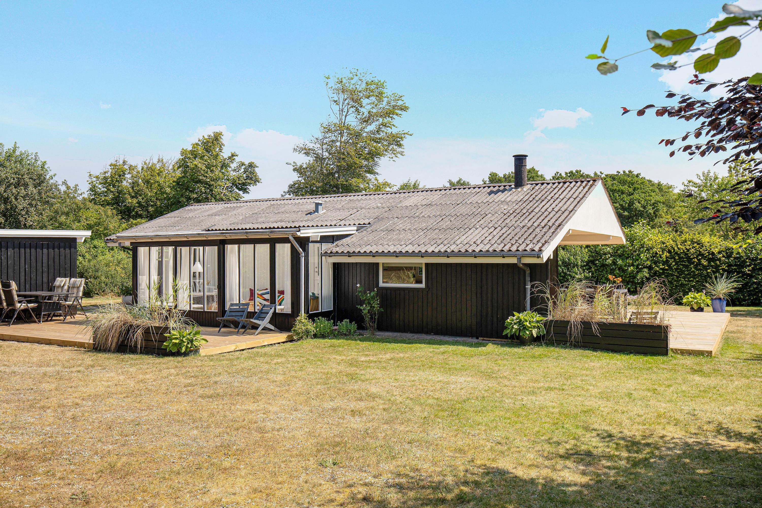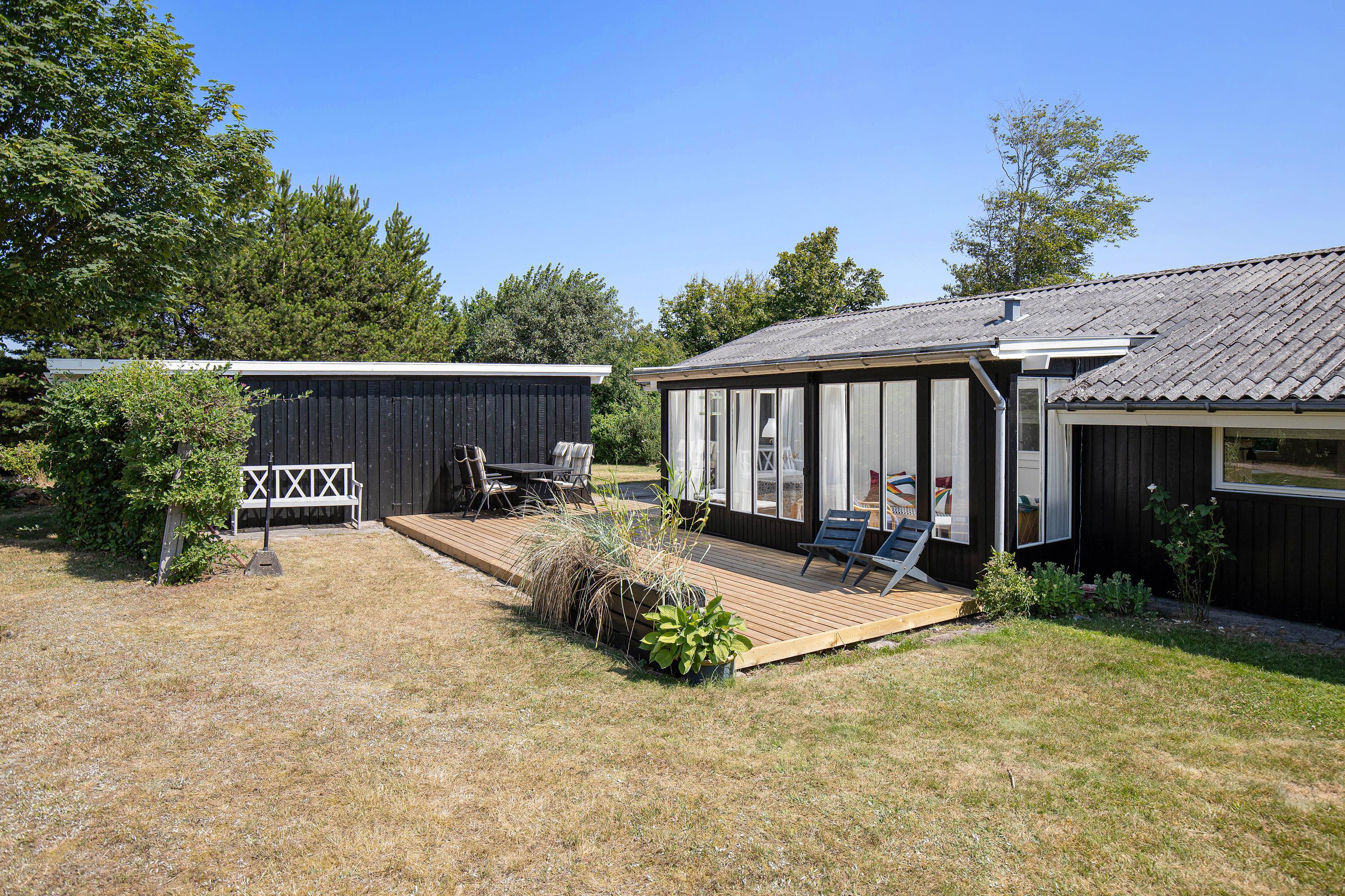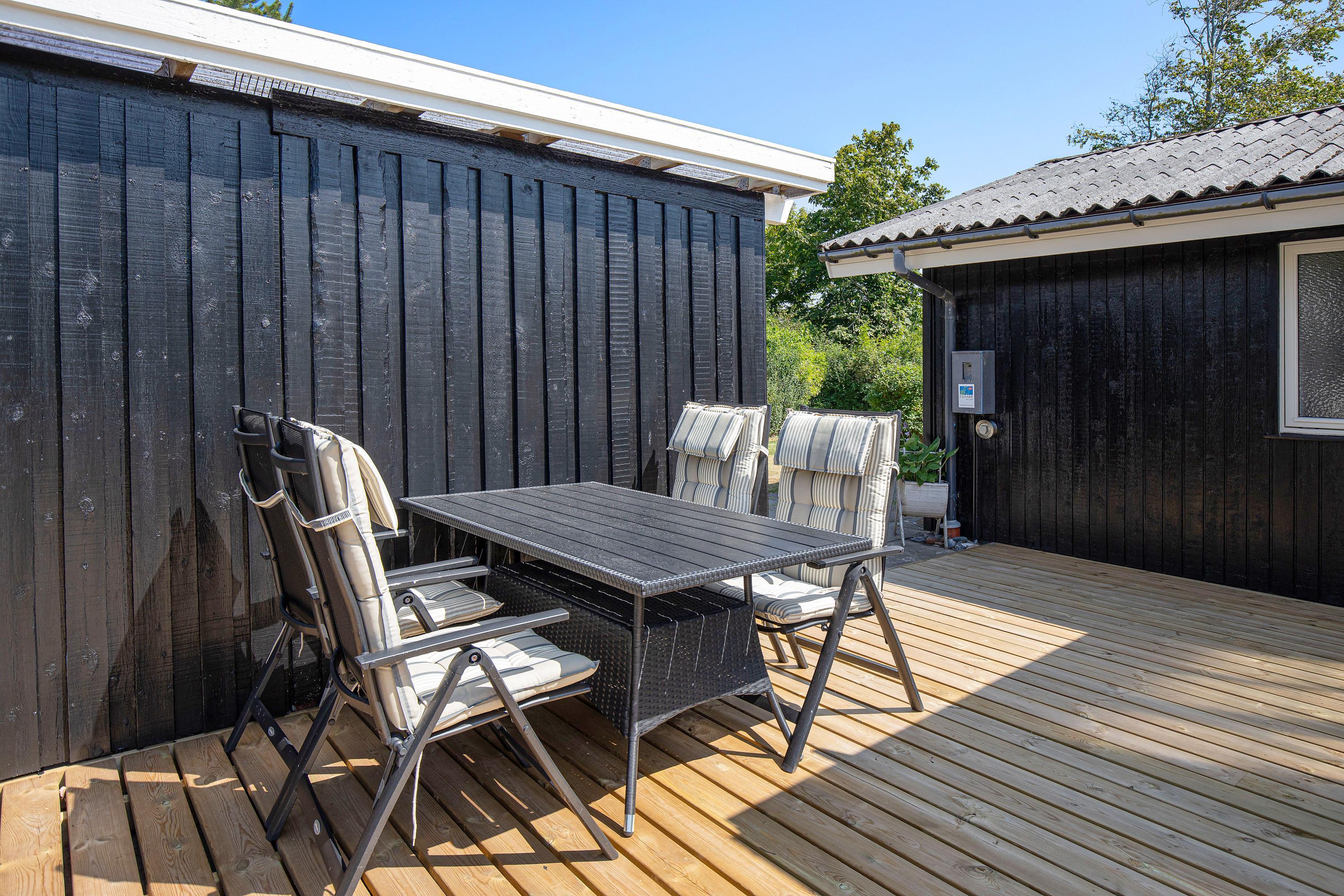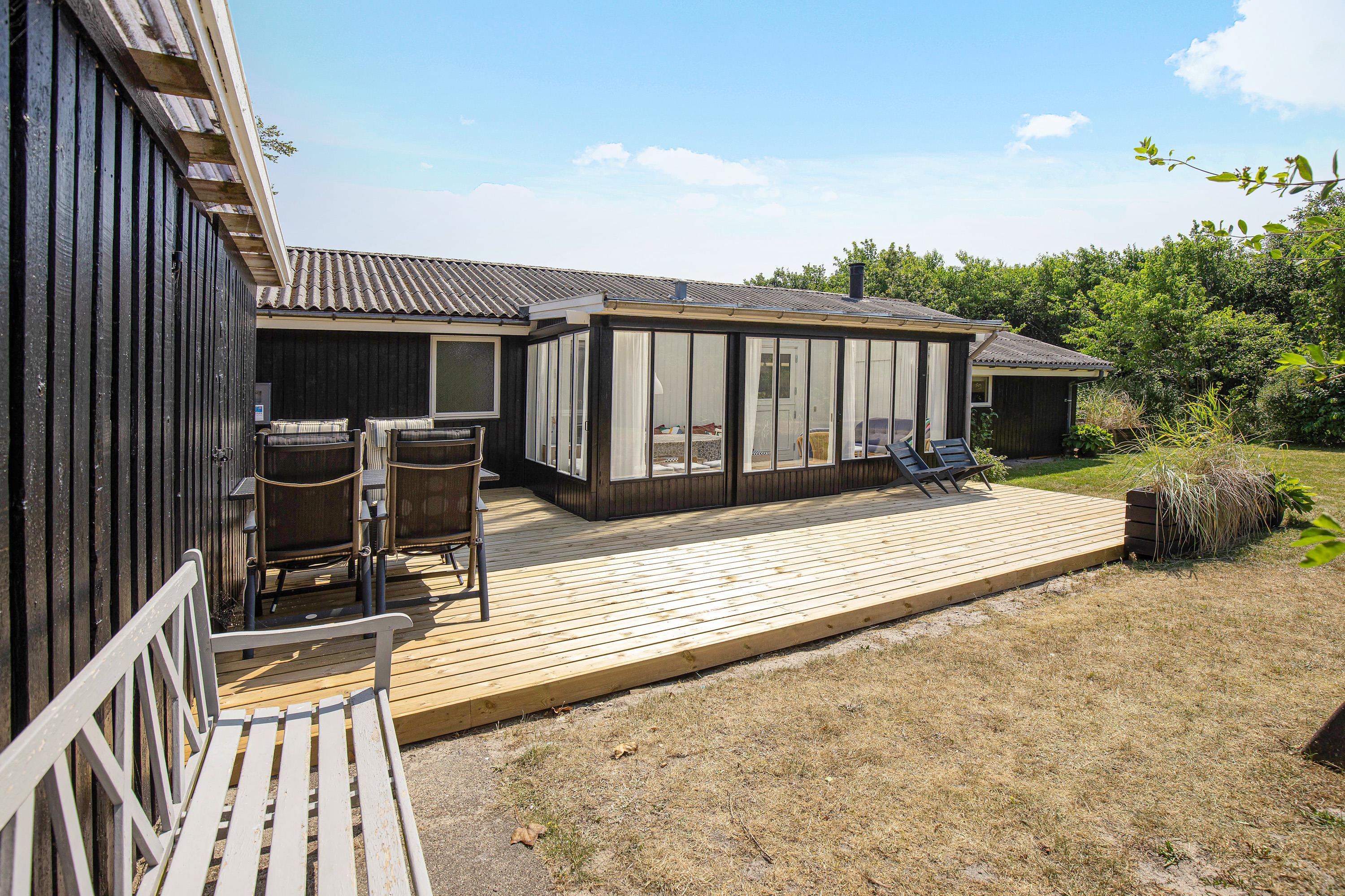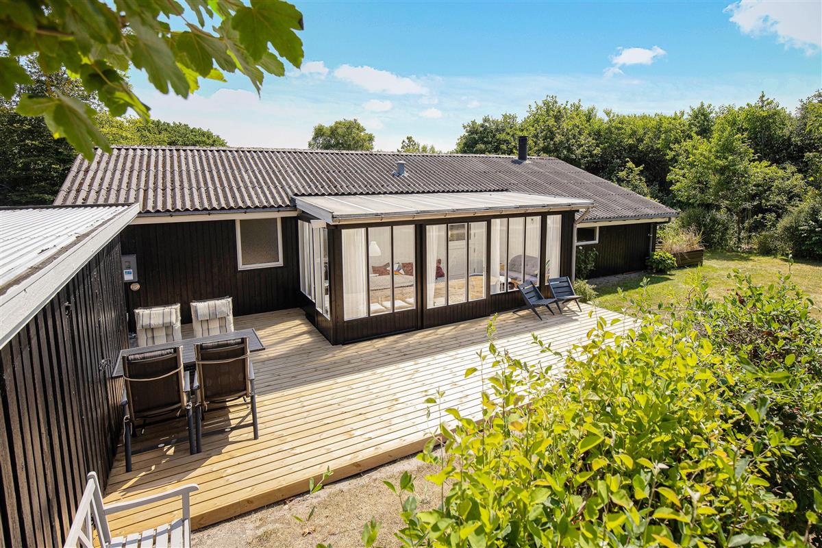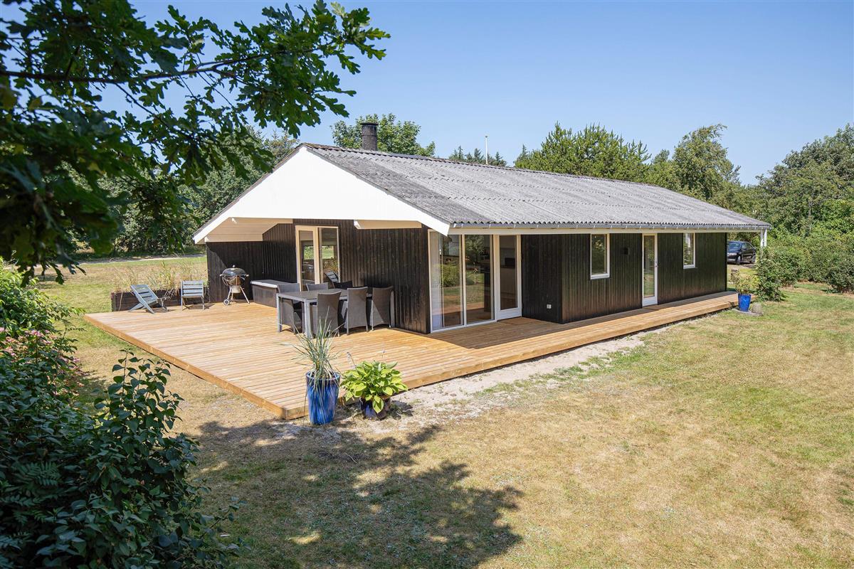 The terrace, which wraps almost entirely around the holiday home, is simply wonderful. Partially covered and equipped with a barbecue, sun loungers and garden furniture, it provides an ideal spot for summer relaxation. Put your feet up and listen to the birds singing and the wind rustling through the treetops.