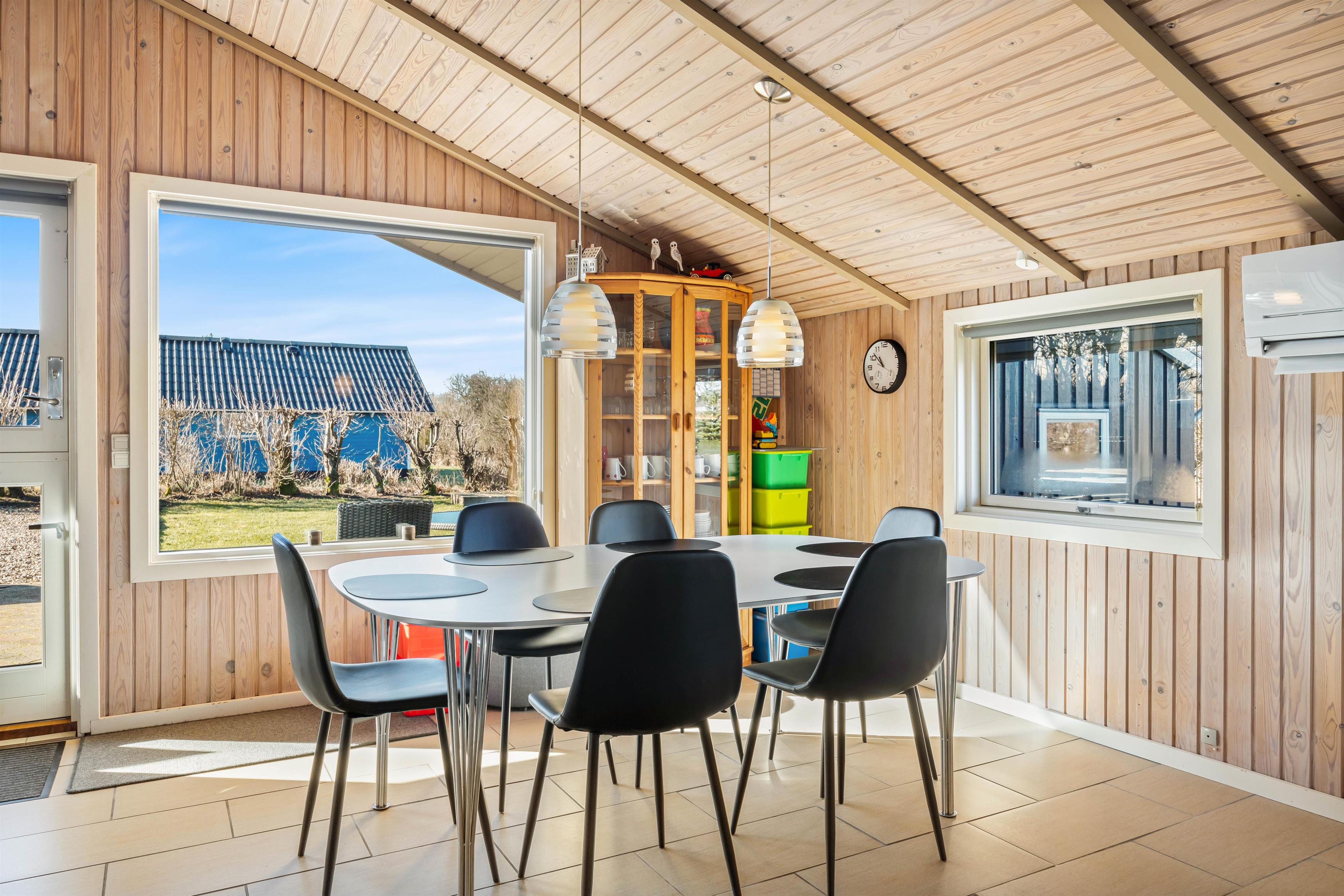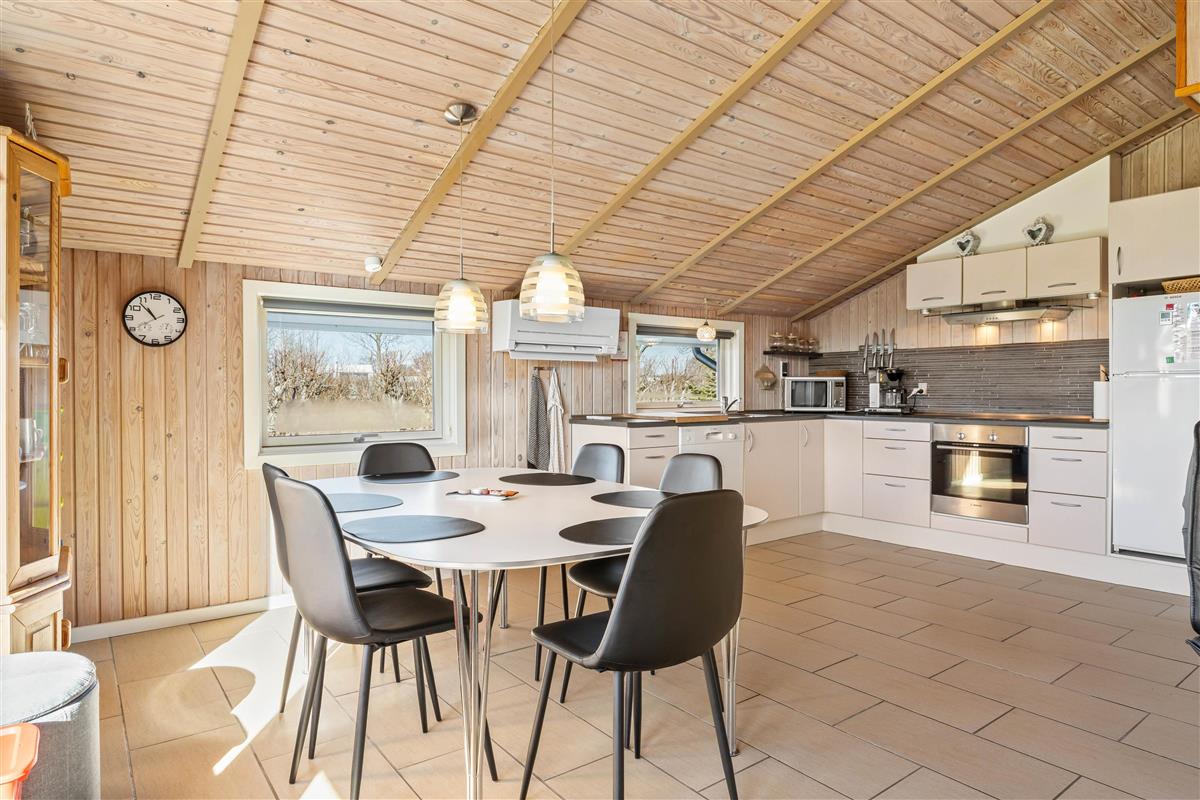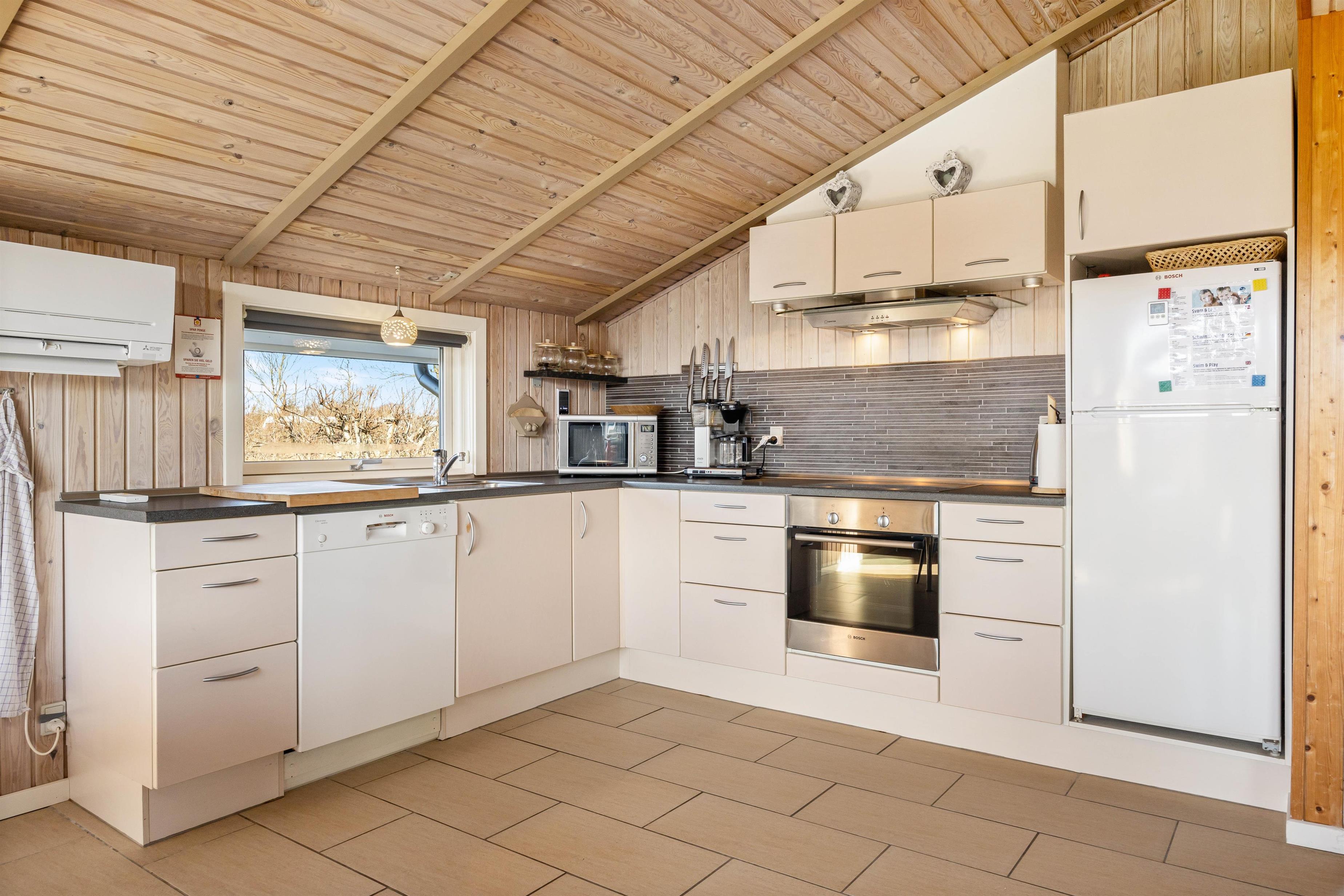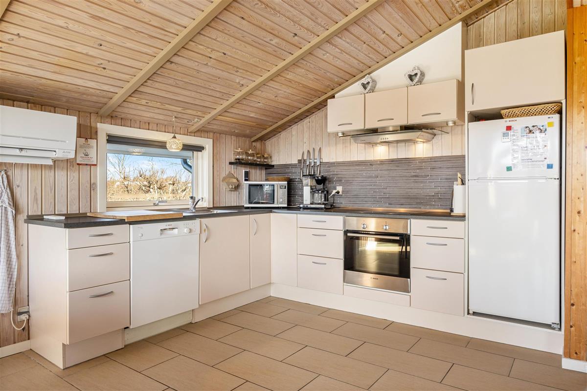 The open-plan kitchen flows seamlessly into the spacious, bright living area, which is equipped with a wood-burning stove and comfortable furniture. An energy-efficient heat pump provides additional comfort. The tiled floor includes underfloor heating throughout. Here you can cook together, watch your favourite shows or plan the next day's adventures.