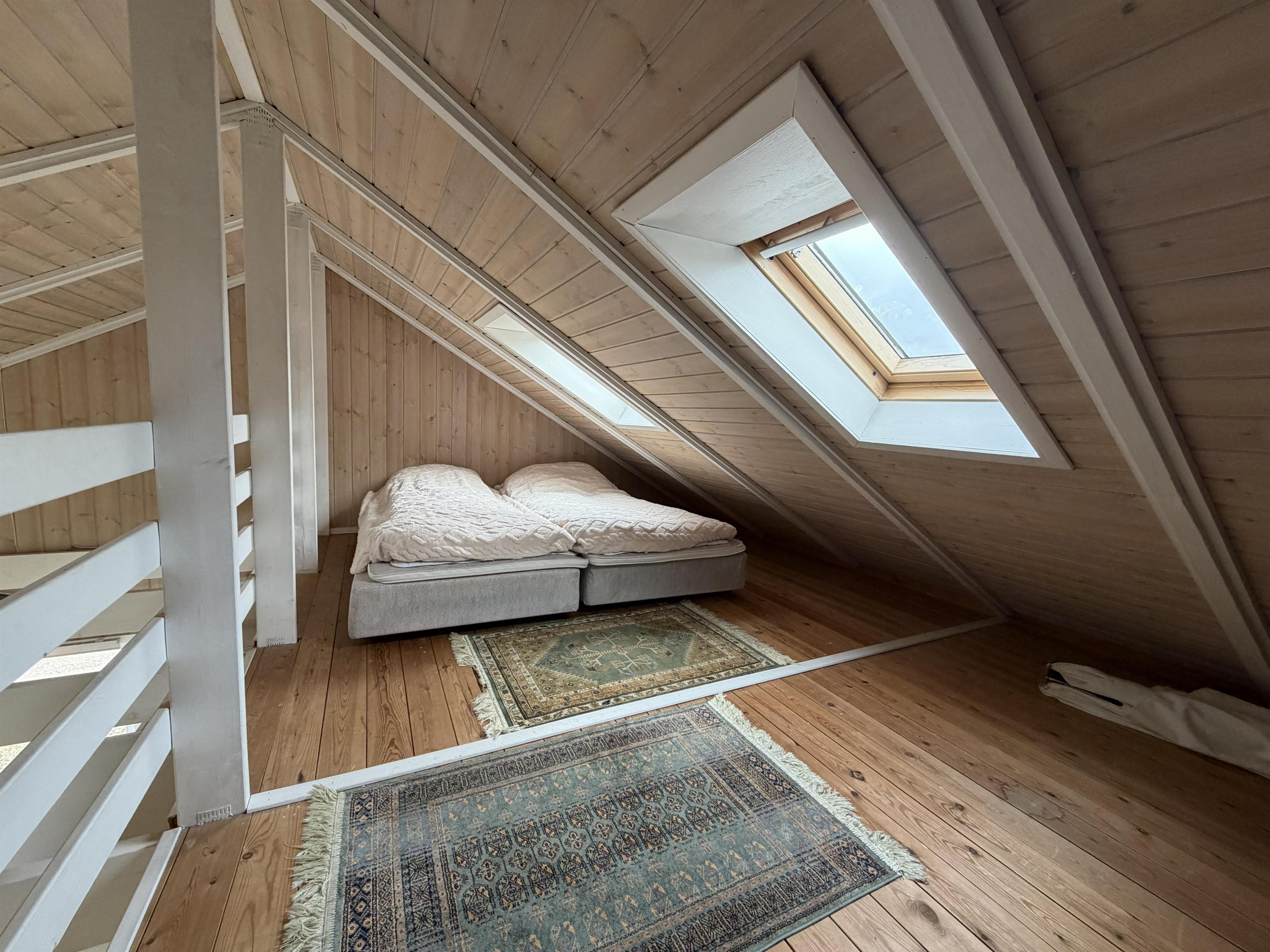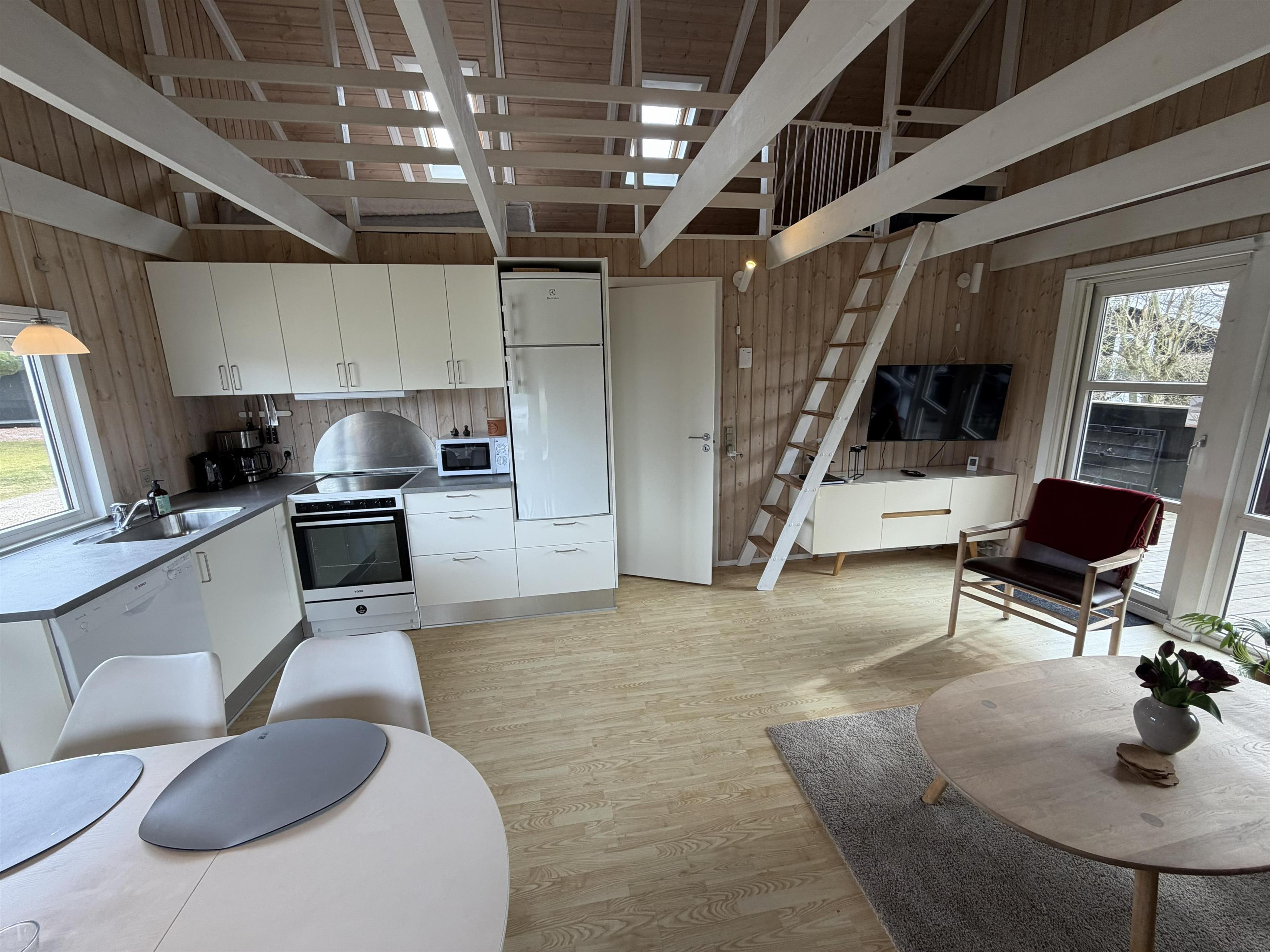 Im Inneren dieses im typisch skandinavischen Stil eingerichteten Ferienhauses erwartet euch ein schöner offener Wohnbereich mit hohen Decken und offenen Dachbalken, der dem Ferienhaus eine luftige, einladende Atmosphäre verleiht. Für gemütliche Abende stehen euch Fernseher und Kaminofen bereit, während eine energiesparende Wärmepumpe das Raumklima effizient unterstützt.