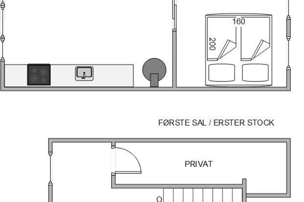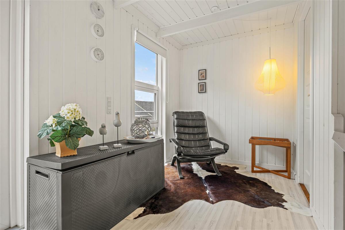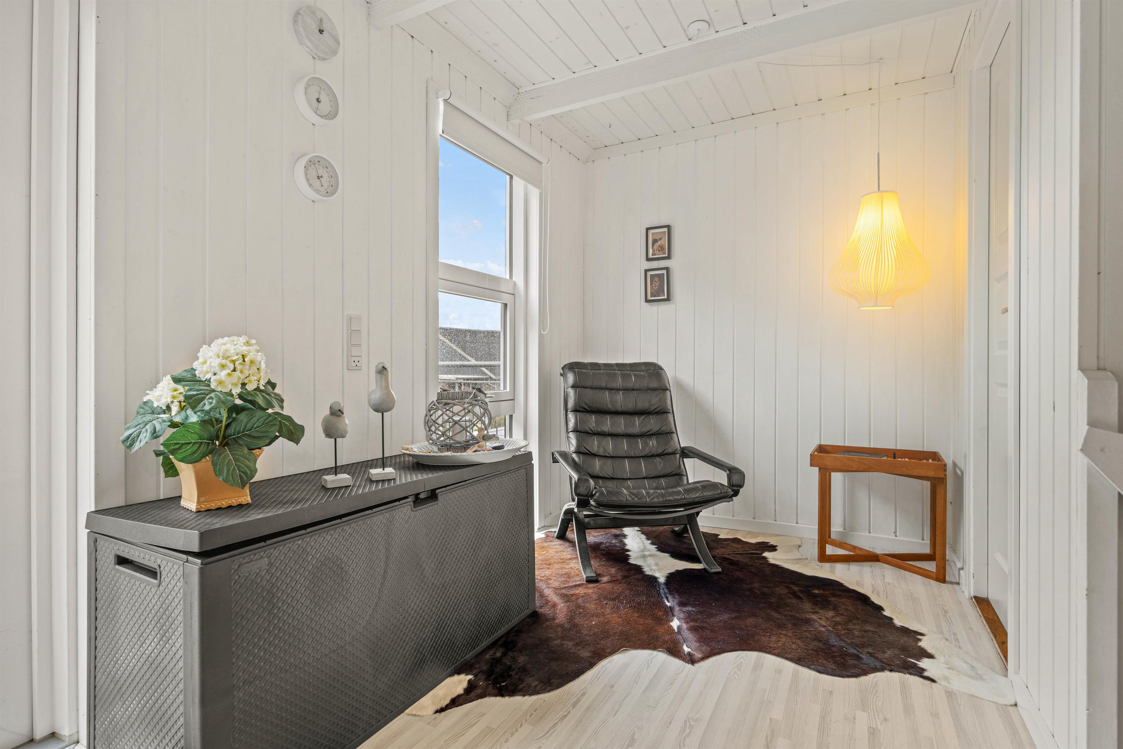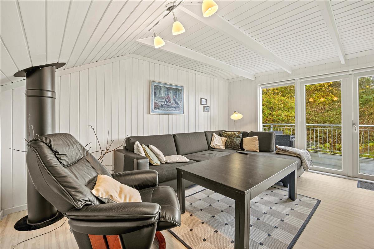 Im Inneren deines Ferienhauses erwartet dich in der oberen Etage ein einladender Wohnbereich, der mit einem Fernseher und bequemen Sitzmöbeln ausgestattet ist und zu Fernsehabenden einlädt. Von hieraus hast du auch Zugang zum Balkon, wo du dich auf Sonnenliegen sonnen und den Blick Richtung Fjord und ins Grüne schweifen lassen kannst.