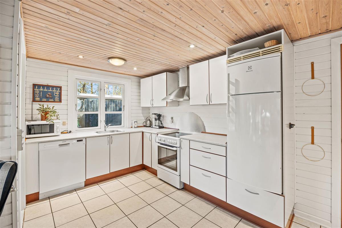 The holiday home features numerous modern conveniences to enhance your stay. The contemporary kitchen includes an integrated dishwasher, making meal preparation and cleanup effortless. The three bedrooms, furnished with two double beds and one bunk bed, provide comfortable sleeping arrangements for everyone. An energy-efficient heat pump and underfloor heating in the bathroom ensure the entire holiday home stays pleasantly warm.