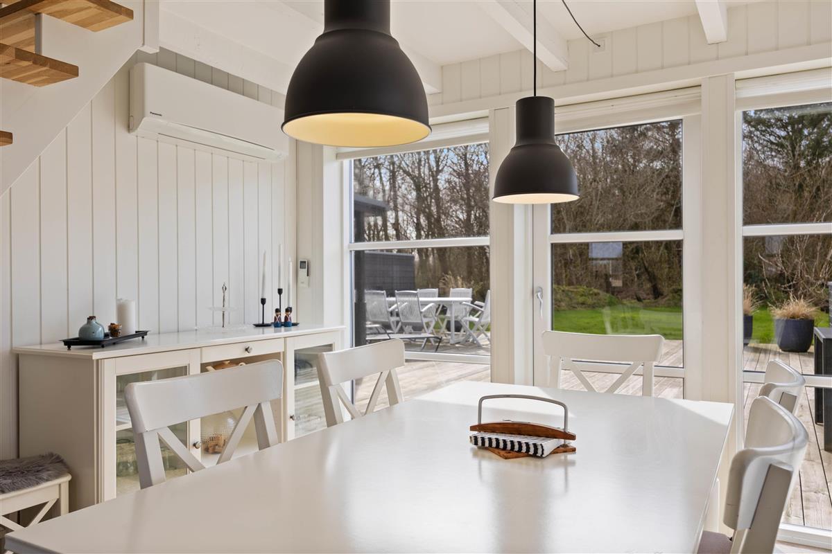 The open-plan, comfortably furnished living space features numerous windows, some reaching from floor to ceiling, providing plenty of natural light. Here you can curl up on the comfortable sofa, watch television, or simply listen to the crackling of the wood-burning stove while taking in the surroundings. A lovely dining table invites sociable evenings with delicious meals prepared in the well-equipped open-plan kitchen. The dishwasher takes care of the cleaning up afterwards.