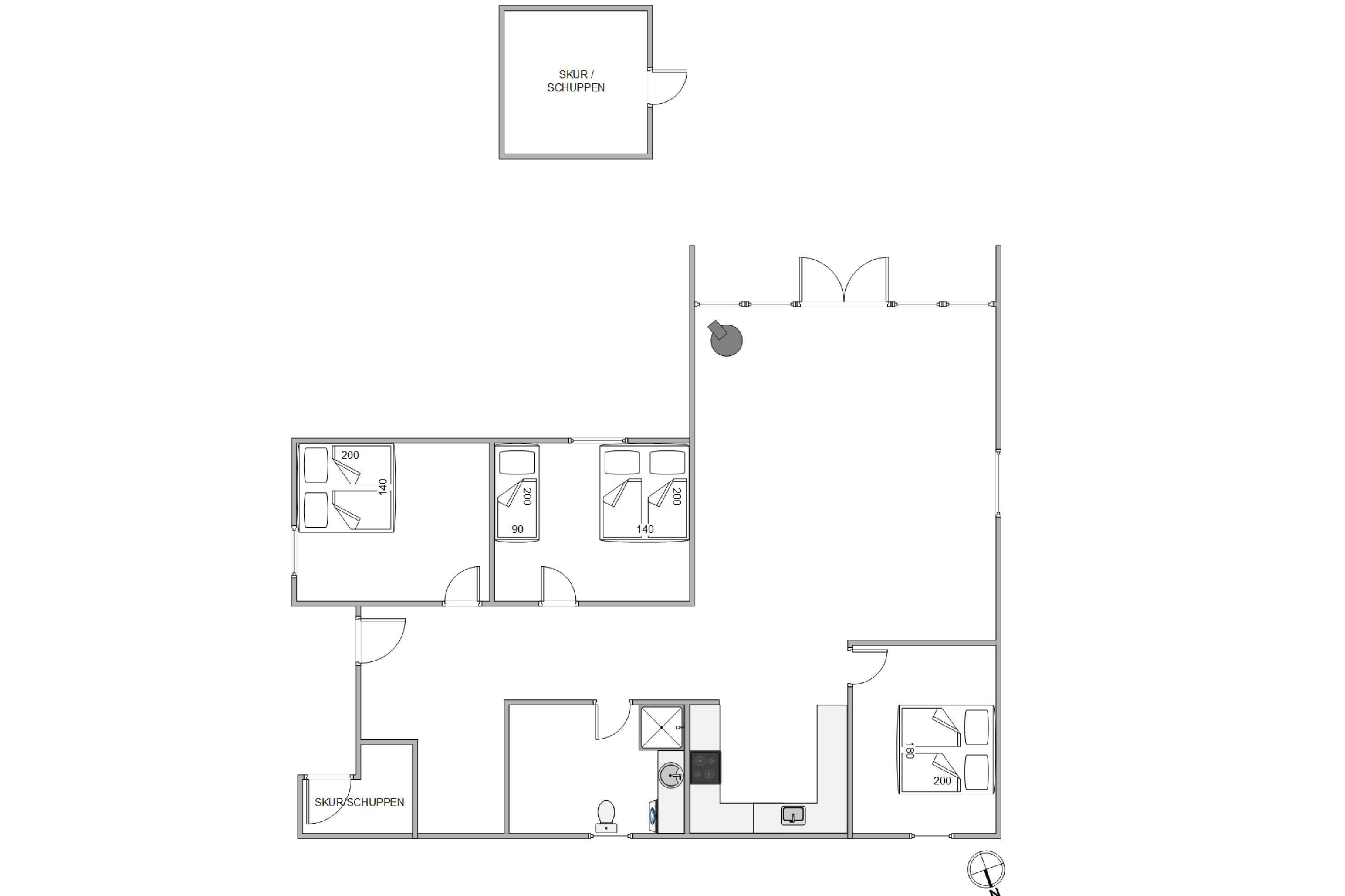 Here you can relax, cook, play and simply enjoy time with your loved ones. The modern kitchen offers everything you need to prepare delicious meals, and the dishwasher takes care of the cleaning up afterwards, giving you more time to enjoy your holiday. The wood-burning stove is the focal point of the living room, providing cosy warmth on cooler evenings. The seating area offers plenty of space for everyone. Whether you want to curl up with a good book or plan a film night using Google Chromecast – everyone will find their favourite spot. The large windows provide plenty of natural light and offer wonderful views of the garden. Underfloor heating in the bathroom ensures a pleasant start to the day. You'll also find a washing machine and tumble dryer – ensuring fresh clothes whenever needed. The three comfortable bedrooms are equipped with cosy beds for a restful sleep. There's one bedroom with a double bed (180x200 cm), and two further bedrooms each with double beds (140x200 cm), one of which also features a single bed (90x200 cm).