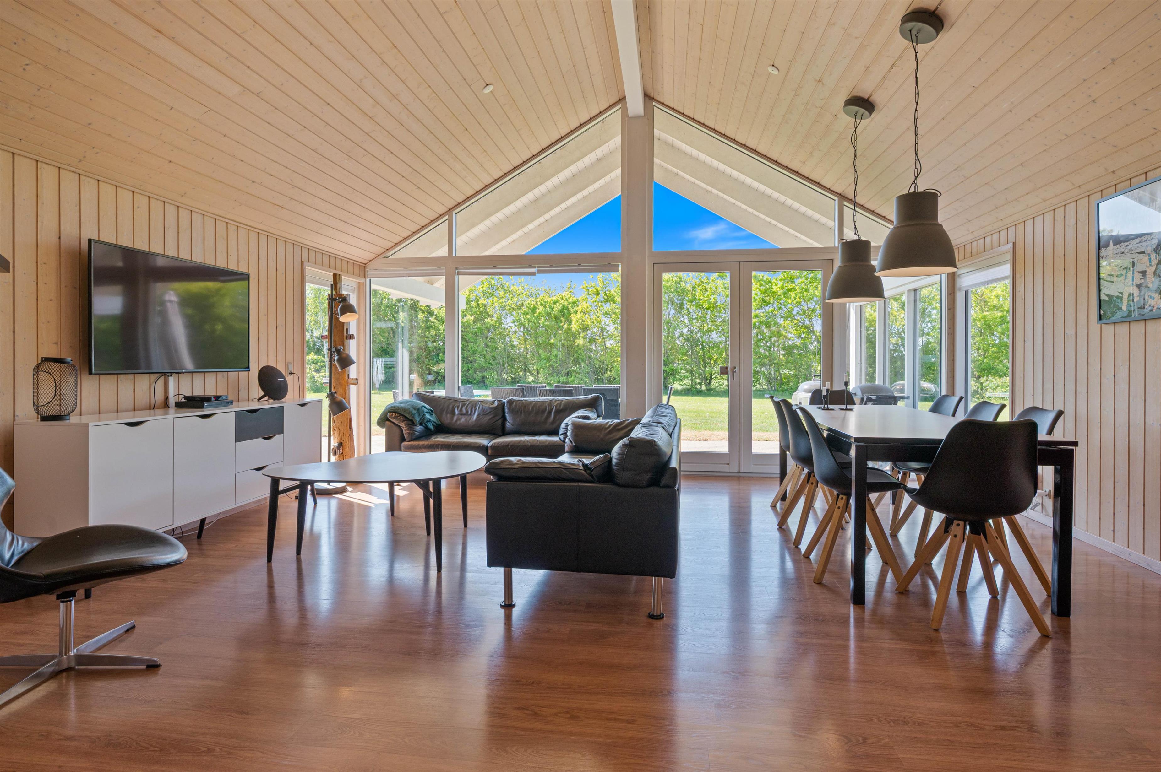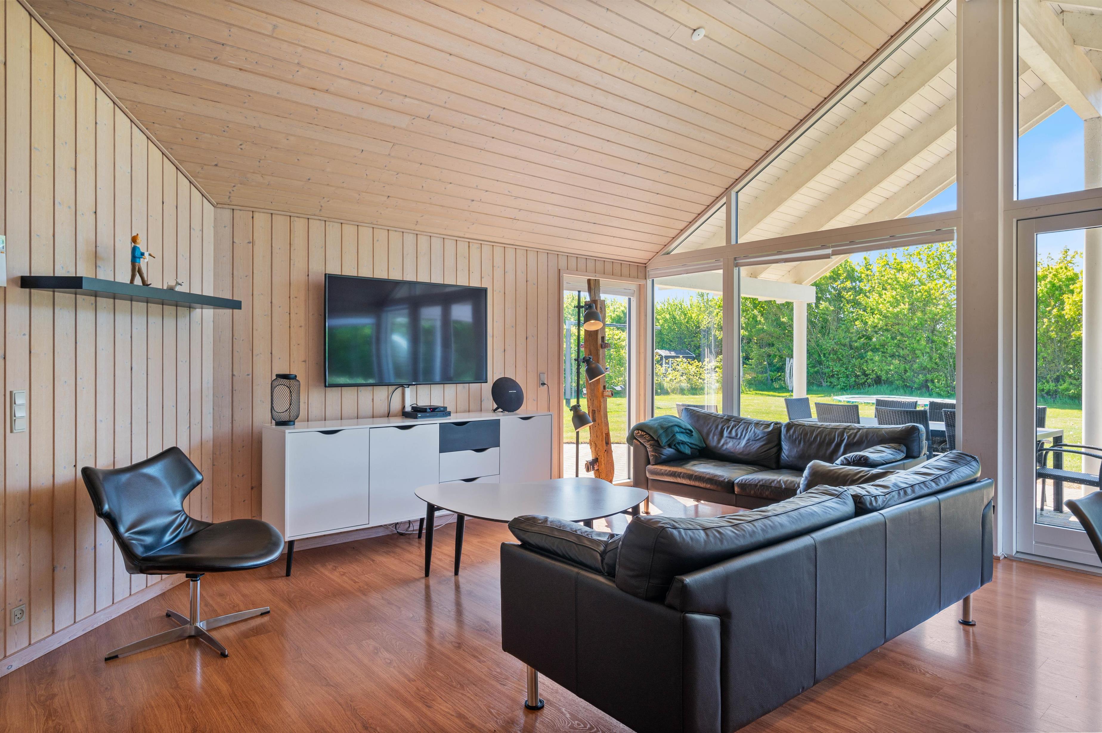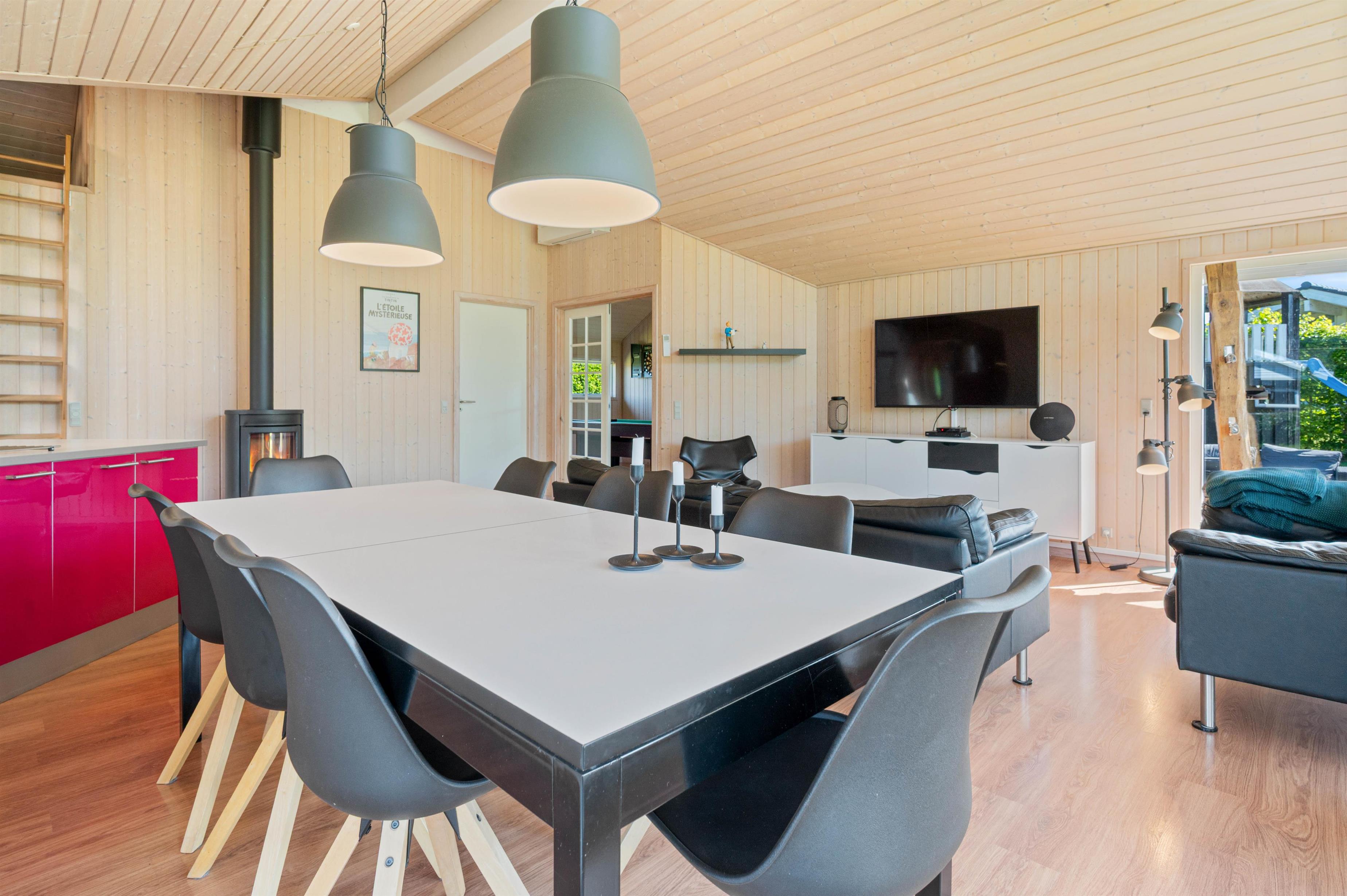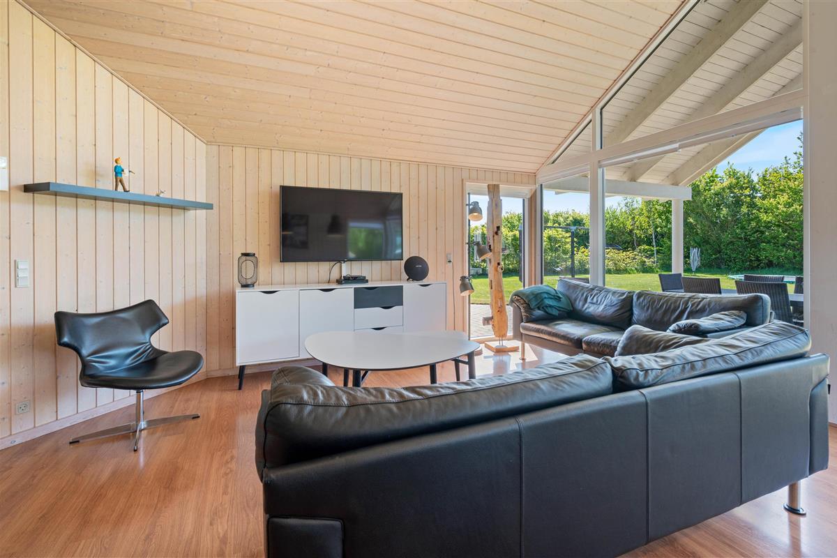 The living area forms the heart of Sydmarken 41. Here you'll find a welcoming space perfect for sociable evenings with family and friends. The crackling wood-burning stove provides pleasant warmth, making the room an especially cosy retreat on cooler days.