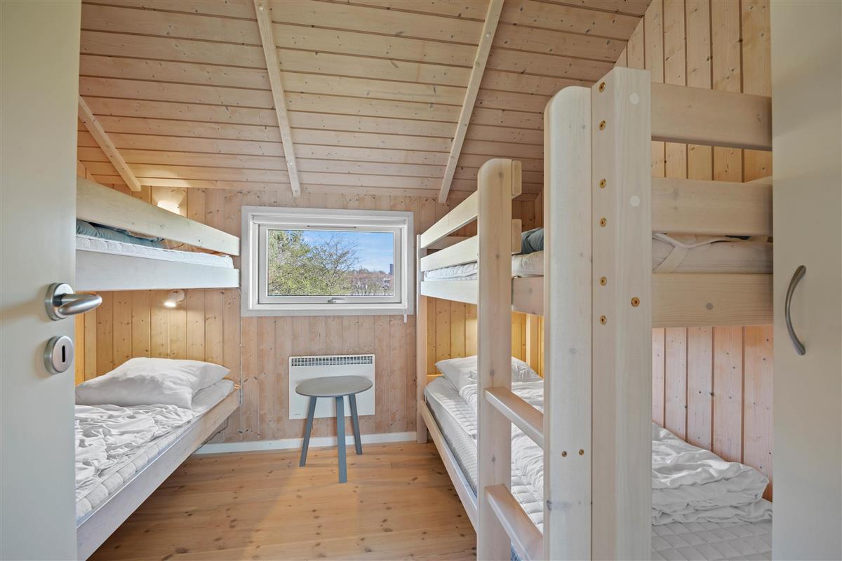 The living room features a cosy nook, perfect as a snug corner where children can retreat. For restful nights, there are two attractive bedrooms with double beds. Children can settle into the inviting kids' room with two bunk beds, guaranteed to provide great fun and adventure.