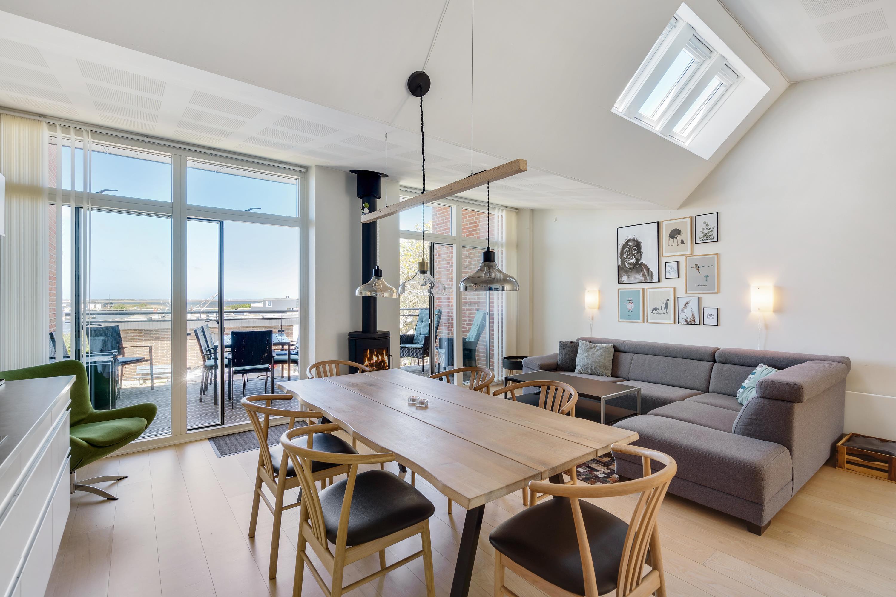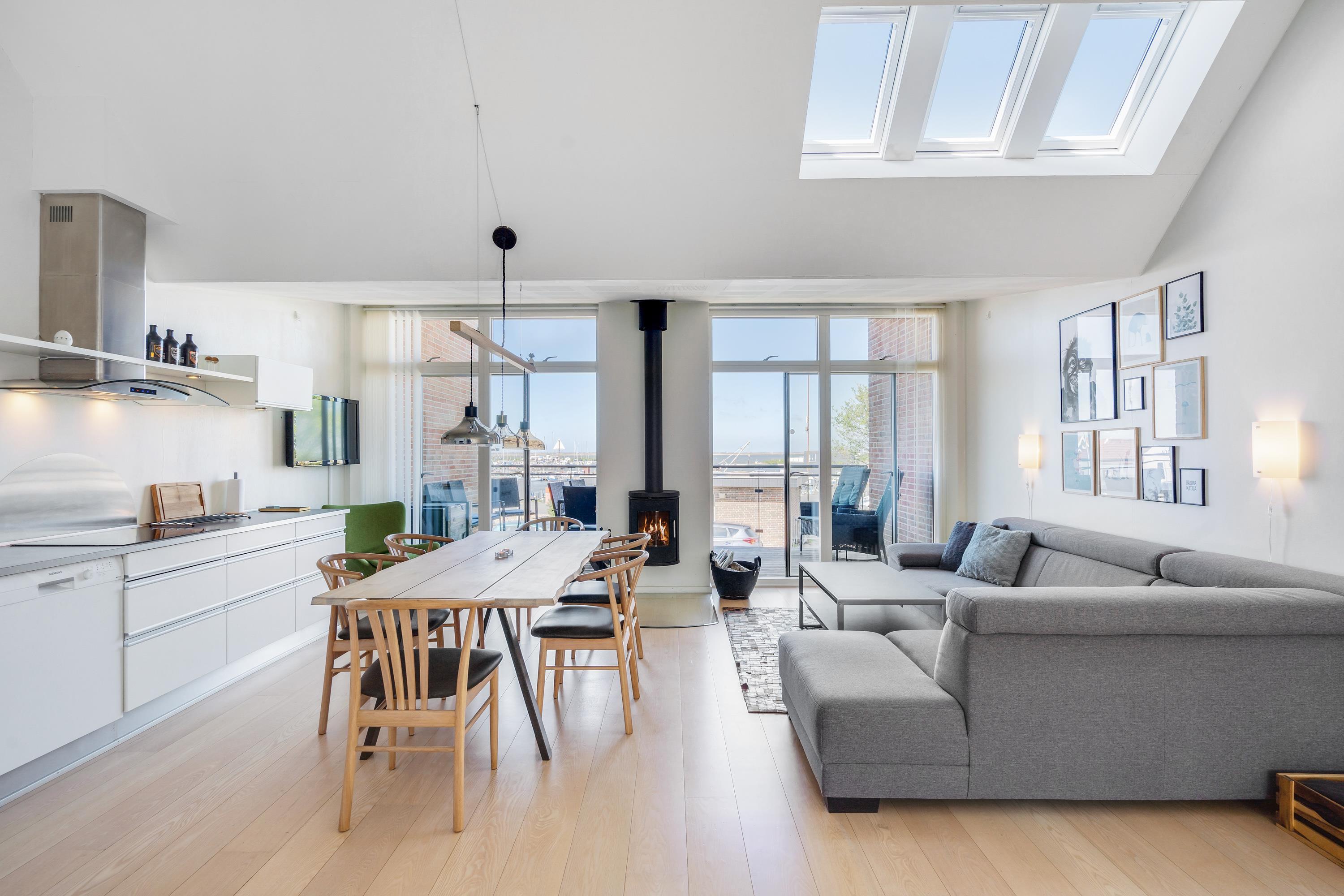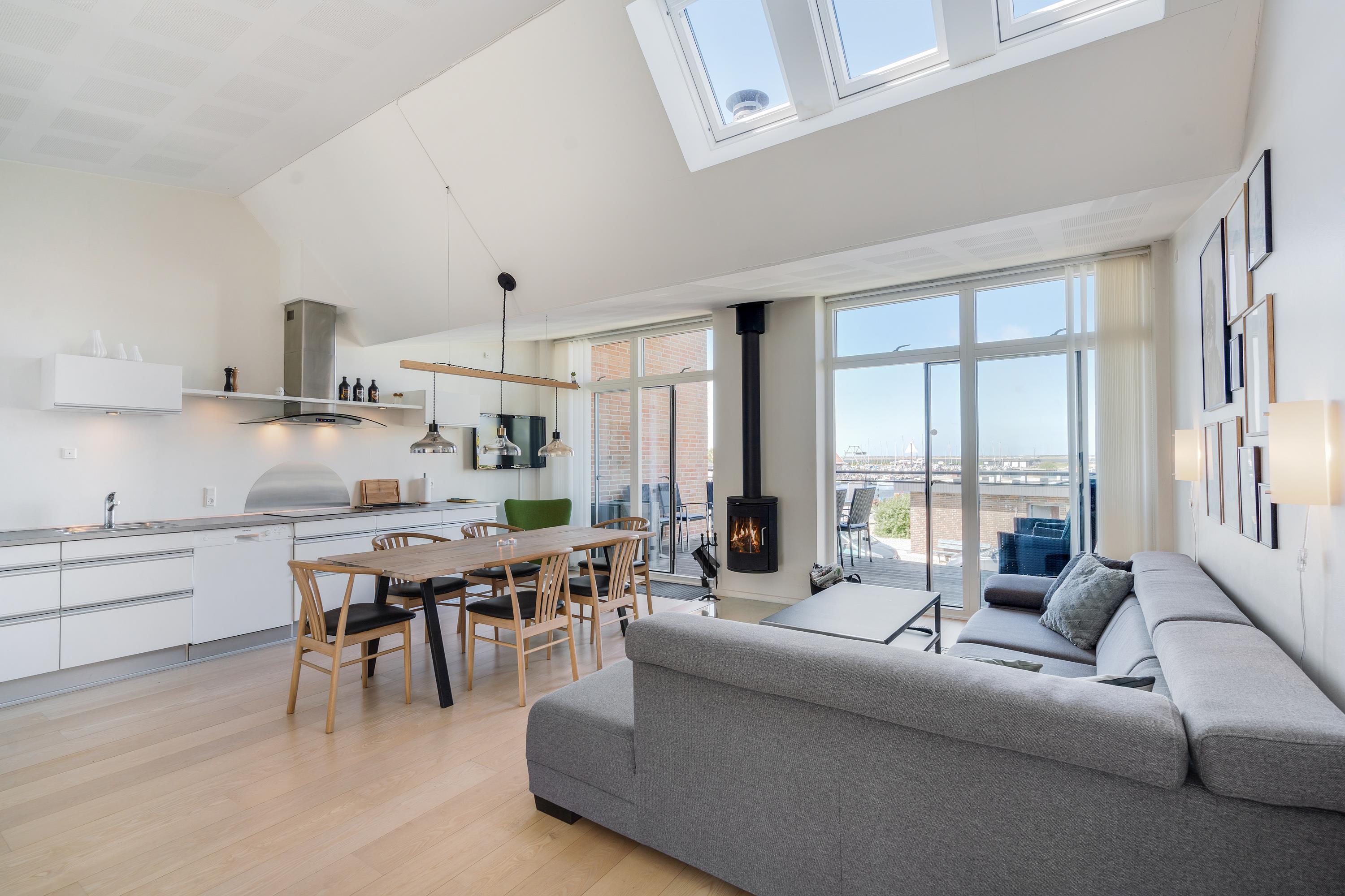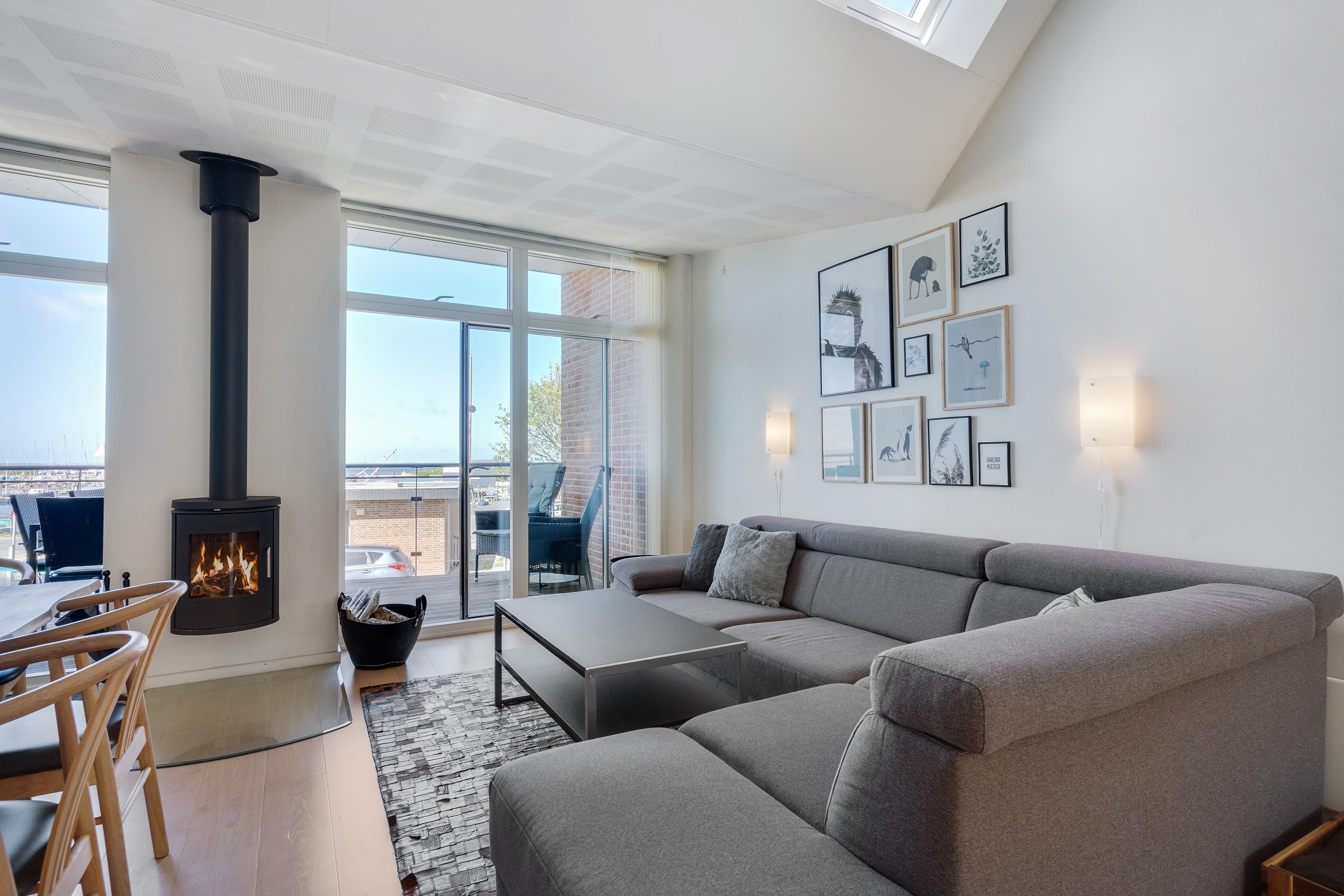 From the living room, which features a wood-burning stove, you can step out onto the lovely balcony. From here, you'll enjoy magnificent views of the small harbour and can watch spectacular sunsets in the evening.