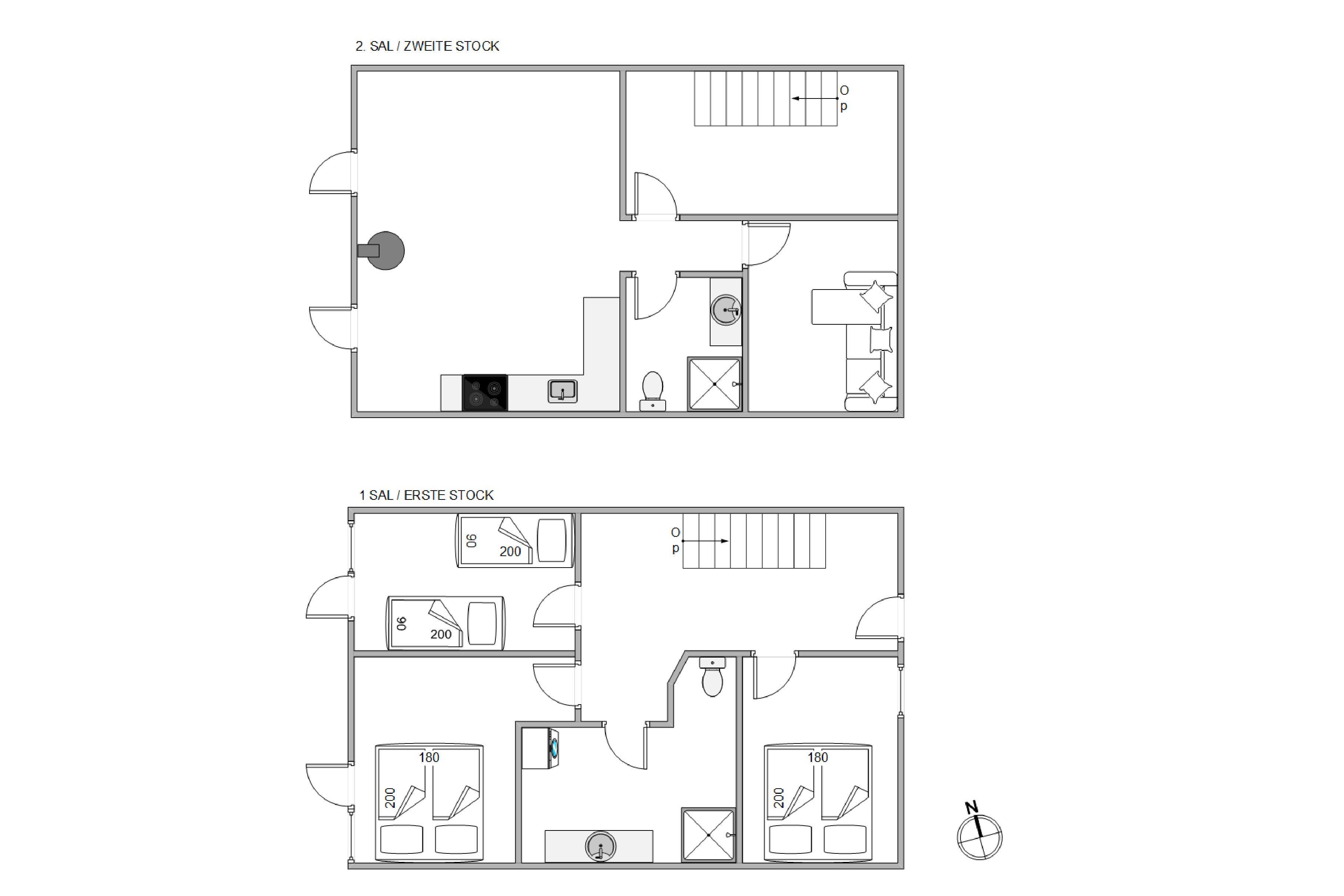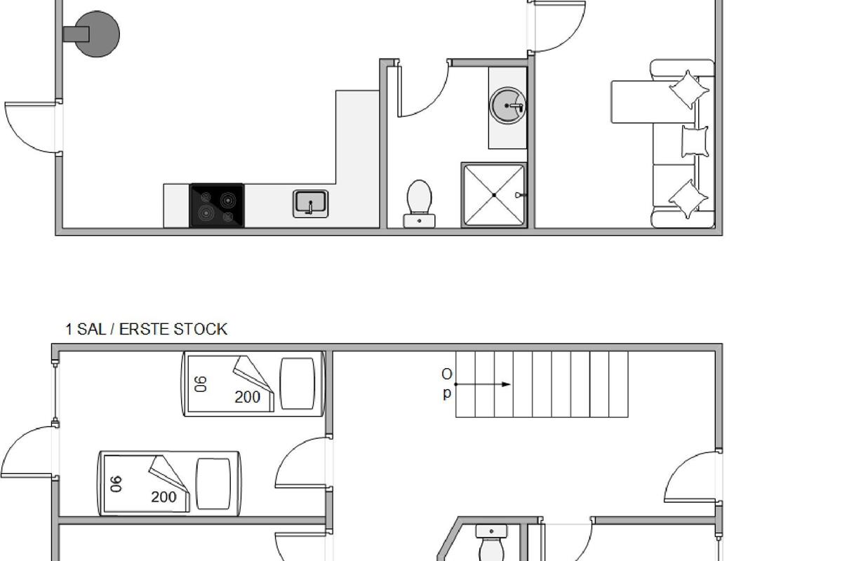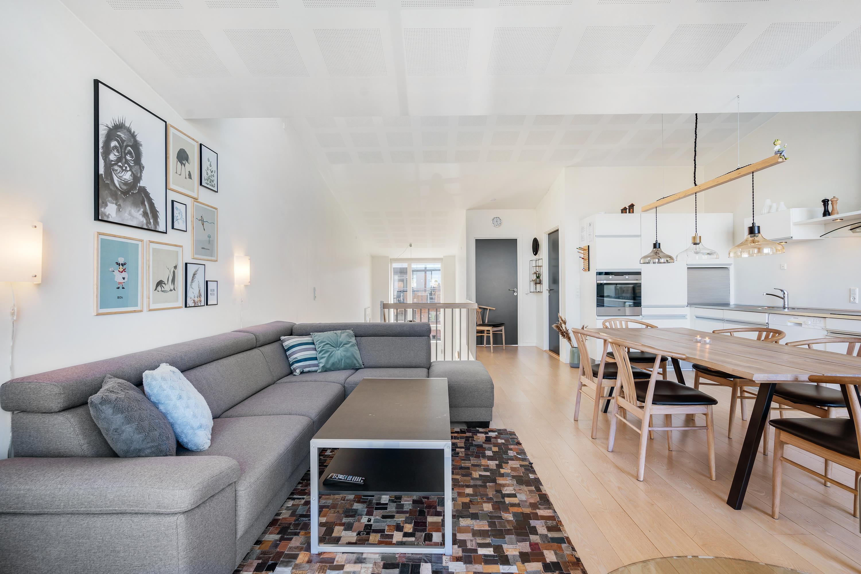 The upper floor, accessed via an open staircase, houses the spacious and bright living area with its beautiful open-plan kitchen. The views towards the fjord from here are fantastic. Skylights allow plenty of additional natural light, giving the holiday home an open and welcoming character.