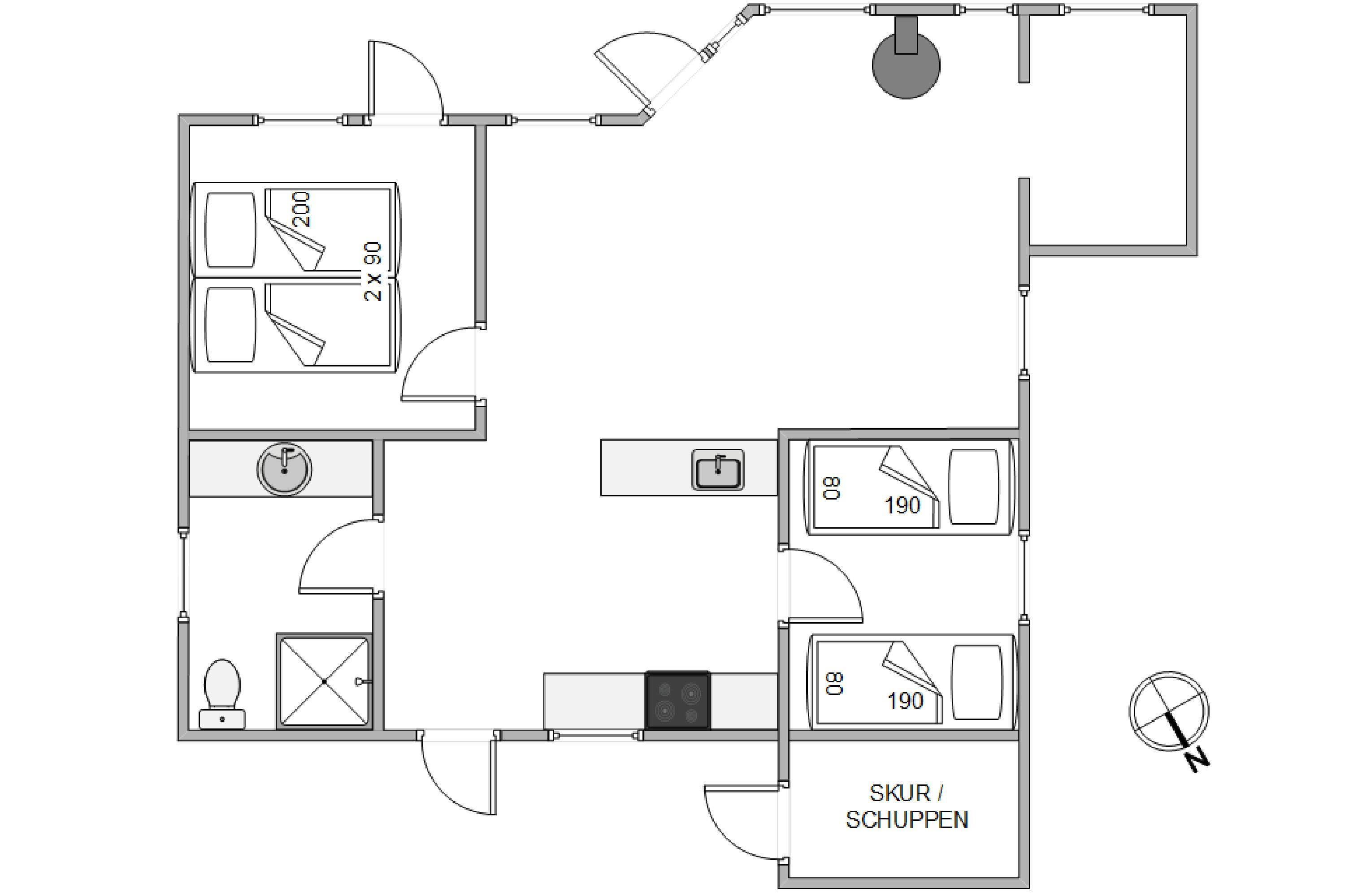 The holiday home offers two bedrooms: one with a double bed and another with two single beds. This layout is ideal for families or small groups looking to enjoy the peace and comfort of a cosy home after an eventful day.