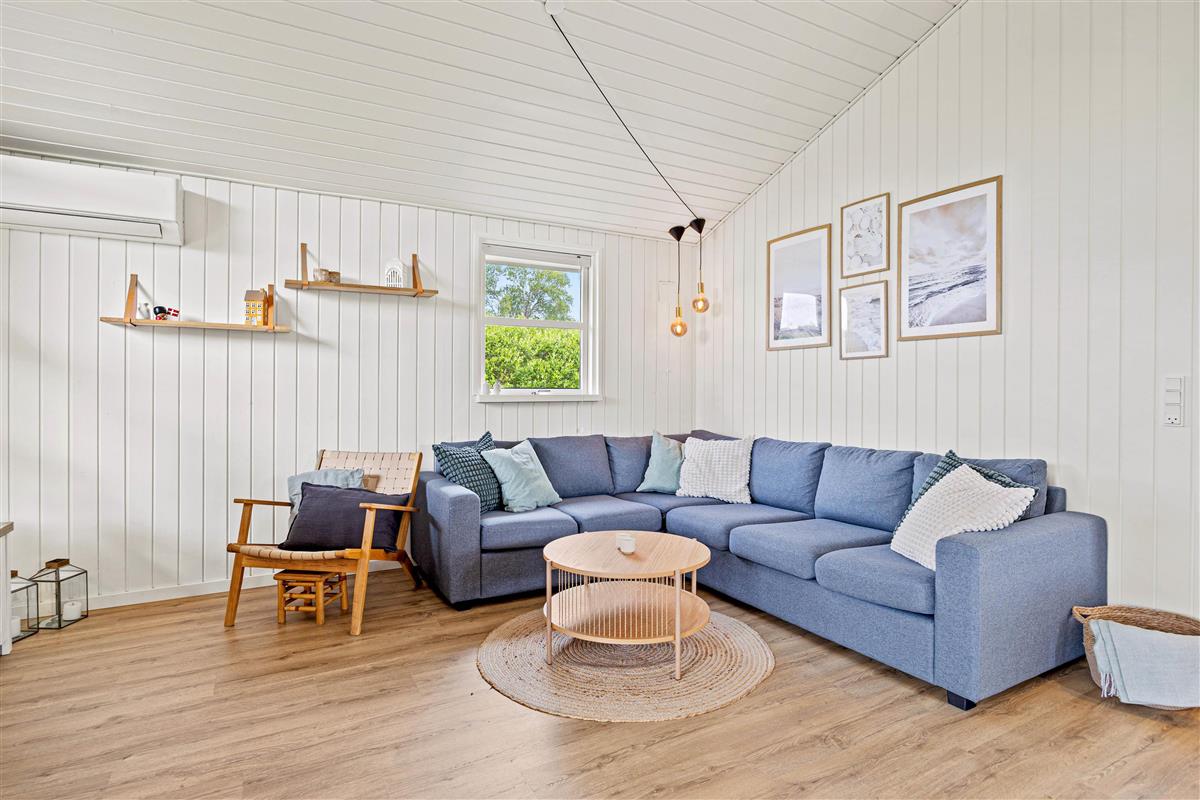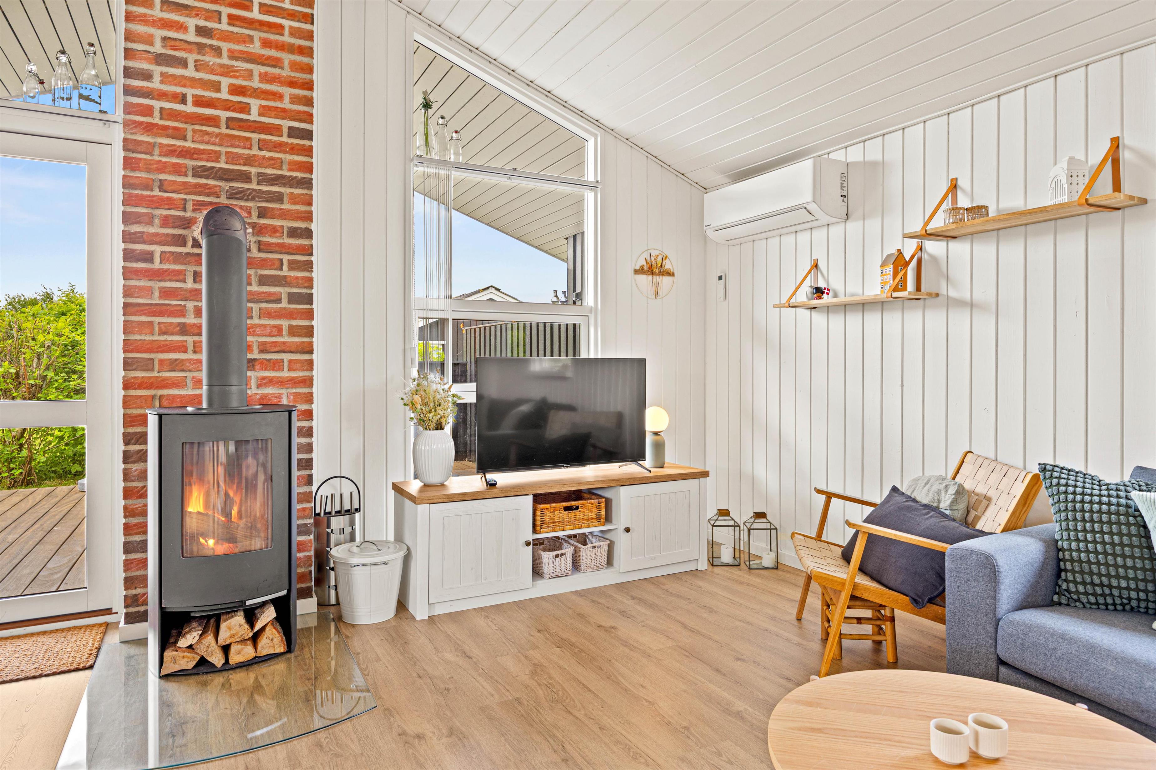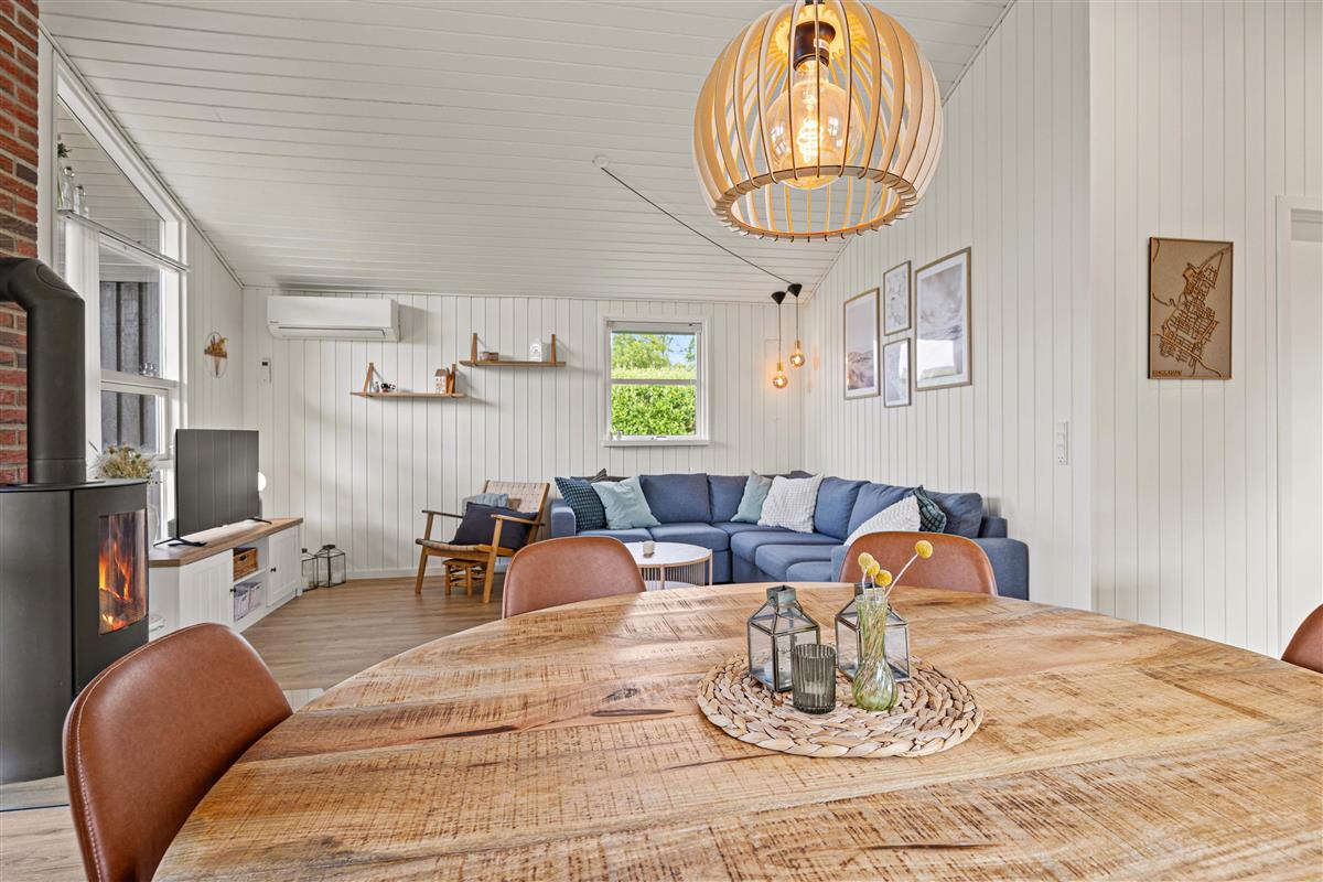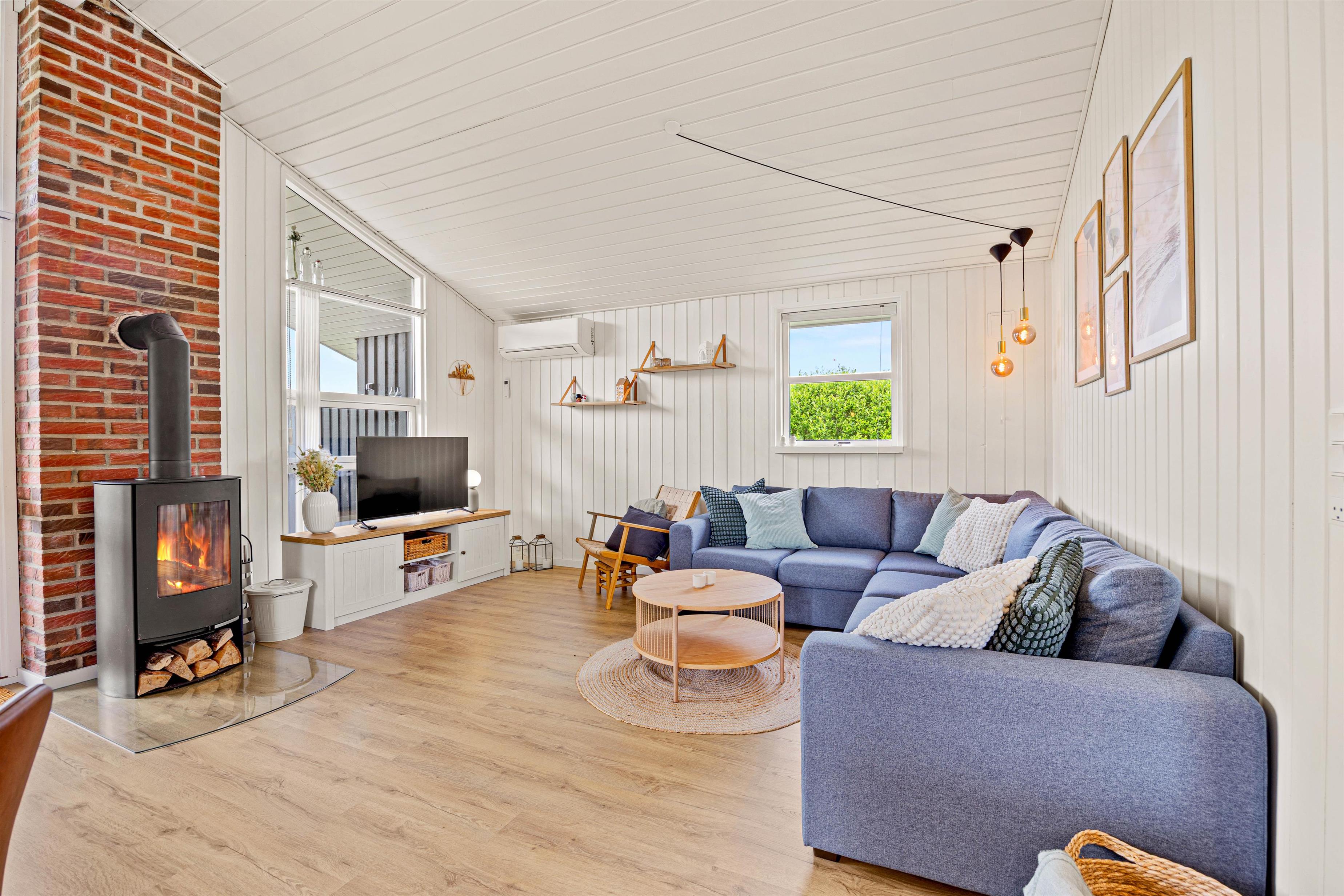 Das Herzstück des Ferienhauses ist der gemütliche Wohnraum, der dank des Holzofens mit Wärme und Atmosphäre erfüllt ist. Außerdem gibt es eine moderne Luft-Luft-Wärmepumpe, die das Ferienhaus schnell und effizient beheizen kann. Das Ferienhaus wurde 2024 renoviert und bietet ein modernes Interieur in typisch skandinavischem Stil. Der offene Wohnbereich umfasst gemütliche Sitzmöbel, auf denen ihr entspannt einen Film mit eurem Chromecast streamen könnt.