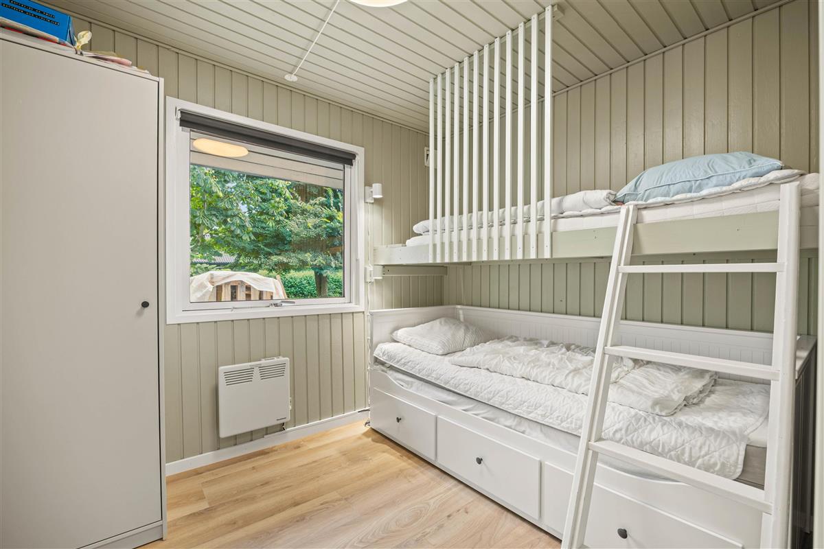 The sleeping arrangements include one room with a double bed, one room with twin beds, and another room with bunk beds - ideal for families with young children. The bathroom features underfloor heating, ensuring comfortable showers without cold feet.