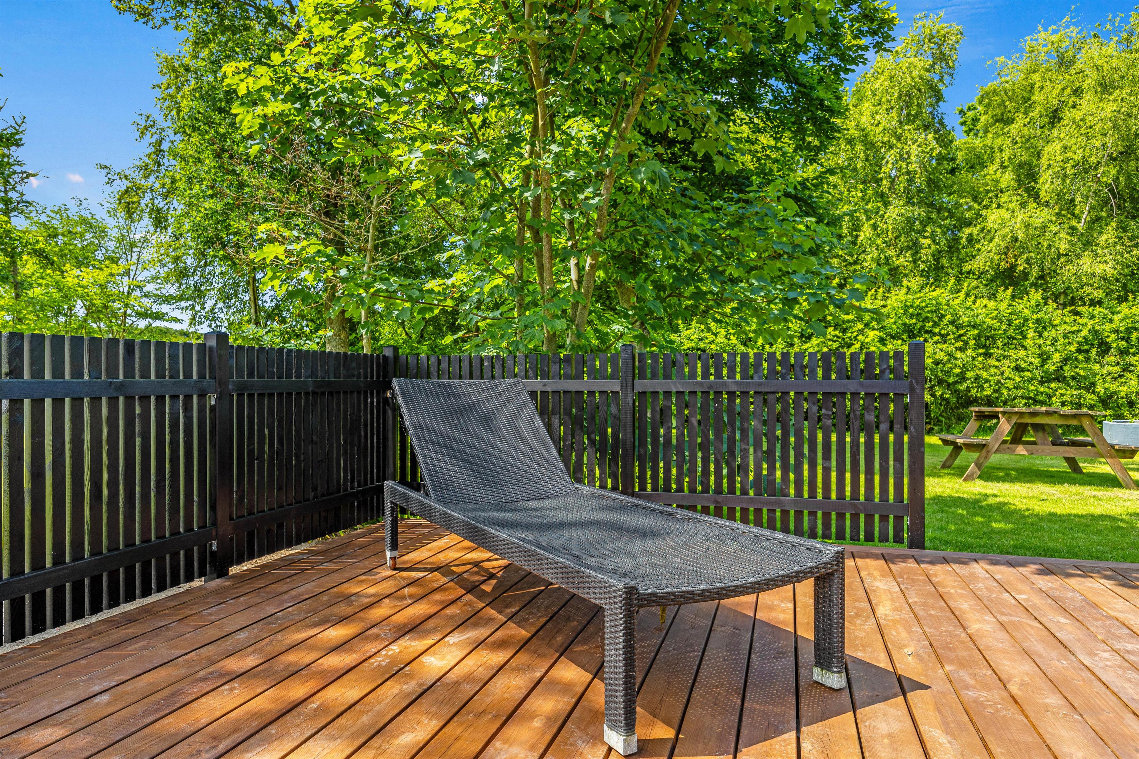 The living room provides direct access to the cosy wooden terrace. Large windows in the living room allow plenty of light, creating a bright, welcoming atmosphere.