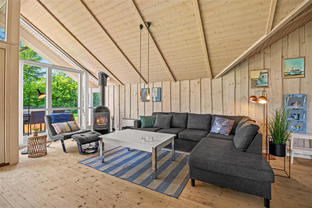 Das Zentrum des Ferienhauses bildet der schöne Wohnbereich mit seinem hellen Holz, gemütlichen Sitzmöbeln und der Fensterfront, durch die ihr den Blick in den Garten genießen könnt. Das Interieur des Ferienhauses strahlt Wärme und Behaglichkeit aus. Freut euch auf entspannte Abende vor dem Fernseher und dem knisternden Kaminofen. Eine energiesparende Wärmepumpe sorgt das ganze Jahr über für das richtige Wohlfühlklima.