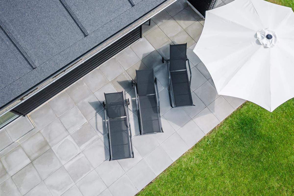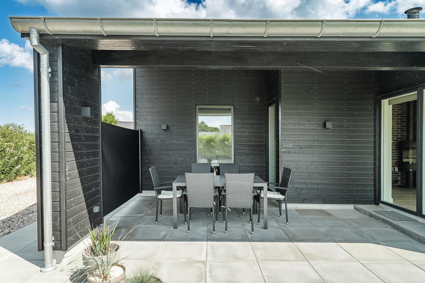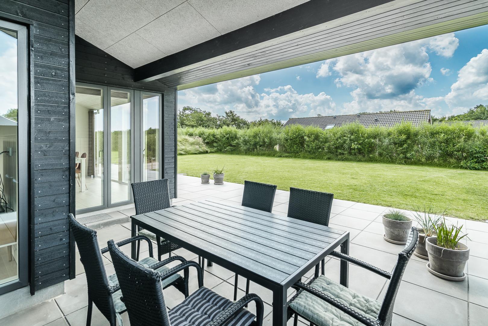 Auf der großen, teilweise überdachten Terrasse könnt ihr den Tag mit einem gemütlichen Frühstück im Freien beginnen oder abends den Sonnenuntergang genießen.