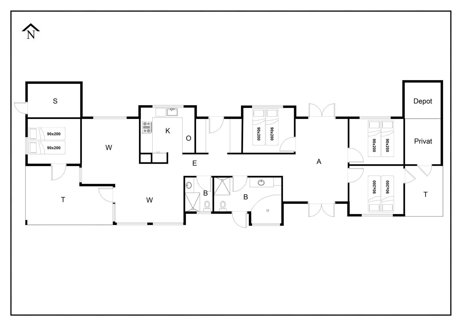 Bettengrösse: 4 Doppelbetten mit je 2 Matratzen á 90 x 200 cm.