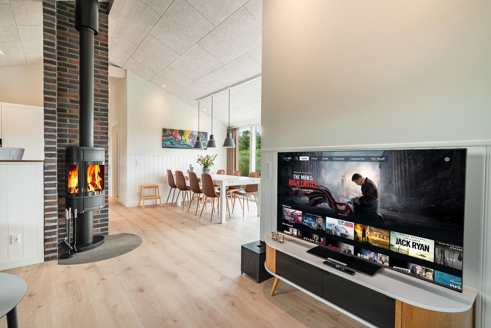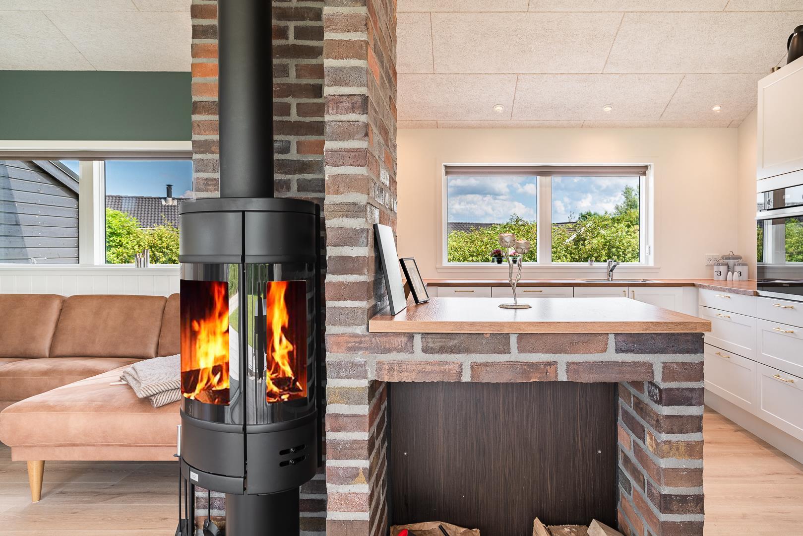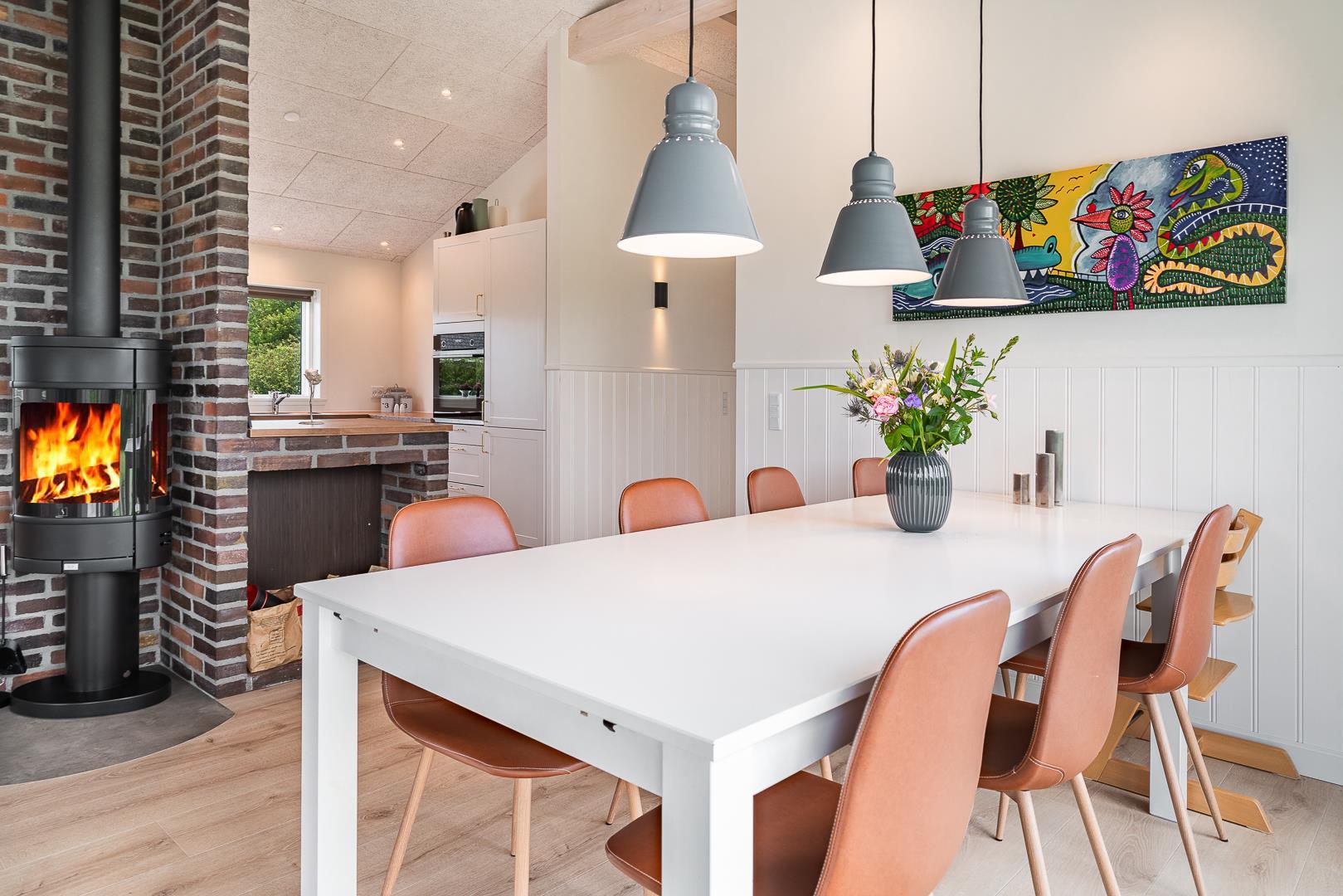 Im hellen, modern eingerichteten Wohnbereich erwartet euch eine gemütliche Atmosphäre mit viel Tageslicht, bequemen Sitzmöbel und einem Kamin, der besonders an kühleren Tagen für wohlige Wärme sorgt. Eine Wärmepumpe ergänzt das angenehme Raumklima effizient und umweltfreundlich. Direkt angrenzend befindet sich die offene Küche, welche mit allem ausgestattet ist, was das Selbstversorgerherz benötigt, inklusive einer Spülmaschine für höchsten Komfort im Alltag. Am großen Esstisch kommen alle zusammen – zum Essen, Spielen oder einfach zum Beisammensein.