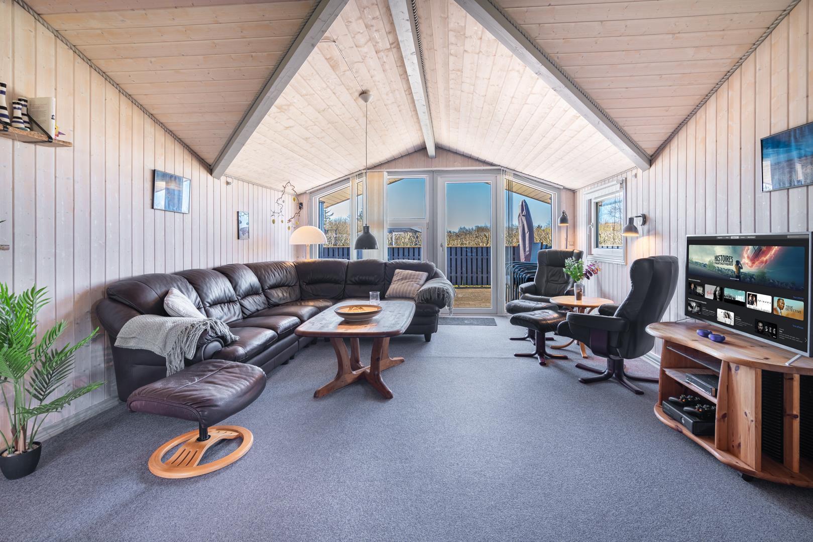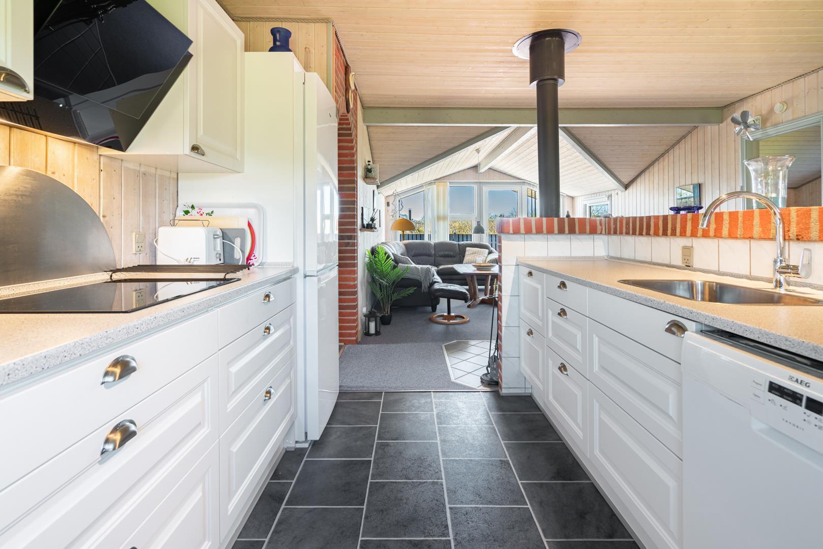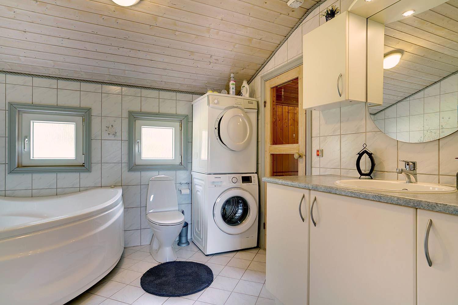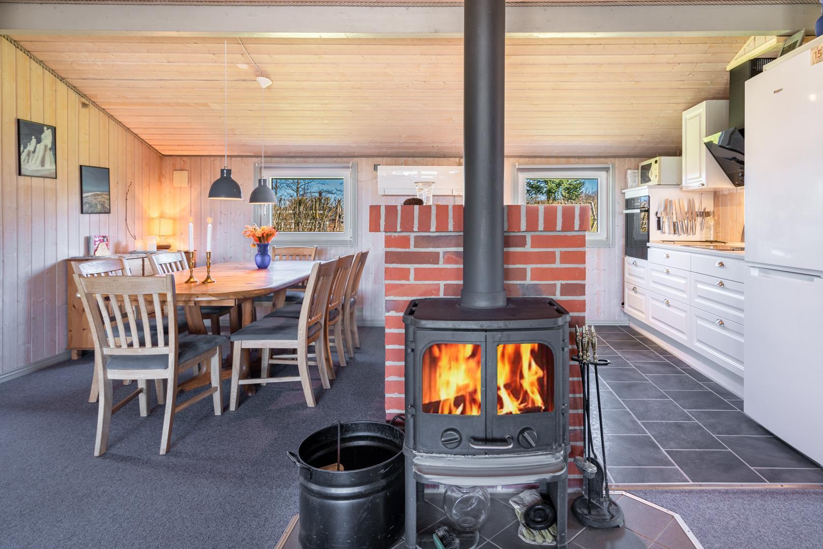 In eurem hellen Wohnzimmer sorgt der Kamin für eine besonders hyggelige Stimmung – ideal nach einem Tag am Strand oder am Fjord. Die Wärmepumpe und die Fußbodenheizung im Badezimmer sorgen ganzjährig für ein angenehmes Raumklima.
