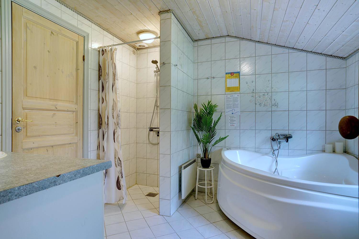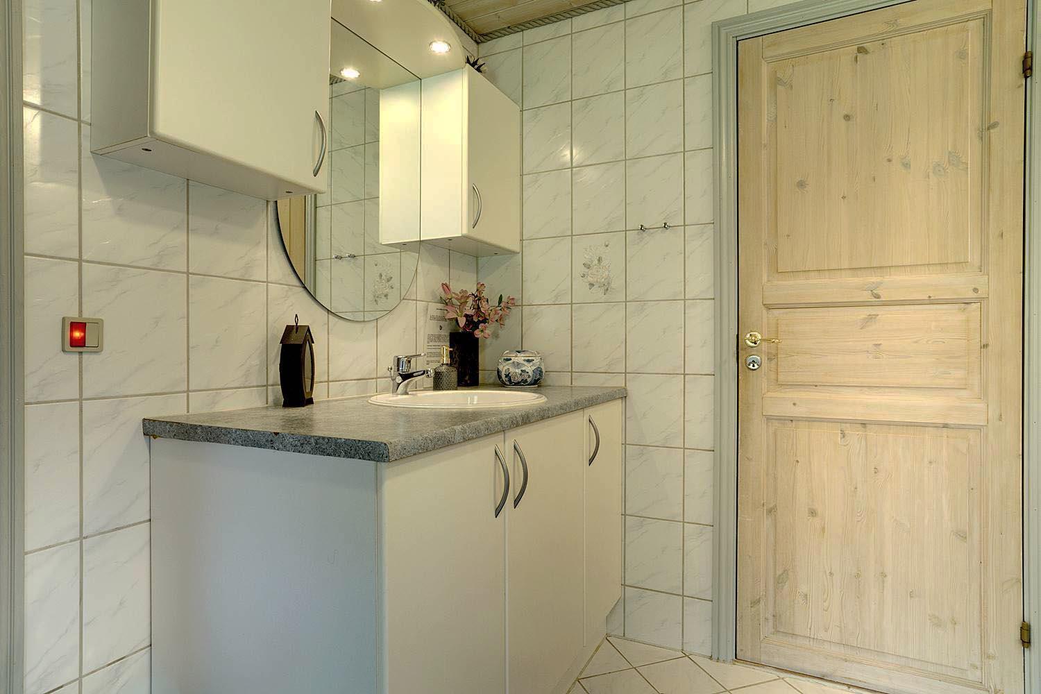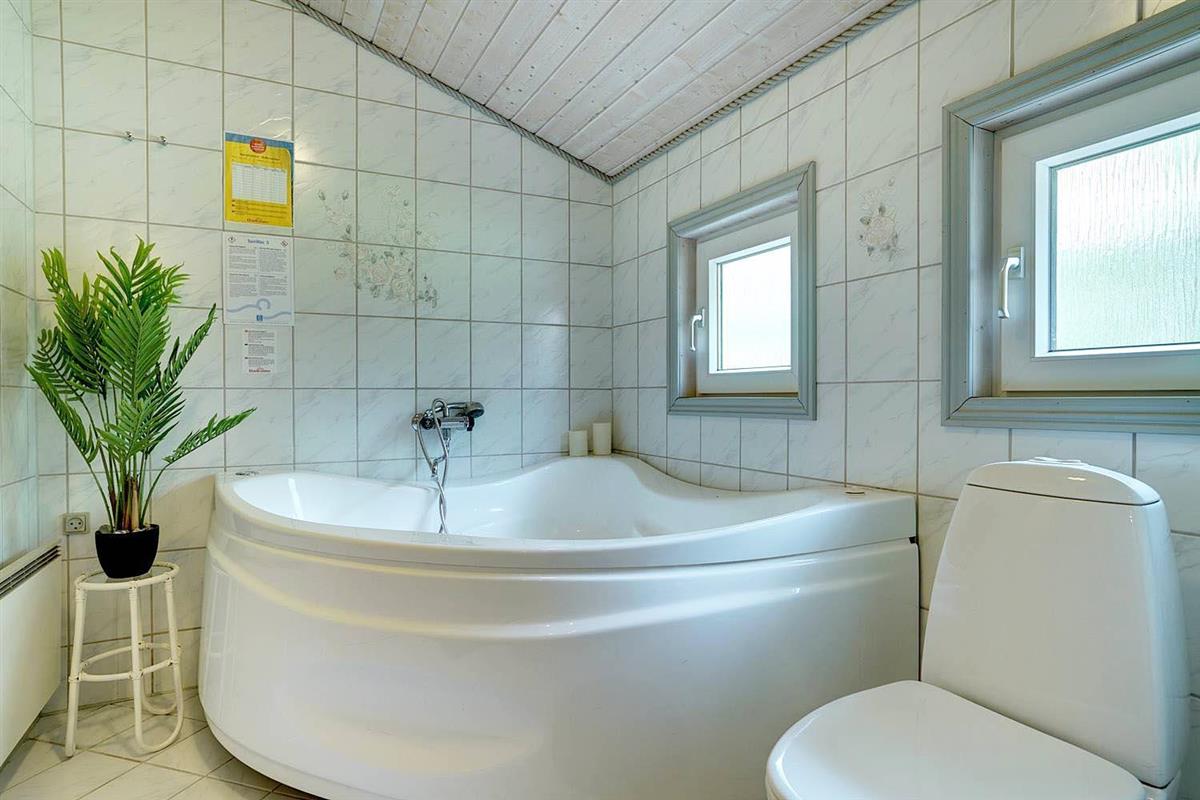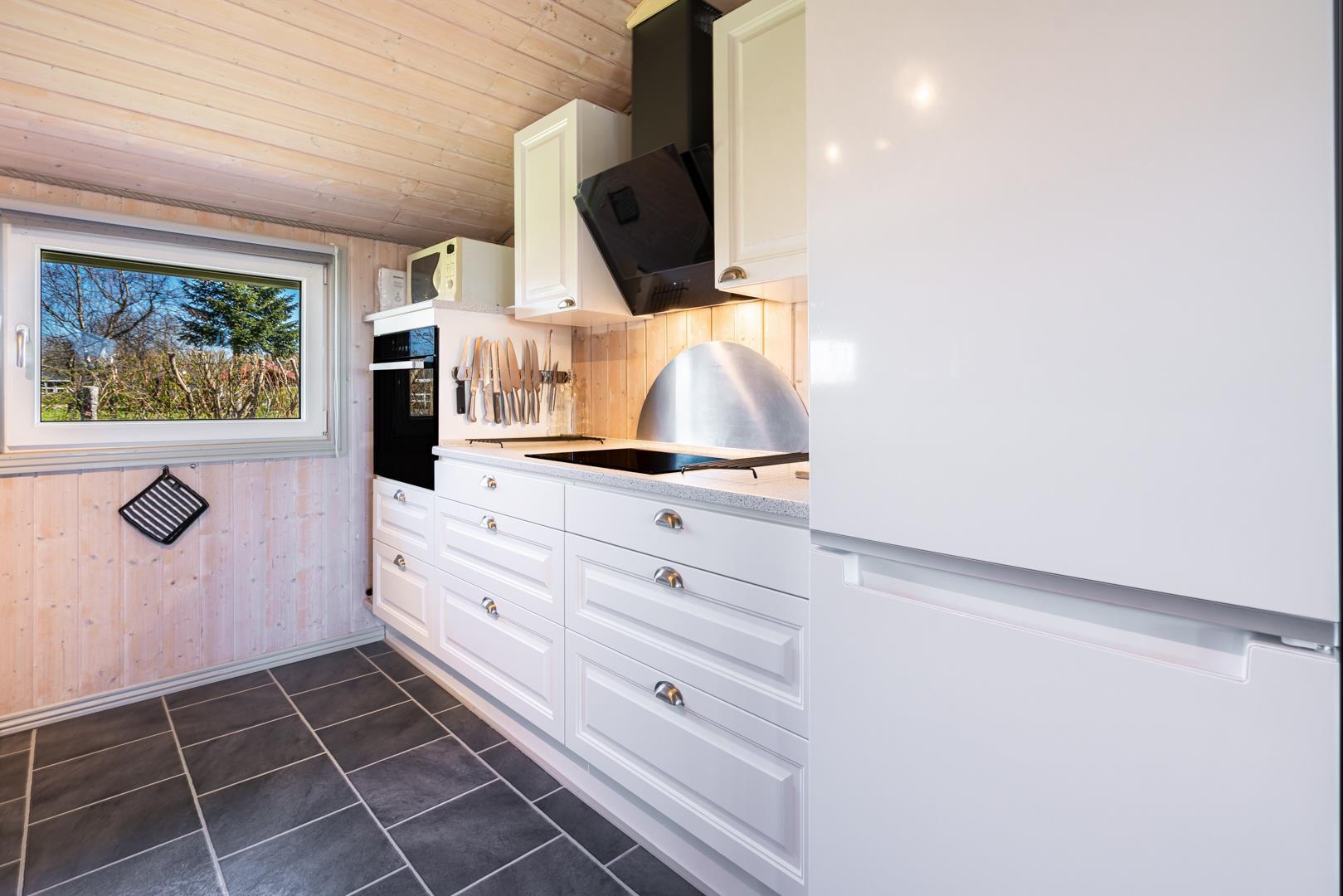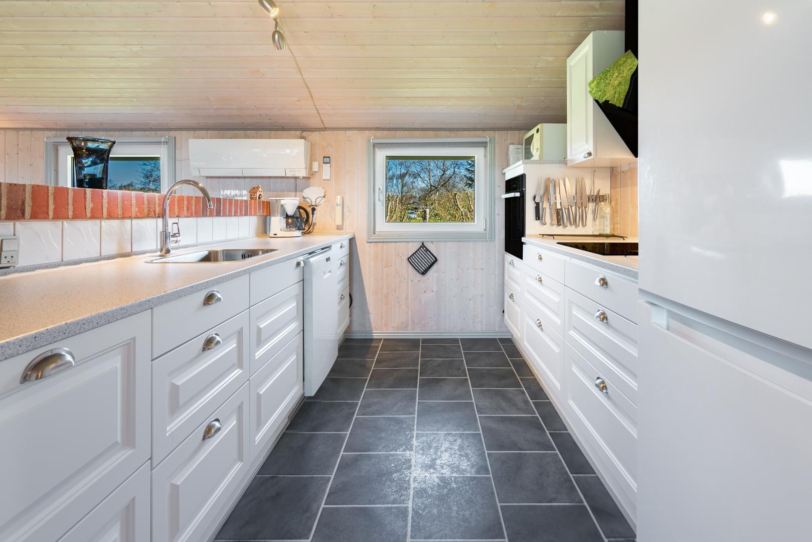 In eurem hellen Wohnzimmer sorgt der Kamin für eine besonders hyggelige Stimmung – ideal nach einem Tag am Strand oder am Fjord. Die Wärmepumpe und die Fußbodenheizung im Badezimmer sorgen ganzjährig für ein angenehmes Raumklima.