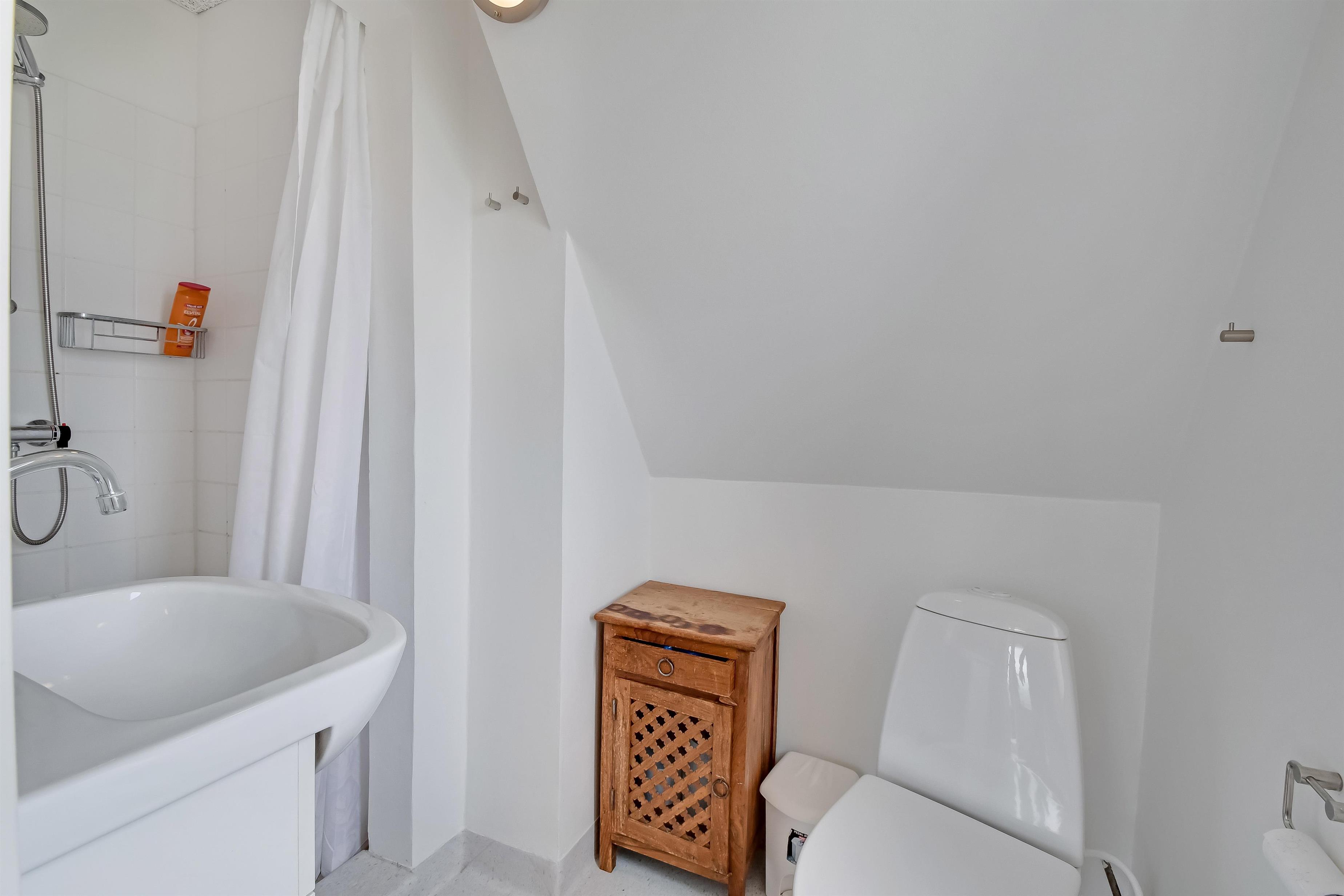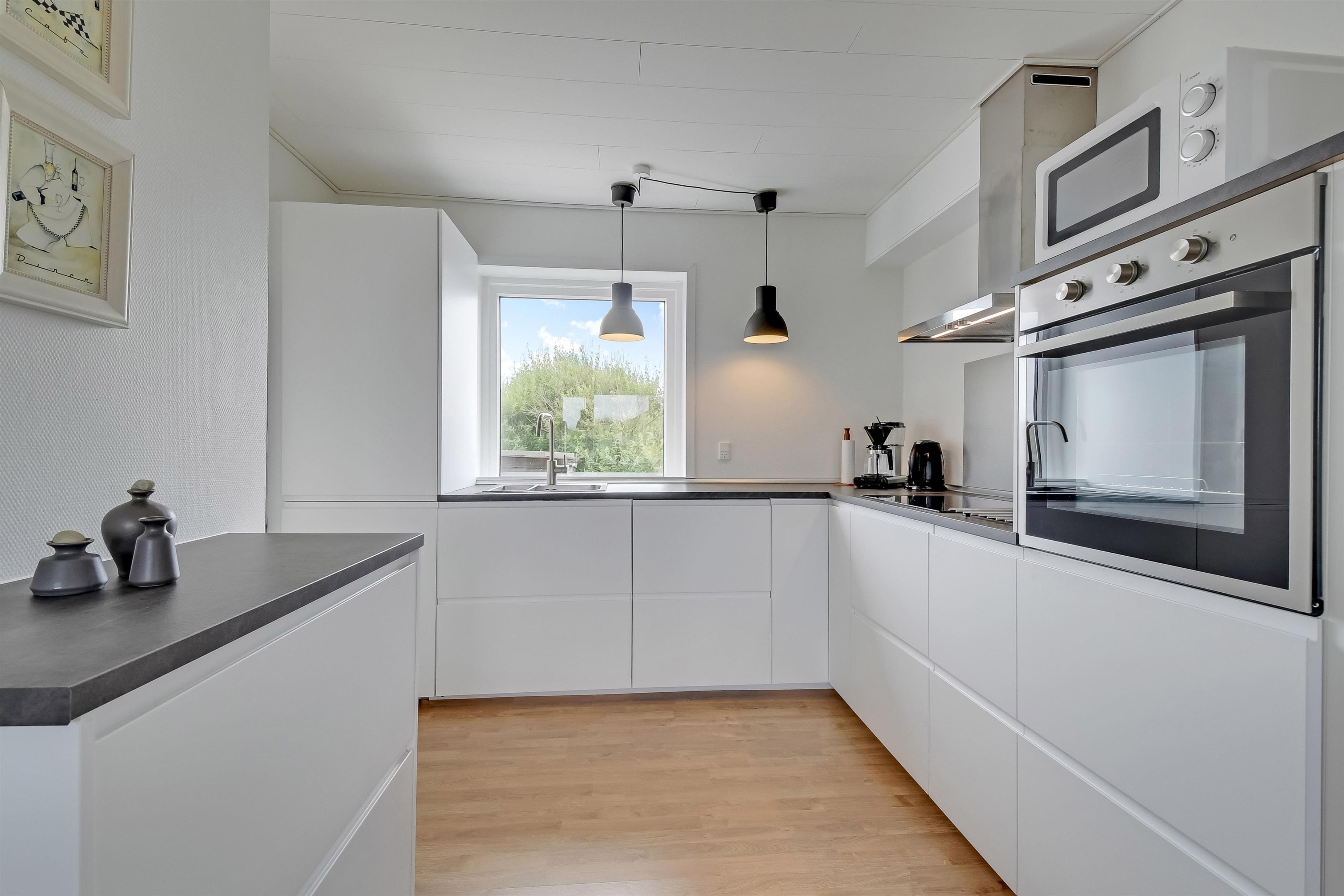 Schönes 2 stöckiges Ferienhaus auf etwa 100 m2 mit 2 Schlafräumen: 1DB + 1DB. Machen Sie die Tür auf zum kleinen Flur, von hier ist ein Zugang zum Badezimmer mit Toilette, Dusche und Waschbecken. Vom Flur geht es in die schöne Küchenecke mit Herd mit Cerankochfeld, eingebautem Ofen, Mikrowelle, Abzugshaube und Kühlschrank mit Gefrierfach und Geschirrspüler. Von der Küche ist ein direkter Zugang zum gemütlichen Wohnraum mit Esstisch, Polstermöbeln und Kaminofen, der für eine gemütliche Wärme sorgt. Im Parterre gibt es einen Schlafraum mit 1DB.