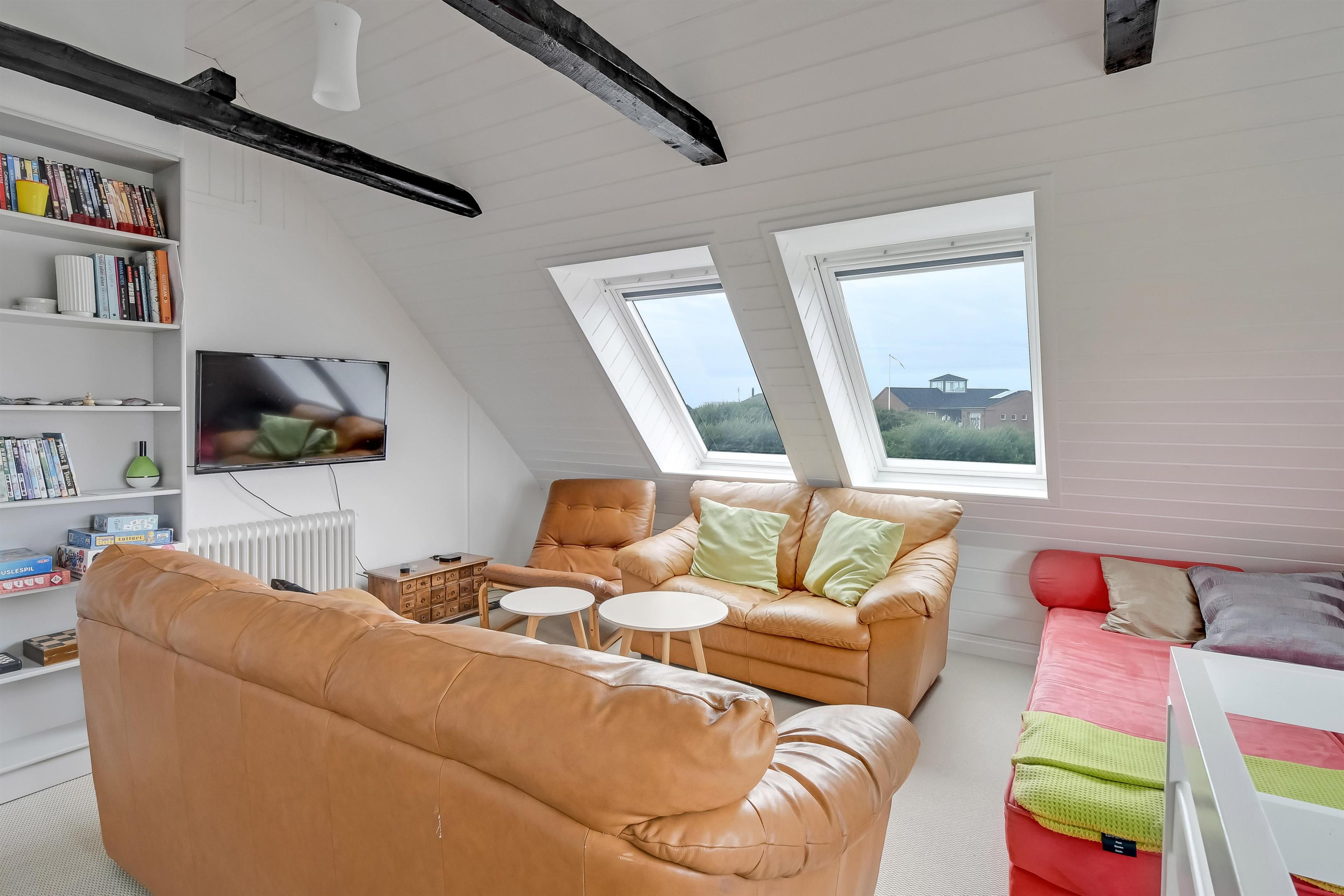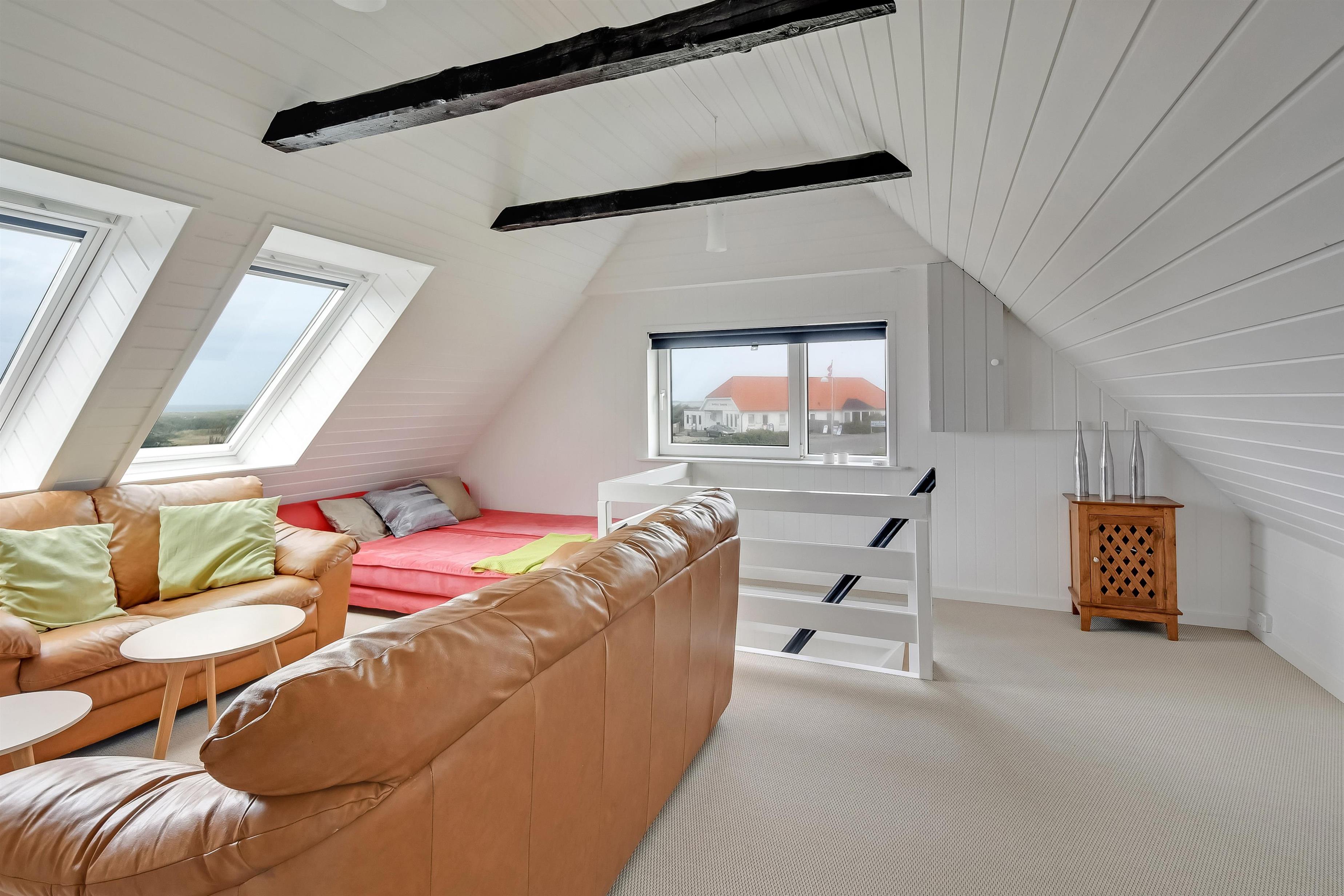 1. Stock. Treppenaufgang zum 1. Stock, wo Sie ein extra Wohnraum mit Ledermöbeln, TV mit deutsche Programme und mit der Möglichkeit, TV / Radio / Apps über Chromecast oder Apple-TV zu streamen, erwartet. Wenn Sie ein Mobiltelefon oder ein anderes Gerät bei sich haben, können Sie mit Ihrem Abonnement streamen. Hier haben Sie auch einen fantastischen Blick zur Nordsee, dem Gebiet und zum Ferring See. Im 1. Stock finden Sie auch den 2. Schlafraum mit 1 DB und 2 einzelnen Sofas im Wohnraum. Nichtraucher-Haus. Haustiere nicht erlaubt.
