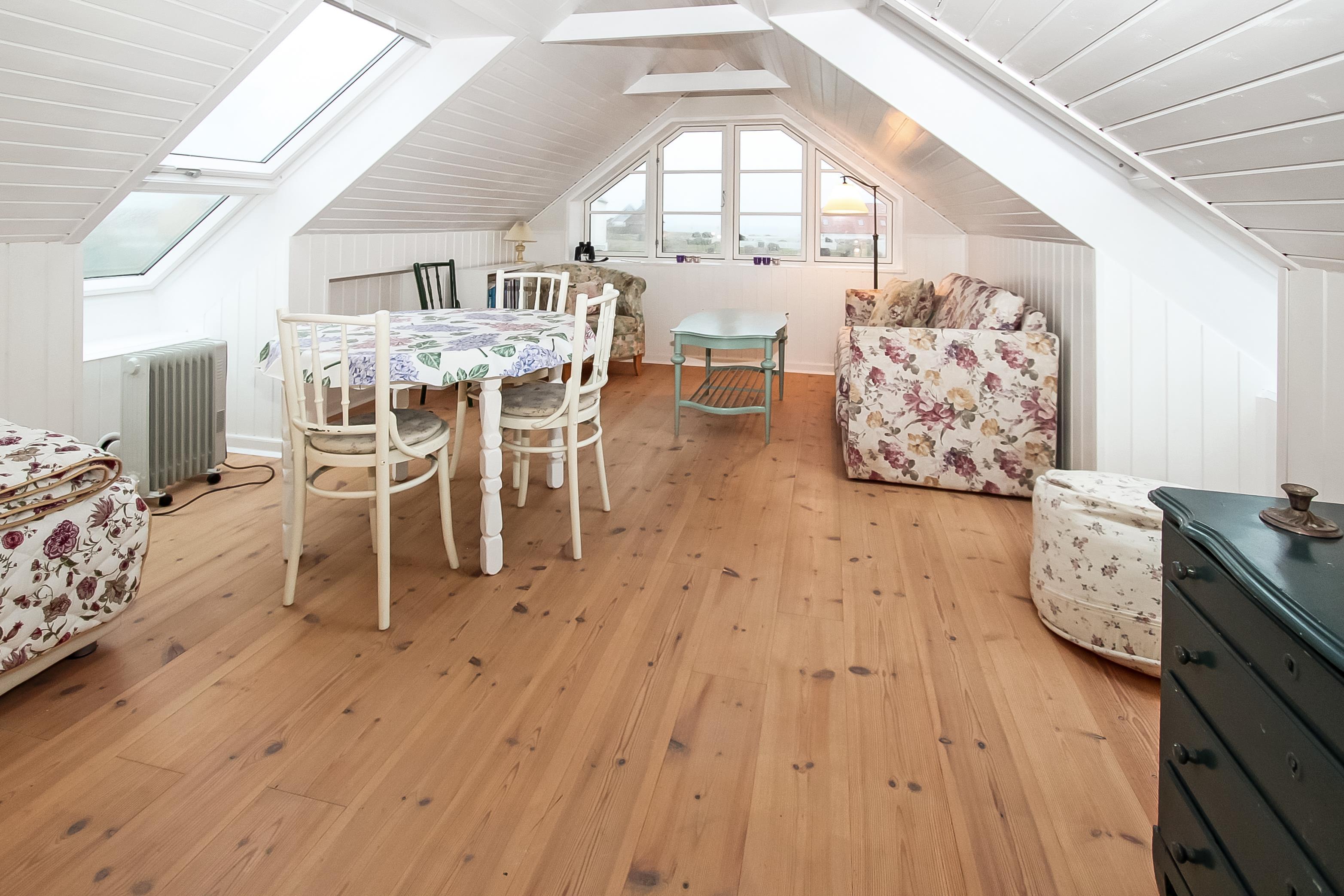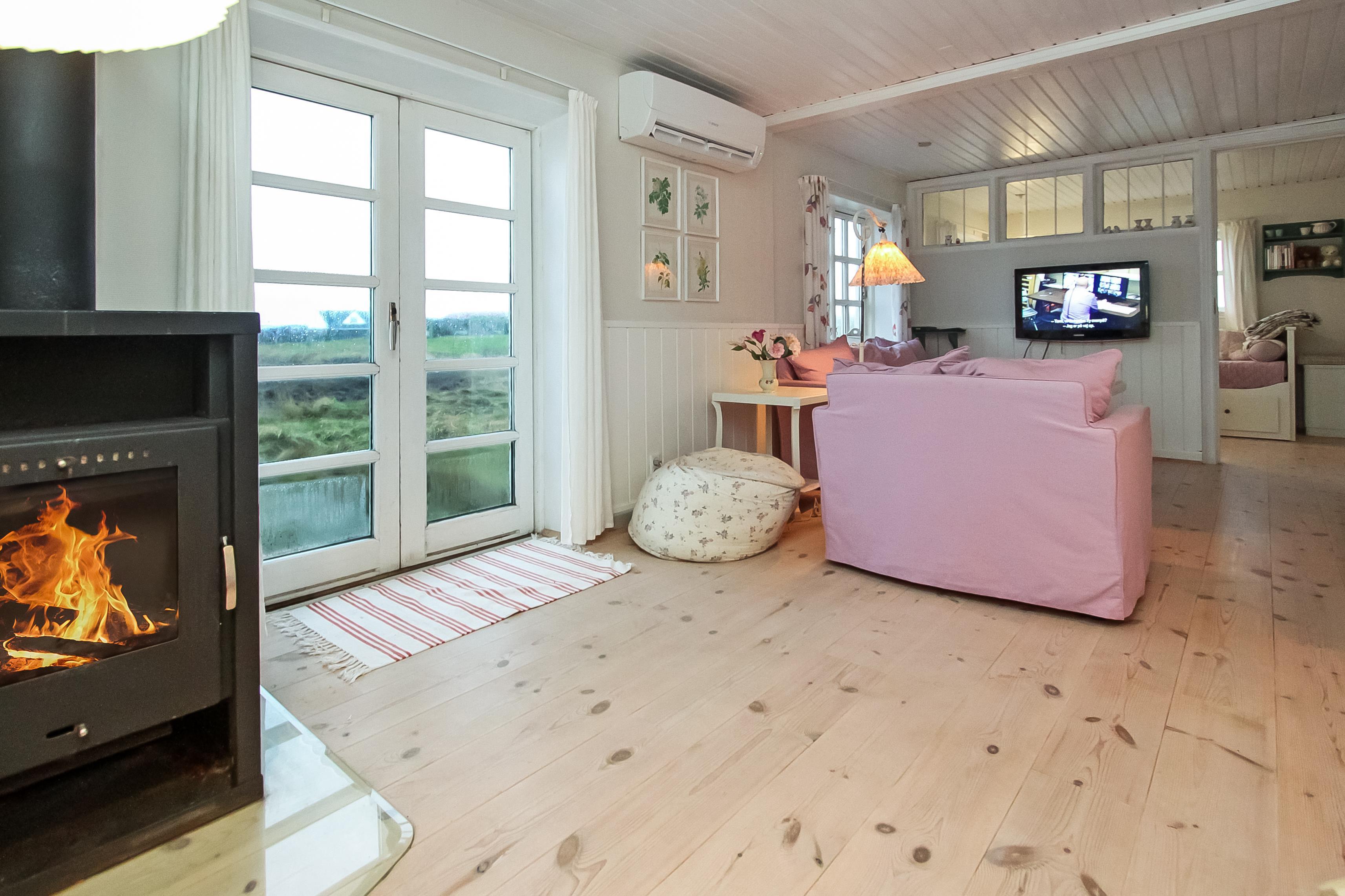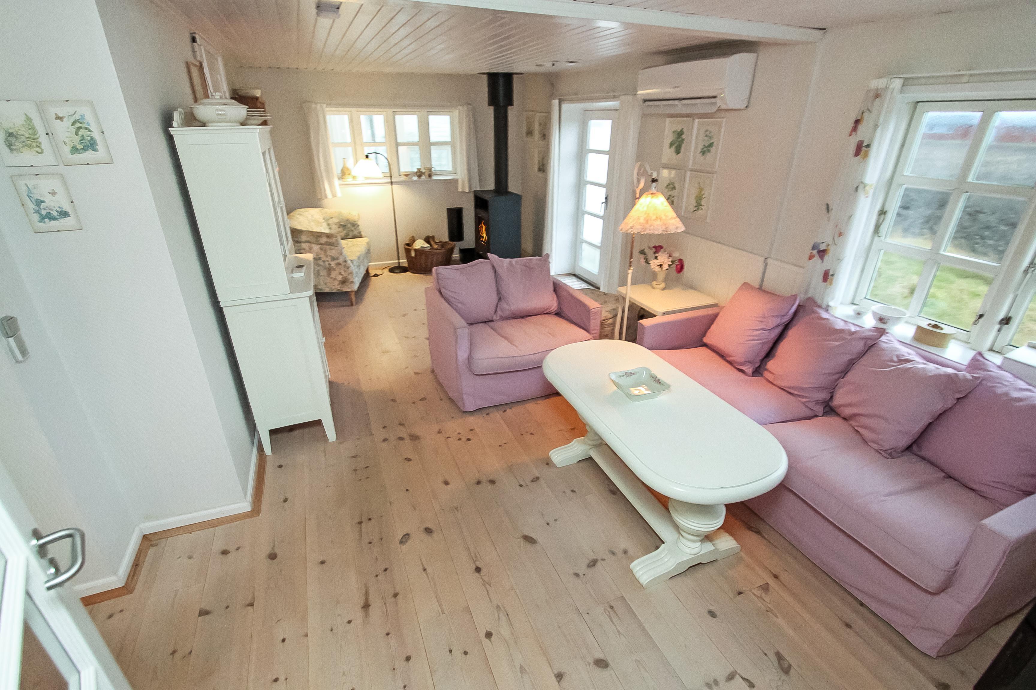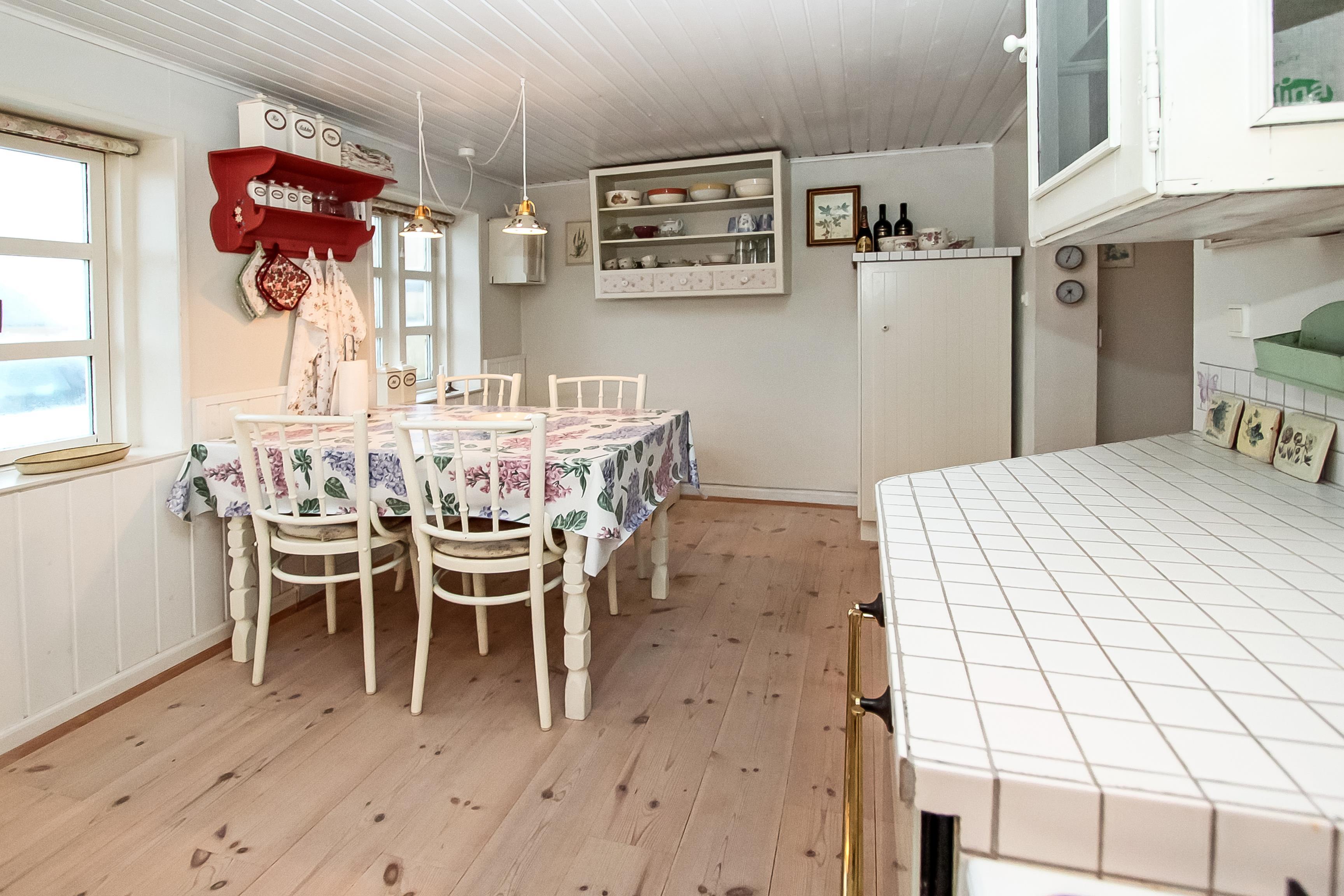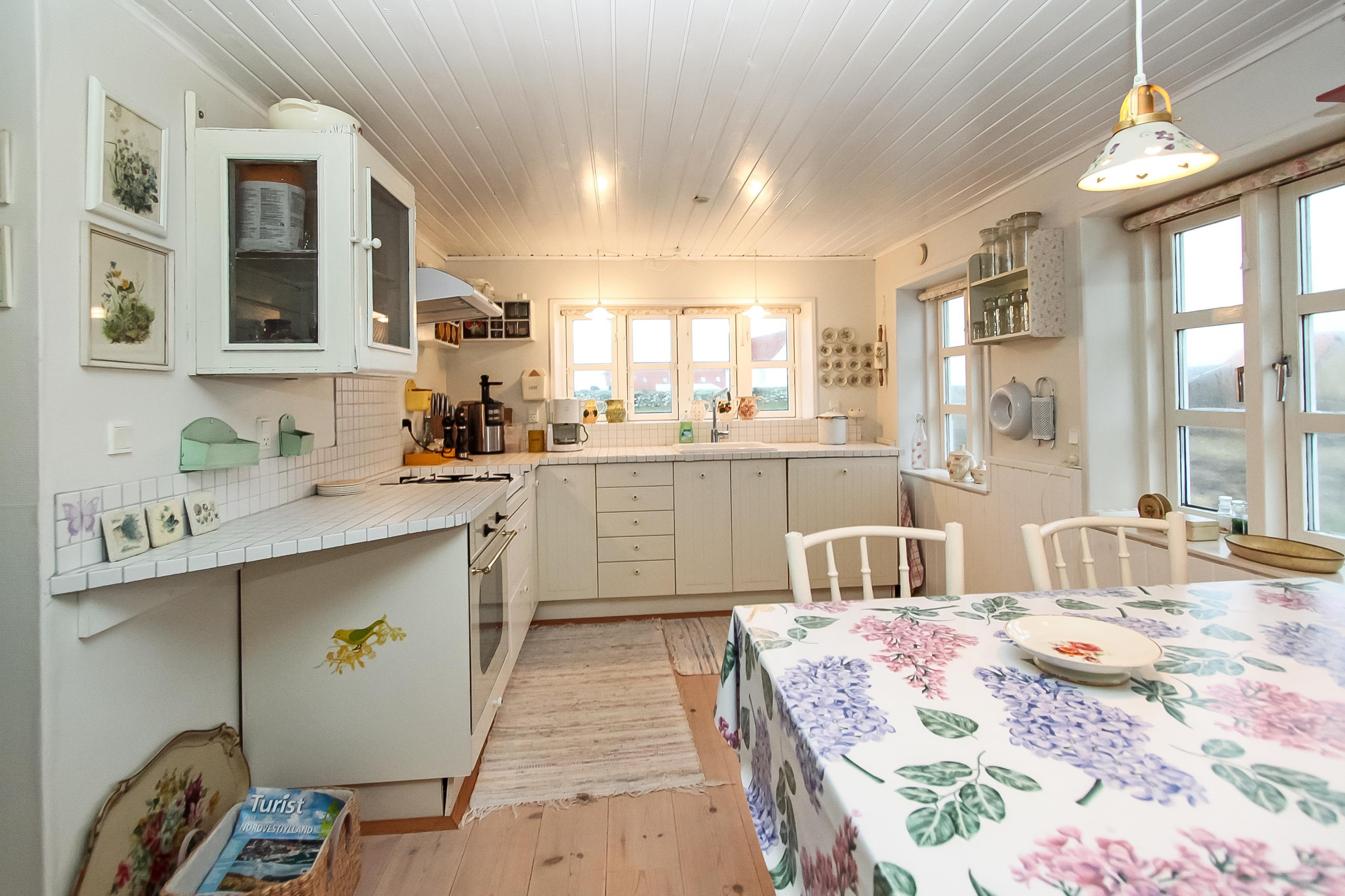 Schönes 2-stöckiges Ferienhaus auf 110 m² mit 1 einem Schlafraum: (1DB). Ausserdem gibt es in Verbindung mit dem Wohnraum ein kleines Zimmer mit einer 1DB Schlafcouch. Parken Sie das Auto im Carport. Machen Sie die Tür auf zu dem kleinen Flur mit Waschmaschine und Gefriertruhe. Von hier gehen Sie in den gemütlichen Wohnraum mit Polstermöbeln, Fernseher mit dänischen, deutschen, norwegischen und schwedischen Programmen; es führt ein Zugang zum extra Zimmer mit der DB Schlafcouch. Kaminofen und Wärmepumpe sorgen für die schöne Wärme und extra ”hygge” nach einem Spaziergang in der Gegend. Offene und gut ausgestattete Landküche mit Esstisch, Gaskochplatten, eingebautem Ofen, Geschirrspüler, Mikrowelle und Kühlschrank. Die speziell angefertigte Küchentischplatte betont, dass hier für diesen Raum etwas extra gemacht worden ist. Kleines Badezimmer mit Toilette, Waschbecken, Dusche und Fliesenboden. 1. Stock: Schöner Treppenaufgang zum 1. Stock, wo es einen zusätzlichen Wohnraum mit Esstisch, Polstermöbeln und einem fantastischen Blick über die Nordseegegend und den Ferring See gibt . Nichtraucher-Haus. 2 Haustiere sind erlaubt.