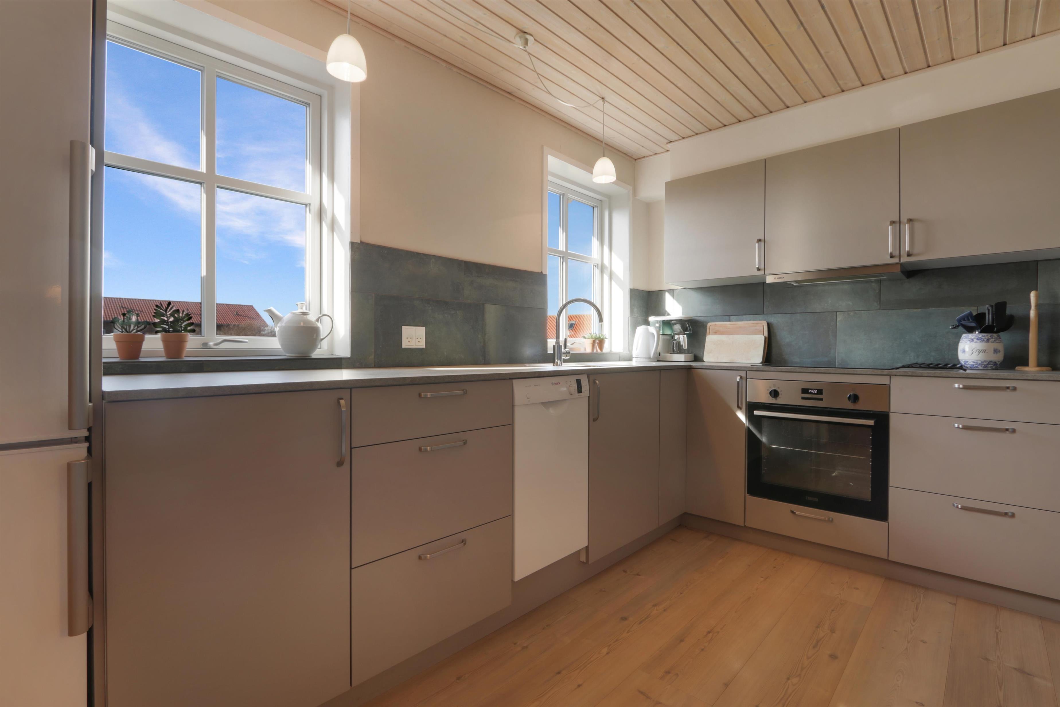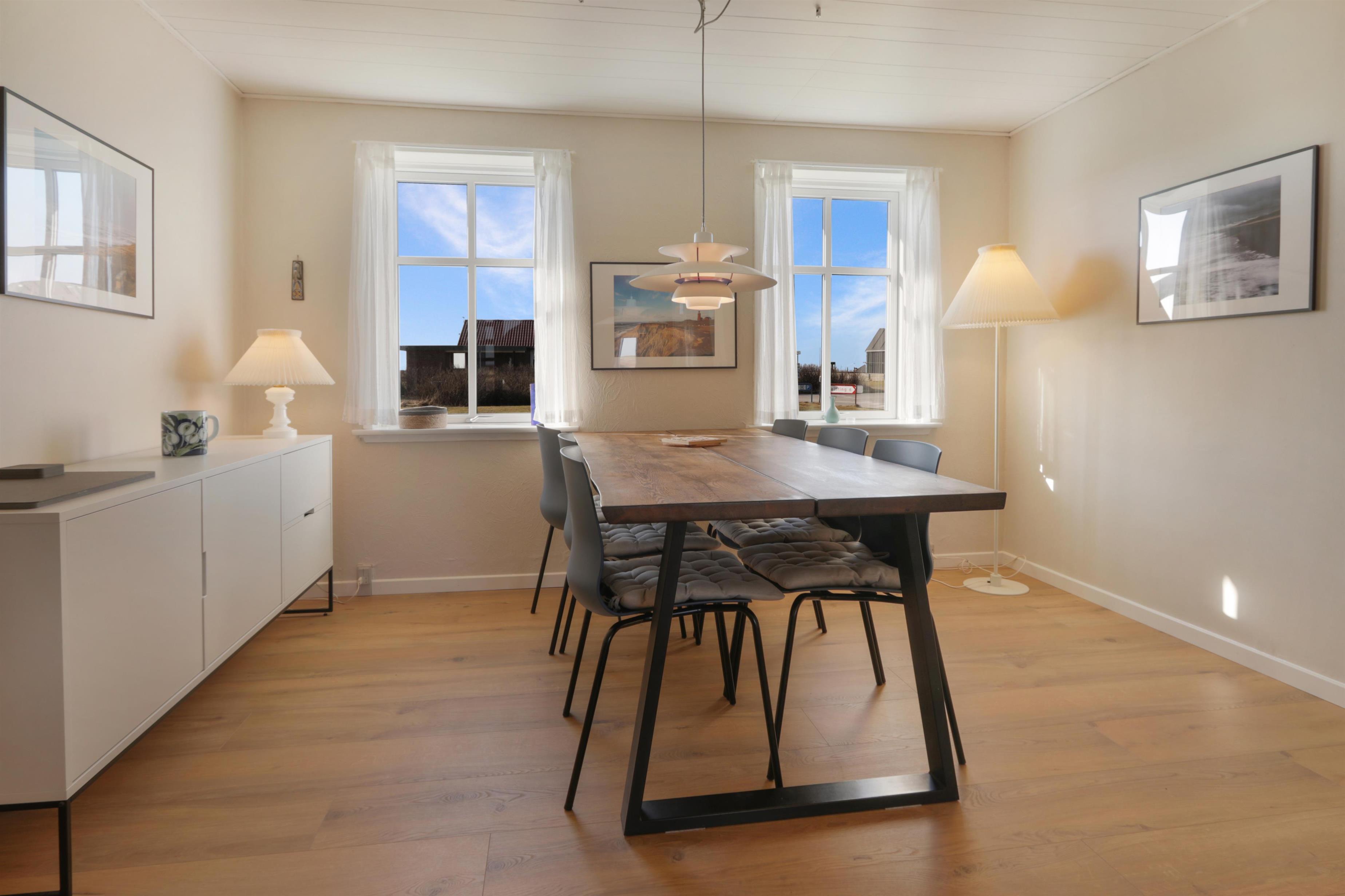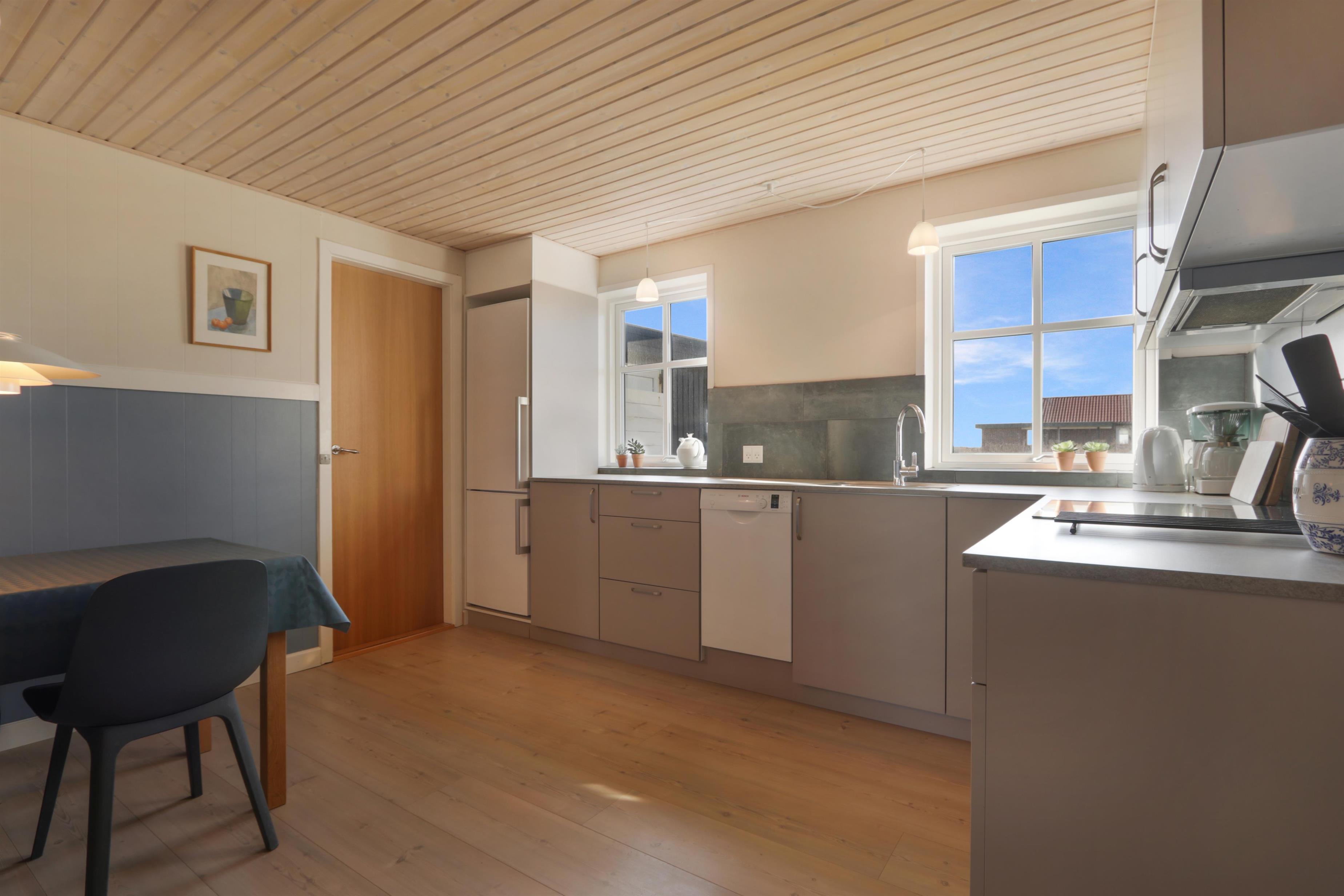 Schönes Ferienhaus über 2 Etagen auf 158 qm. Das Haus wurde etwa in 1900 erbaut. Es gibt 3 Schlafräume: 1DB, 1DB, 1DB, verteilt mit 2 Schlafräumen im Parterre mit Fußbodenheizung und 1 Schlafraum im 1. Stock. Ein schöner, neurenovertes Flur mit Waschmaschine, Trockner und extra Spüle heißt Sie willkommen. Von hier treten Sie in eine schöne renovierte Landhausküche mit Esstisch, Herd mit Cerankochfeld, Abzugshaube, Geschirrspüler, Mikrowelle und Kühlschrank mit Gefrierfach. Es gibt 2 Badezimmer im Haus. Vom Flur gibt es Zugang zu einem großen Badezimmer mit Toilette, Badewanne, Dusche und Fliesenboden mit Fußbodenheizung. Außerdem gibt es ein ganz neu renoviertes kleineres Badezimmer mit Toilette, Waschbecken, Dusche und Fußbodenheizung. Im Parterre gibt es auch ein schönes Esszimmer mit Esstisch und ein paar weichen Sitzmöbeln. Neue Luft zu Wasser Anlage macht das Haus sehr energiefreundlich und hilft eine günstigere Nebenrechnung zu bekommen. Gegenüber der Treppe am Ende des Esszimmers kommen Sie leicht in den 1. Stock. Hier gibt es außer dem Schlafzimmer auch einen schönen Wohnraum mit Couch, Smart-TV mit dänischen und deutschen Programmen und die Möglichkeit für Streaming von TV / Radio / Apps wofür Sie selber ein Abonnement haben, DVD- und CD-Spieler und einen fantastischen Blick zur Nordsee und über die Gegend. Im Wohnraum hat der Besitzer eine schöne Ecke mit 2 Stühlen eingerichtet, von dem Sie durch die großen Panoramafenstern einen wunderbaren direkten Ausblick zur Nordsee haben. Besser geht es nicht. Nichtraucher-Haus. Max. 2 Haustiere erlaubt.