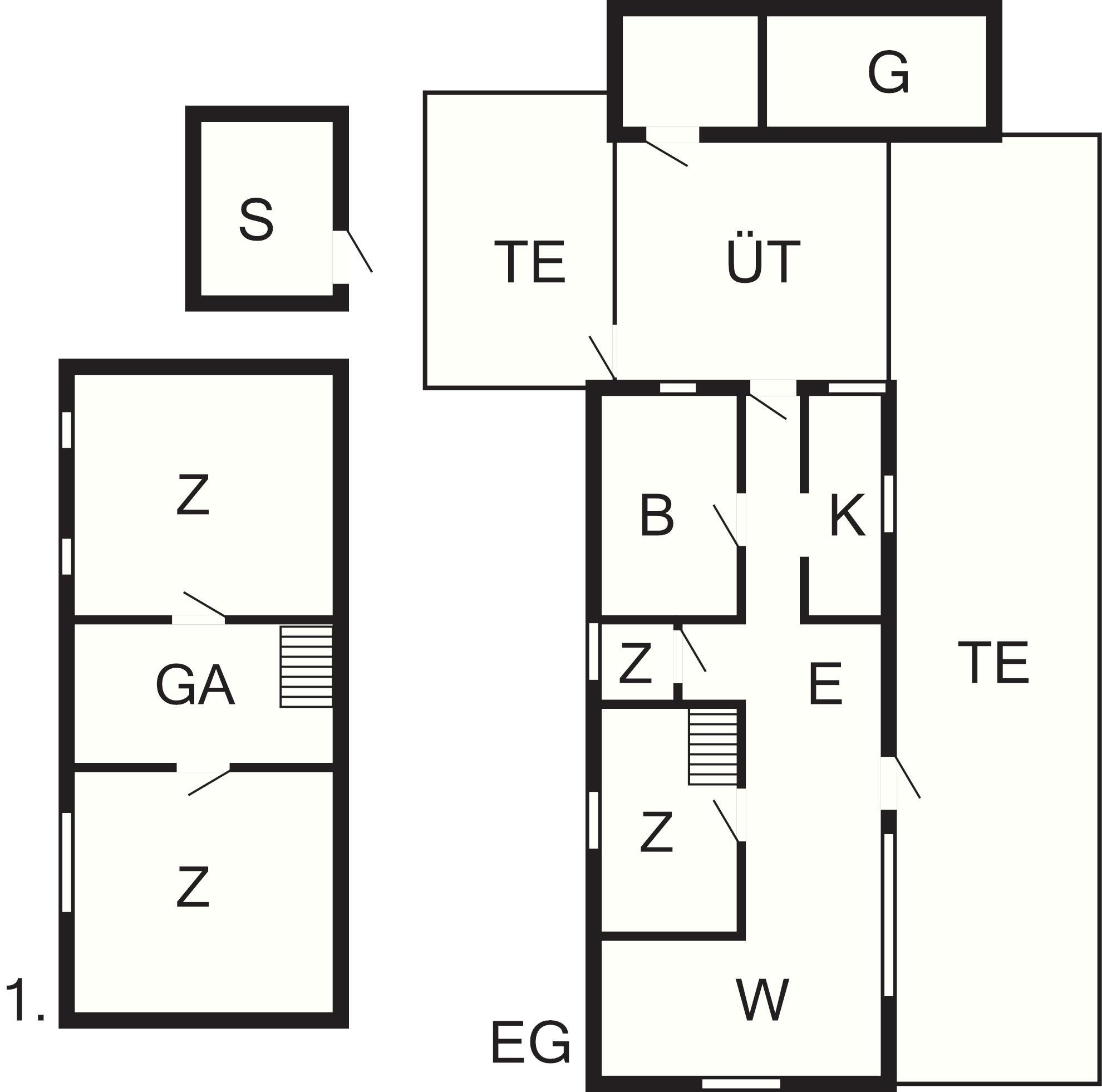 Bad: Waschm., WC, Waschb., Außendusche, Dusche