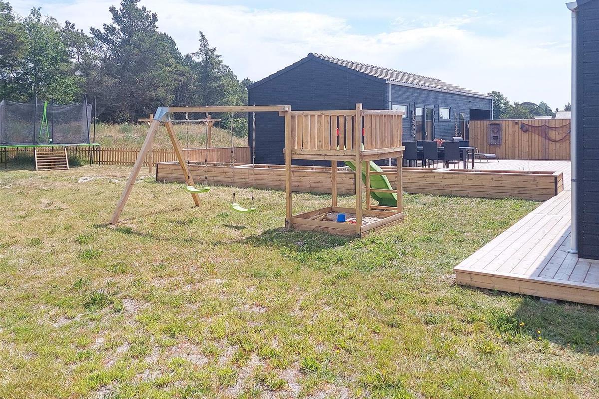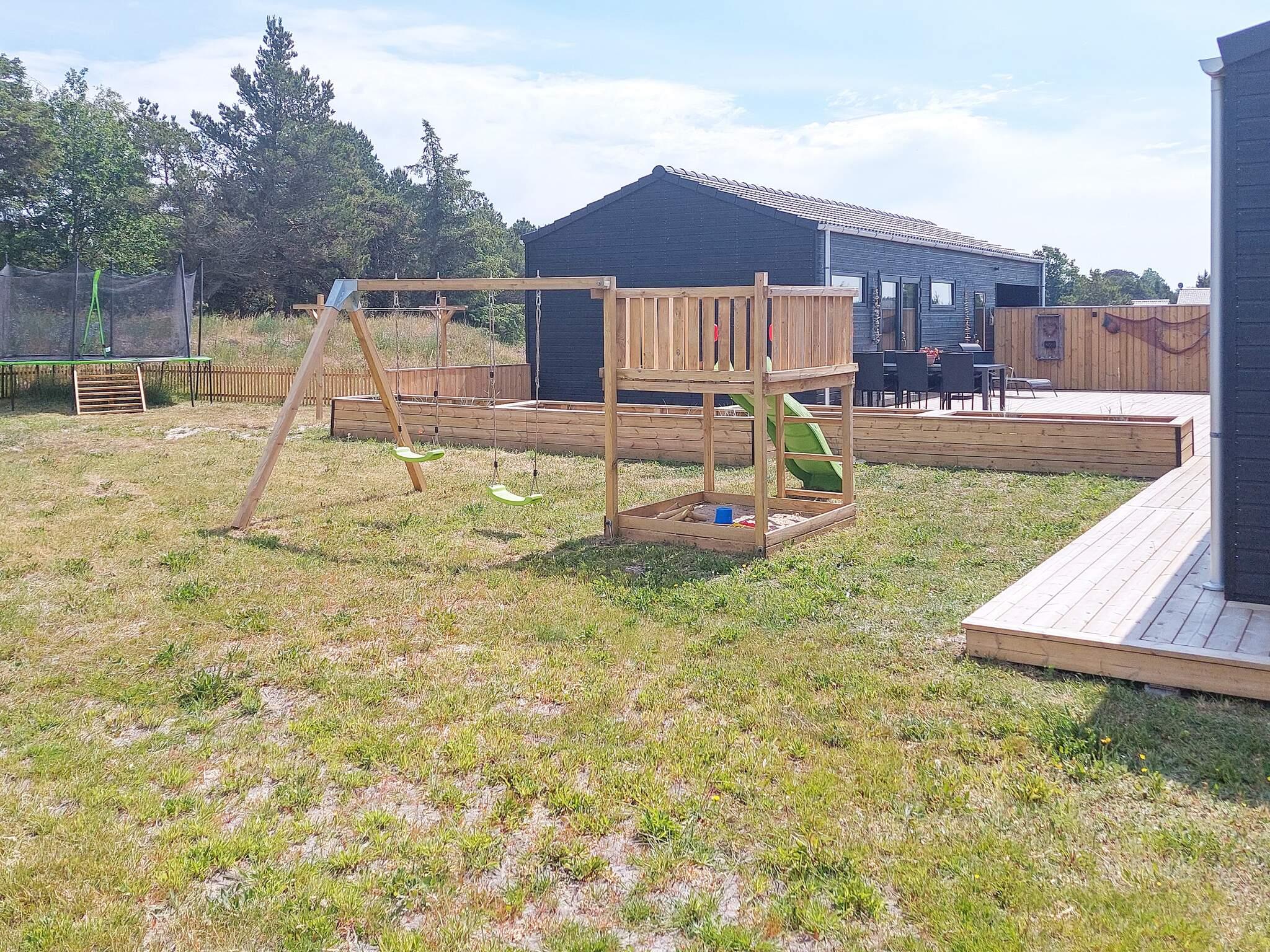 Im Außenbereich laden die großen, mit dem Haus verbundenen Terrassen zum Sonnenbaden, Grillen und Entspannen ein. Auf der Rasenfläche gibt es viel Platz für Spiele und Ballspiele. Außerdem gibt es einen Spielturm mit Schaukeln, Rutsche und Sandkasten.