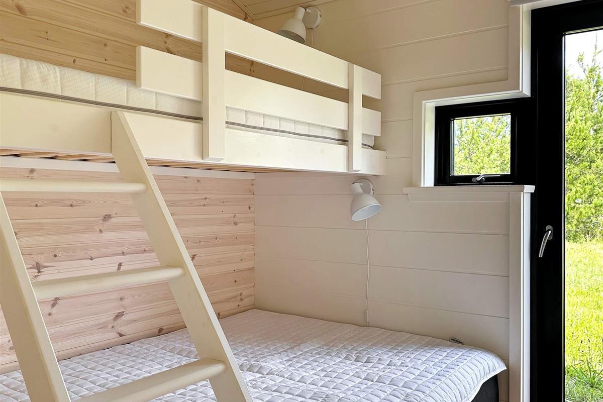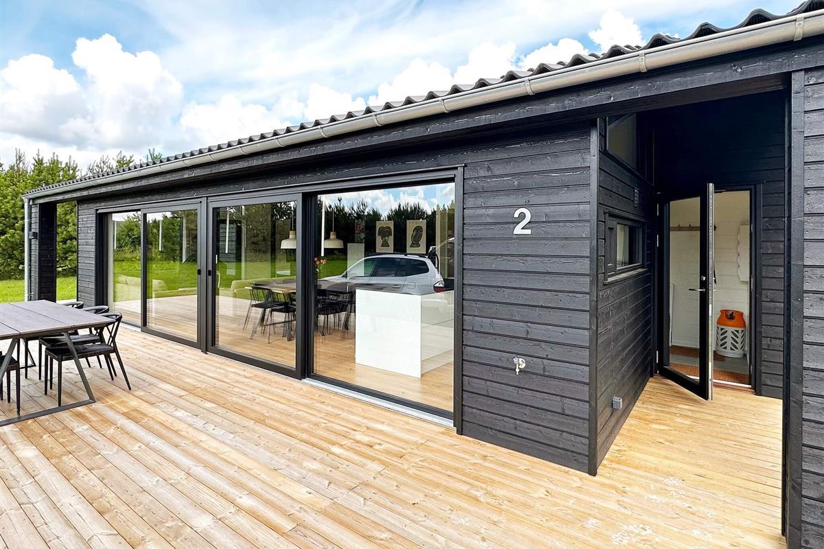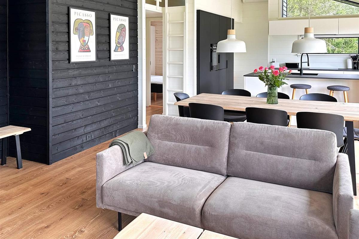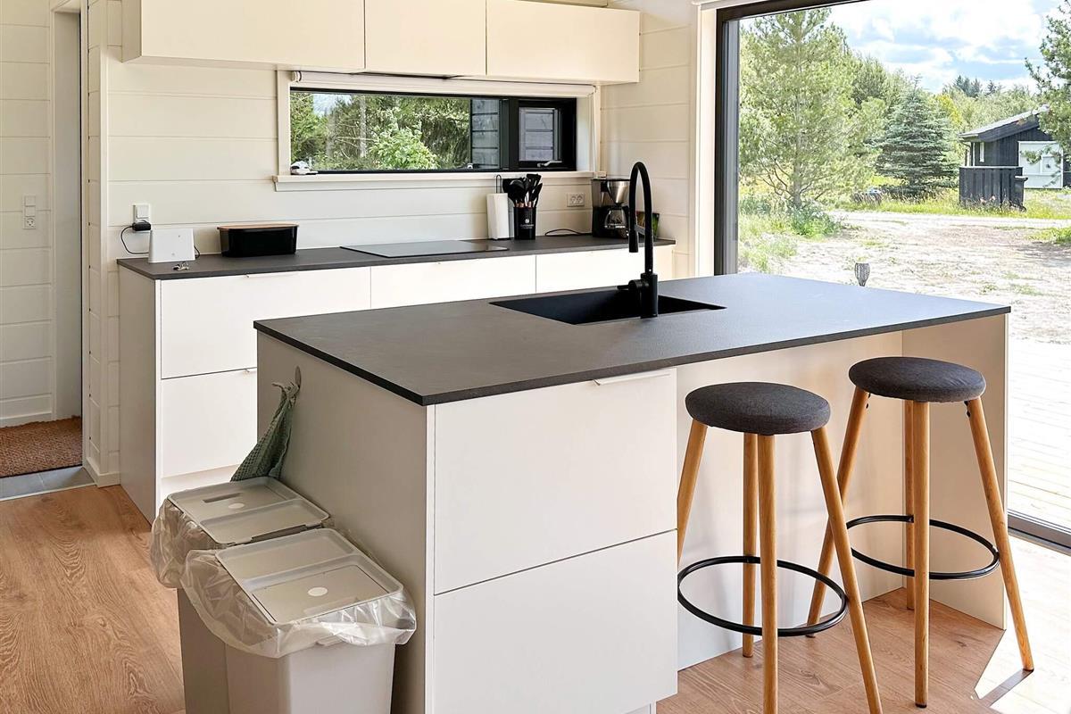 Küche, Esszimmer und Wohnzimmer sind zu einem langen Raum zusammengefasst, und die gut ausgestattete Küche bietet einen guten Überblick über die Aktivitäten der Familie. Das Sommerhaus verfügt über drei Schlafzimmer mit guten Betten, davon zwei Schlafzimmer mit Doppelbetten und ein Schlafzimmer mit einem 3/4-Bett und einem Etagenbett für eine Person. Außerdem gibt es zwei Badezimmer.