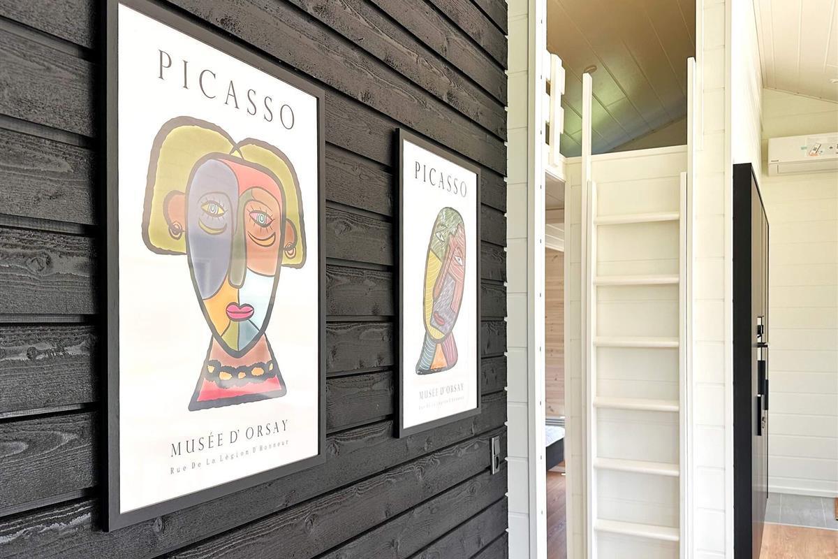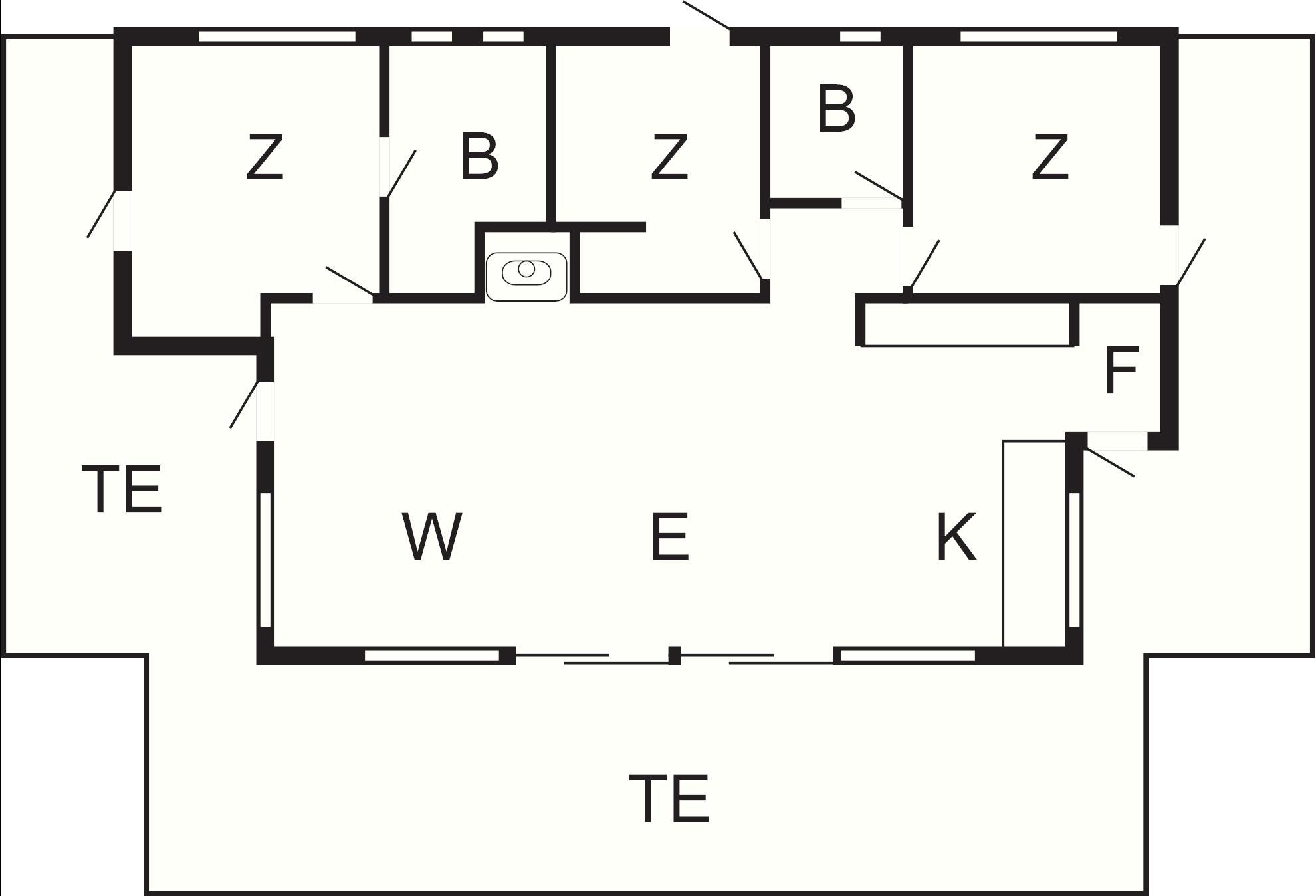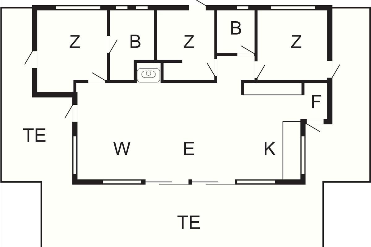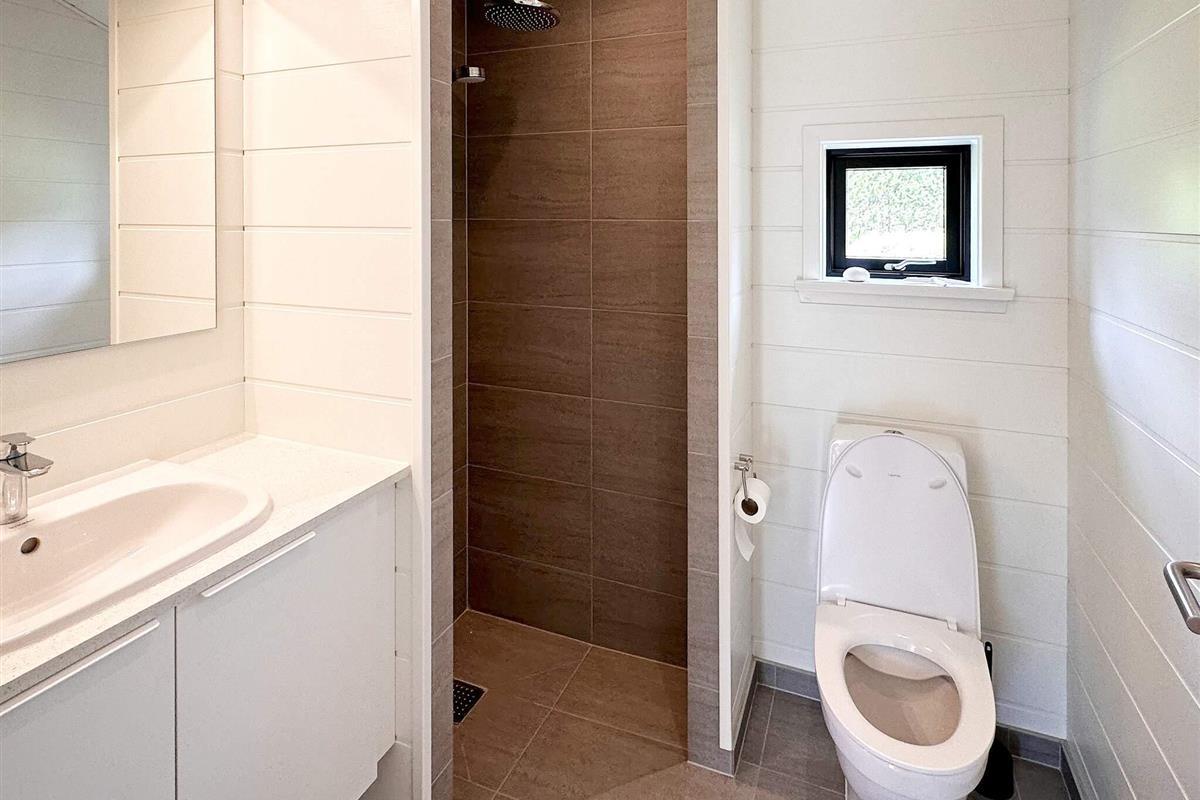 Küche, Esszimmer und Wohnzimmer sind zu einem langen Raum zusammengefasst, und die gut ausgestattete Küche bietet einen guten Überblick über die Aktivitäten der Familie. Das Sommerhaus verfügt über drei Schlafzimmer mit guten Betten, davon zwei Schlafzimmer mit Doppelbetten und ein Schlafzimmer mit einem 3/4-Bett und einem Etagenbett für eine Person. Außerdem gibt es zwei Badezimmer.