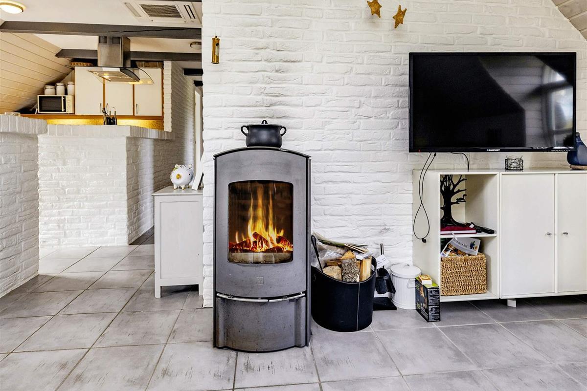 modern. Offener Küchen-Aufenthaltsraum, Wohnzimmer mit Kaminofen und