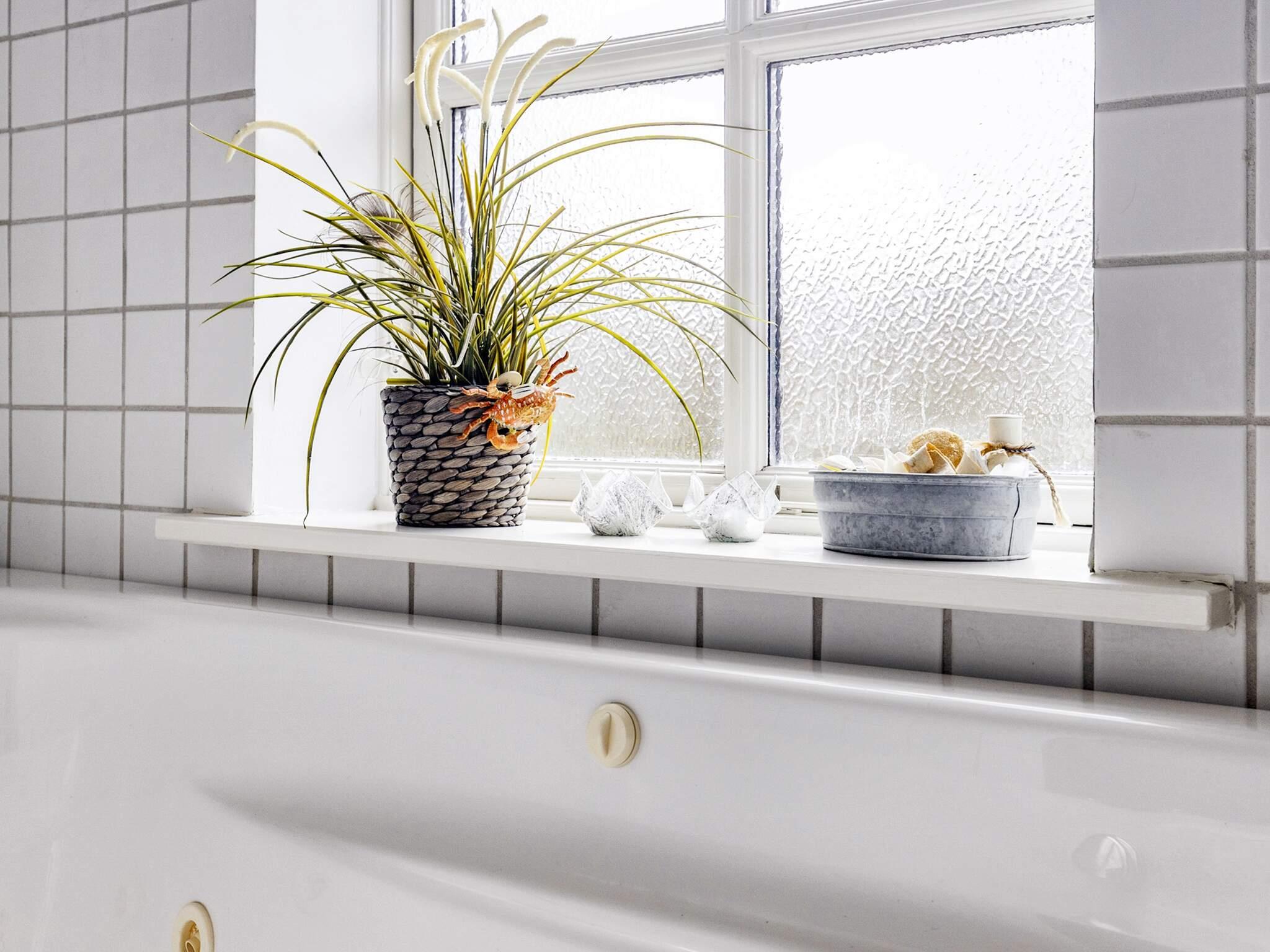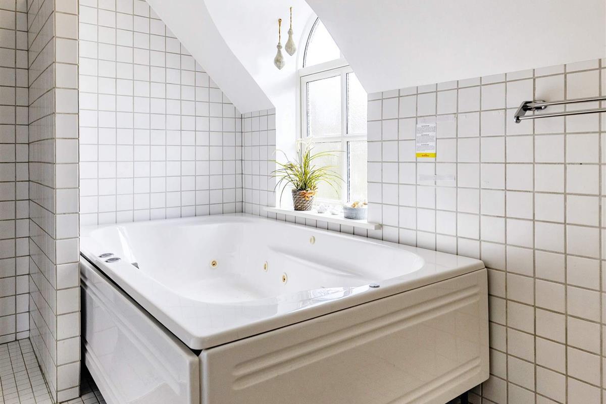 Innen Badezimmer mit Whirlpool. Die Einrichtung ist hell und