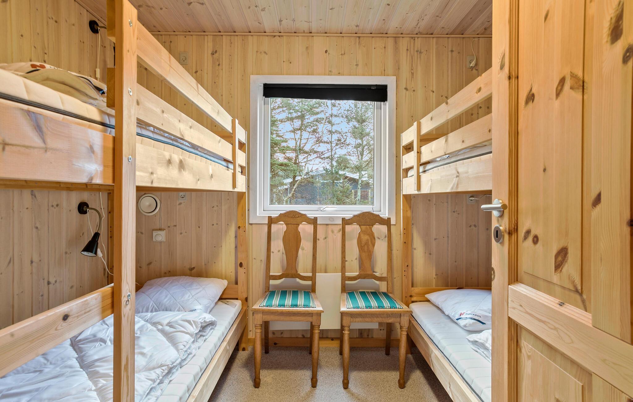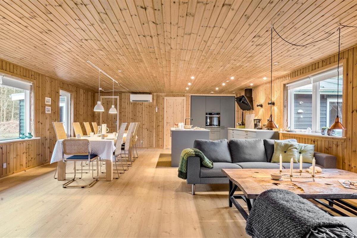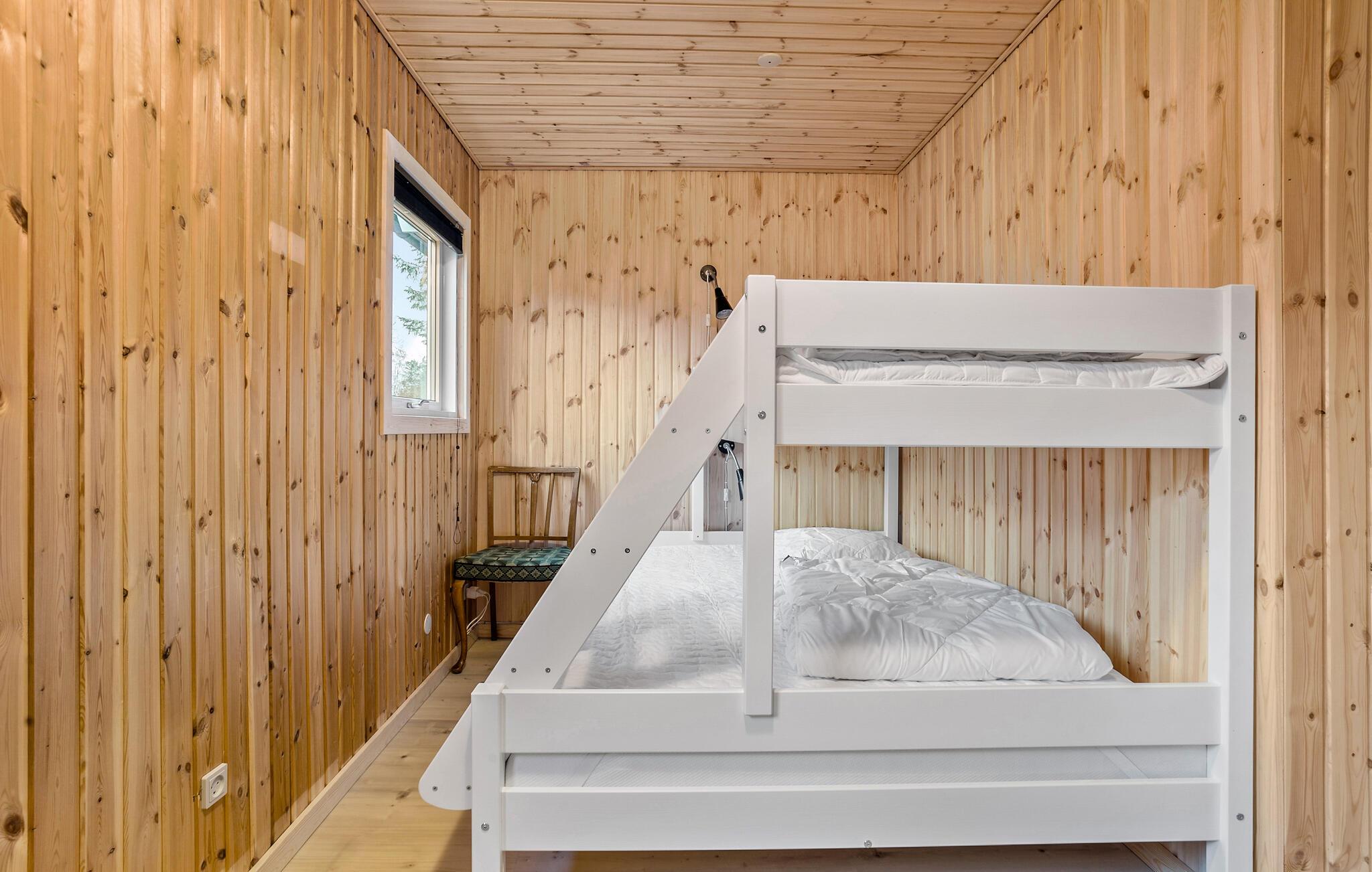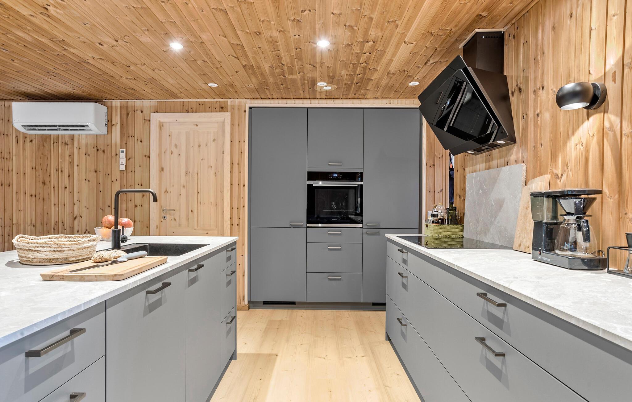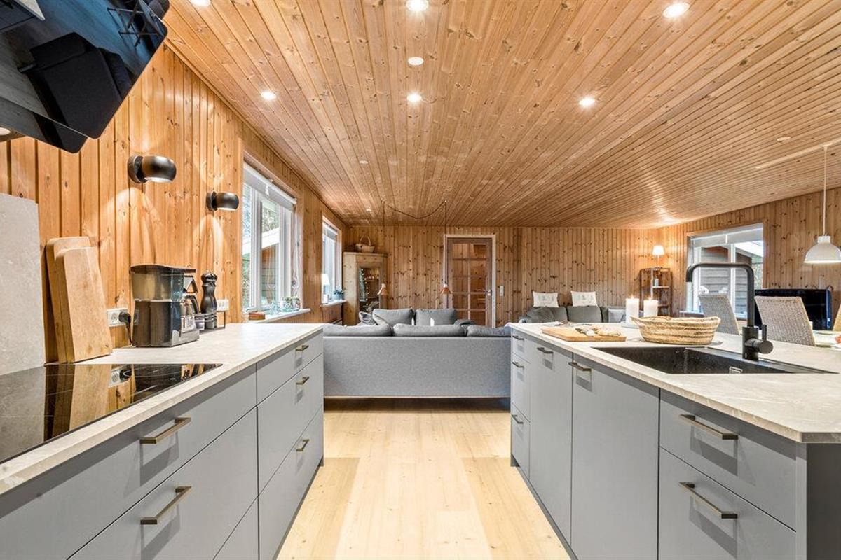 Stap binnen en ervaar het gezellige huis, dat moderniteit combineert met klassieke houten lambrisering. Binnen vind je een goed doordachte indeling met slaapgedeeltes aan beide uiteinden van het huis, perfect voor grote gezinnen of groepen. De lichte, goed uitgeruste keuken nodigt uit om samen te koken, terwijl de open woonkamer gezelligheid en ontspanning belooft.
