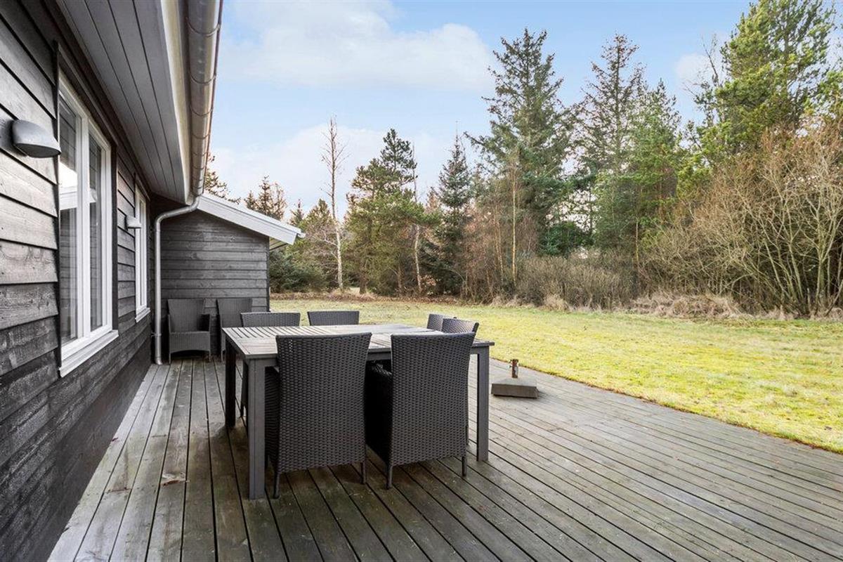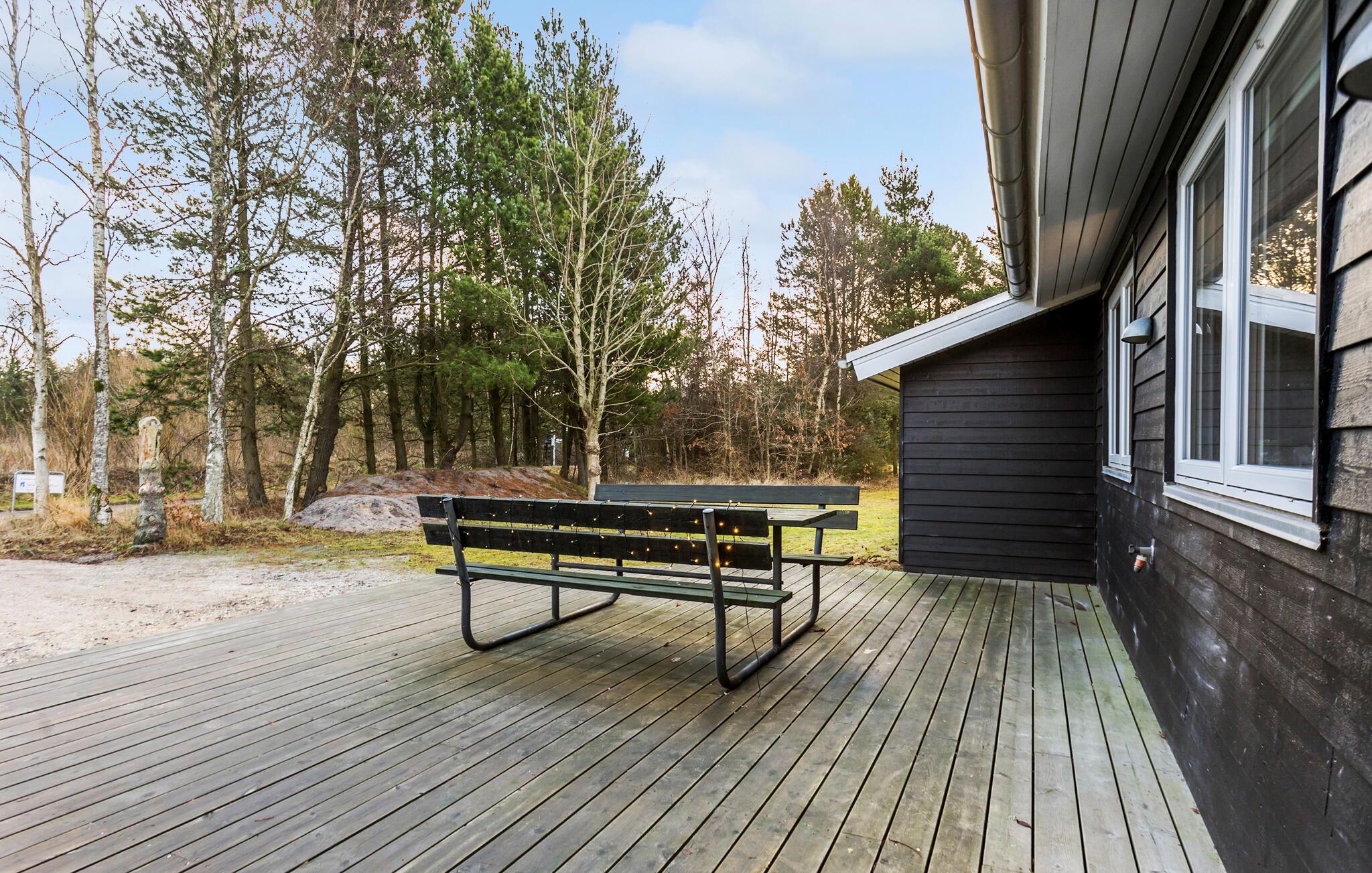 Het ruime houten terras van dit prachtige vakantiehuis strekt zich uit aan beide zijden van het huis en biedt veel ruimte voor gezelligheid in de frisse lucht. De ruime woning is omgeven door bomen en biedt je een oase van rust met veel ruimte voor balspelen en ongestoord spelen.