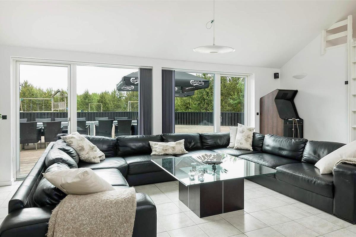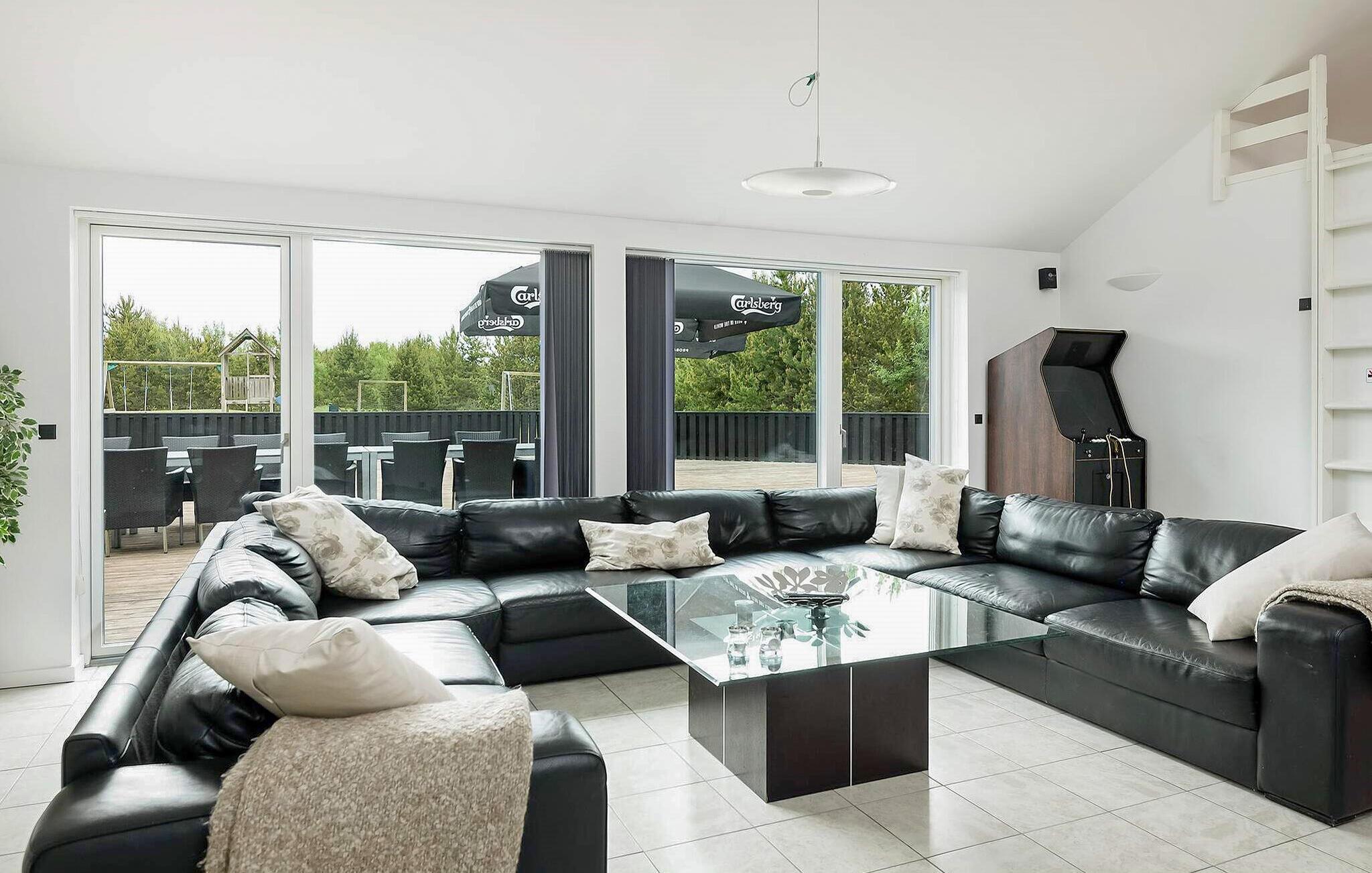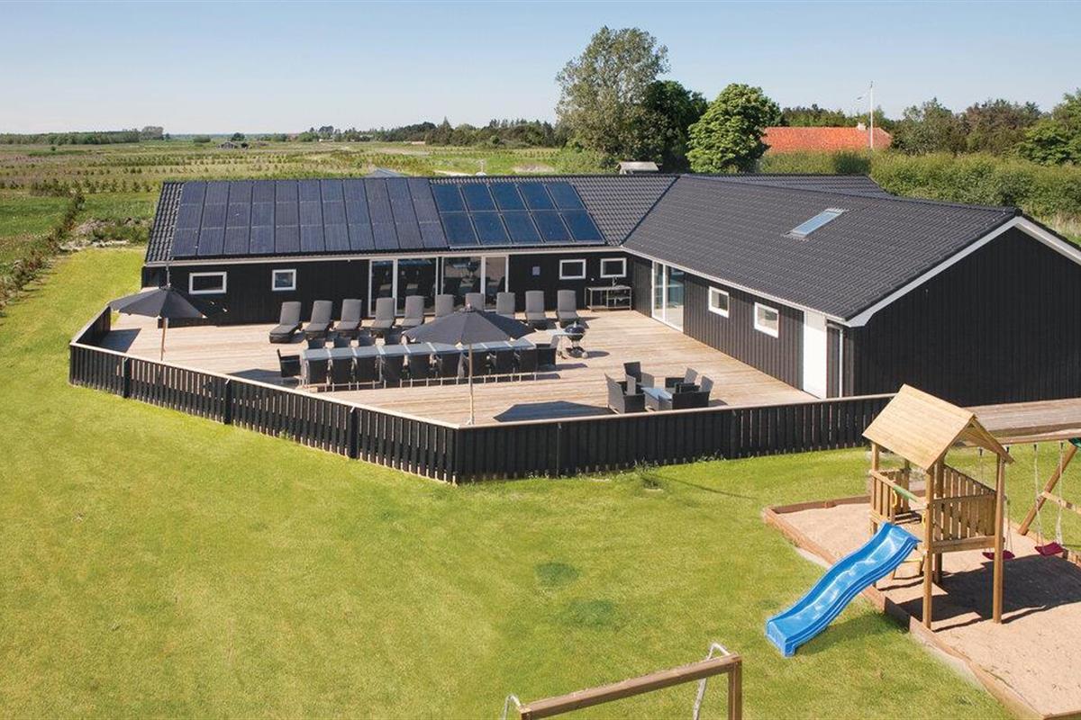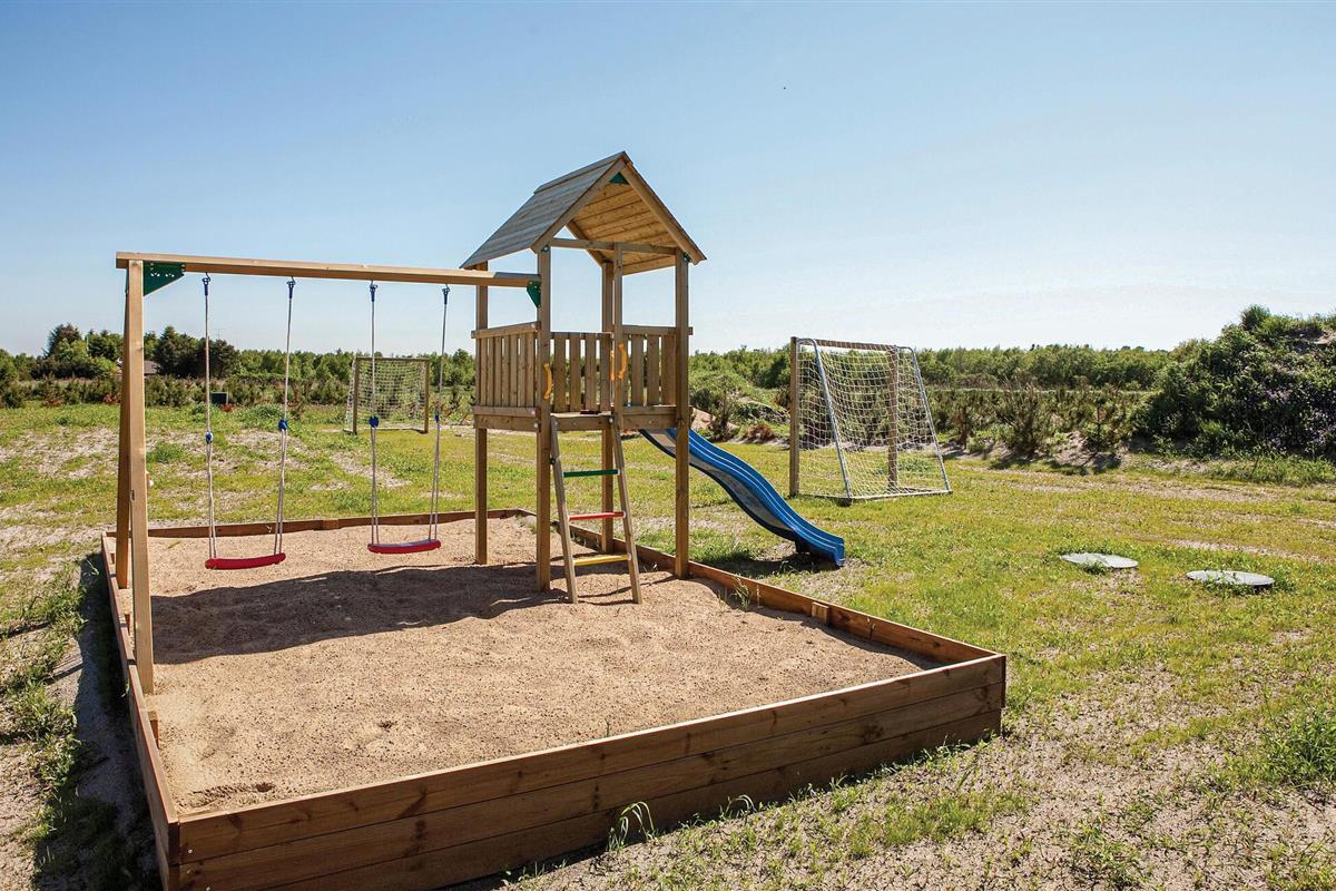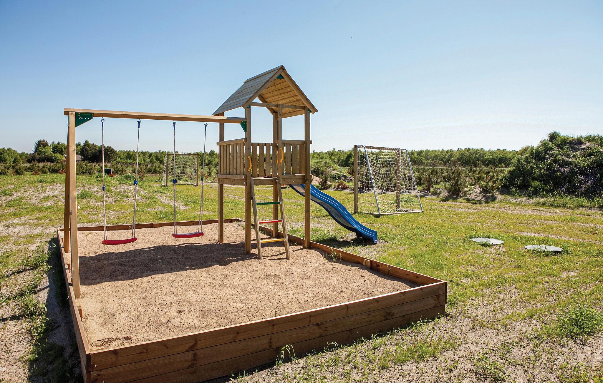Vanuit de ruime woonkamer heb je direct toegang tot het grote houten terras van het vakantiehuis. Kijk hoe je kinderen spelen in de zandbak of op de schommels en speeltoren en serveer heerlijke barbecues in de buitenlucht.