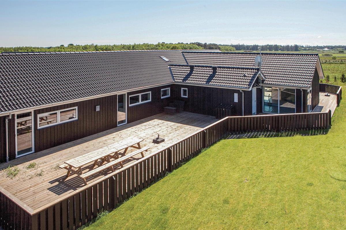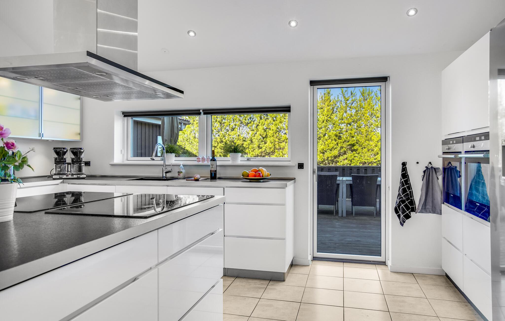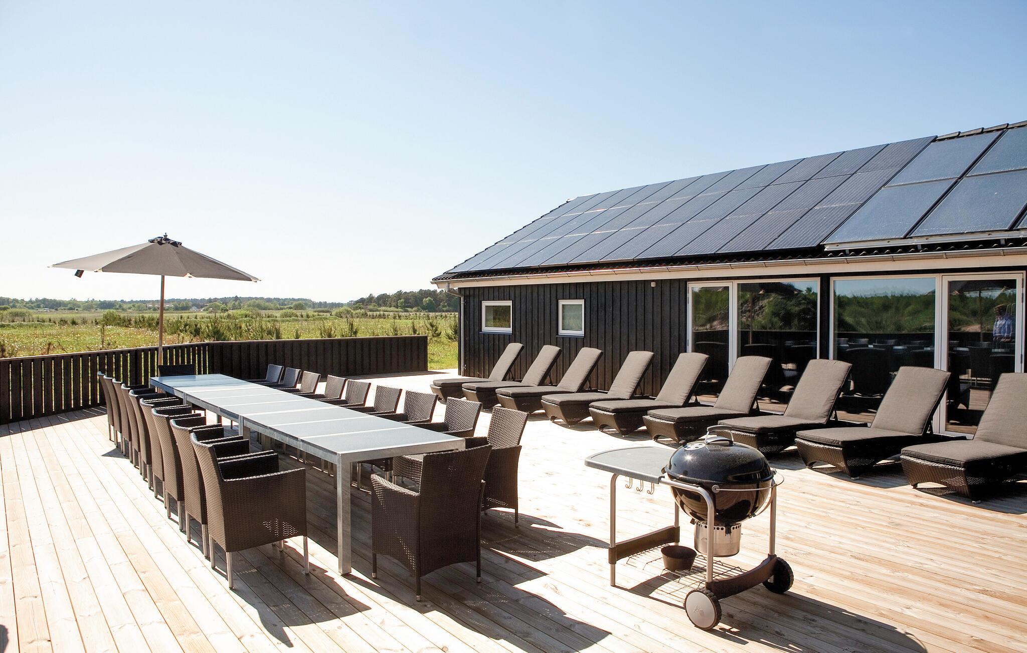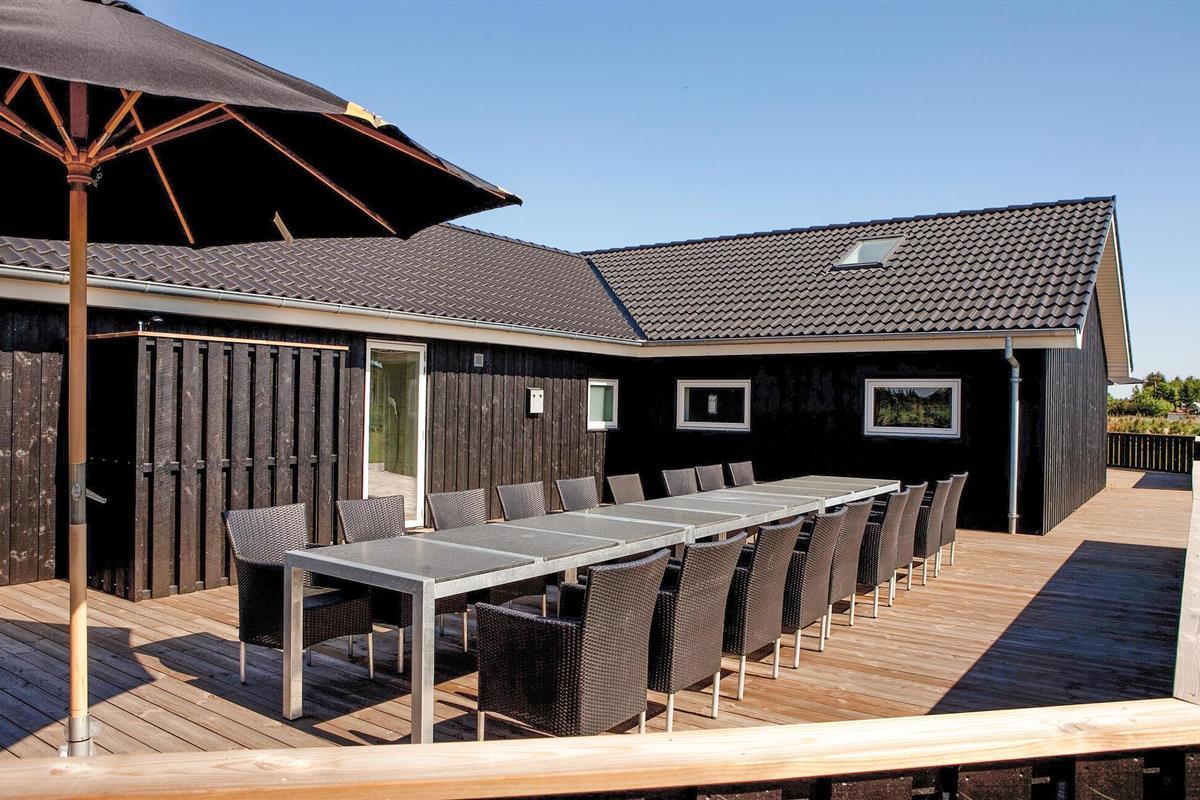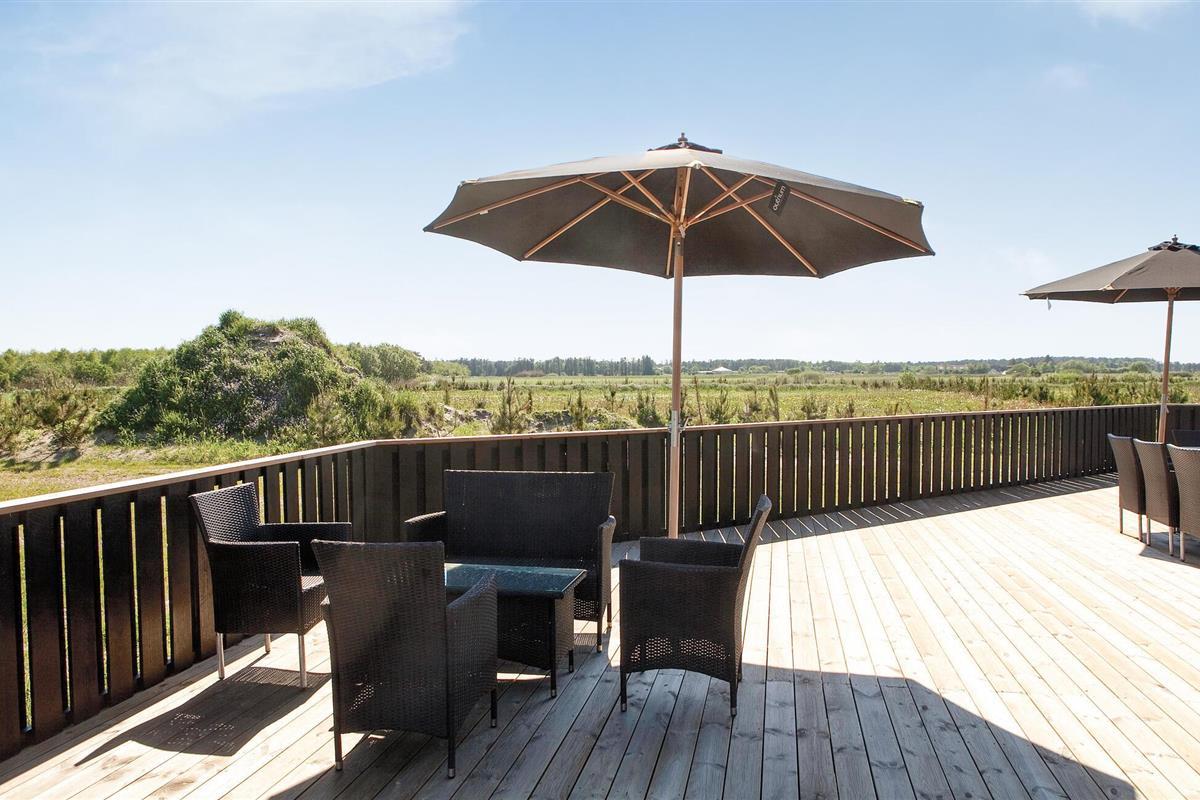 Vanuit de ruime woonkamer heb je direct toegang tot het grote houten terras van het vakantiehuis. Kijk hoe je kinderen spelen in de zandbak of op de schommels en speeltoren en serveer heerlijke barbecues in de buitenlucht.