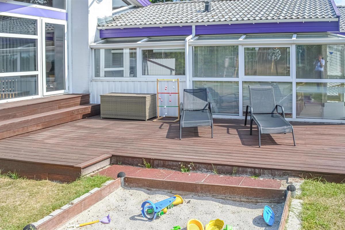 De woning is omringd door bomen, zodat je in alle rust kunt ontspannen op de ruime terrassen van het huis en zonnebaden bij mooi weer. Dankzij het multi-level ontwerp van het huis zijn er tal van beschutte plekjes op de terrassen.