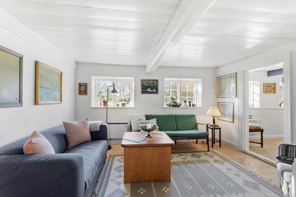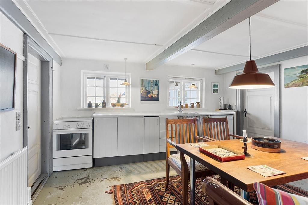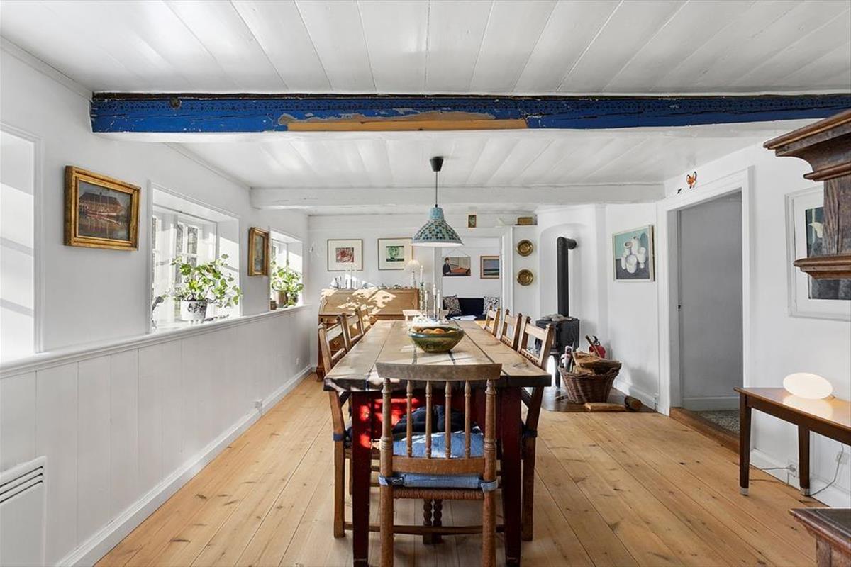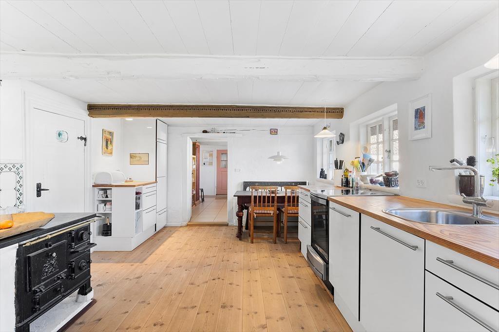 Treten Sie ein in diese charmante Landküche, wo sichtbare Balken und rustikale Details eine warme Atmosphäre schaffen. Hier gibt es viel Platz, um köstliche Mahlzeiten zuzubereiten, vielleicht mit Zutaten von den lokalen Märkten. Der Essbereich mit dem Kaminofen lädt zu langen Abendessen und gemütlichen Stunden vor dem Feuer ein, während das Fernsehzimmer der perfekte Ort zum Entspannen nach einem Tag voller Erlebnisse auf Aeroe ist.