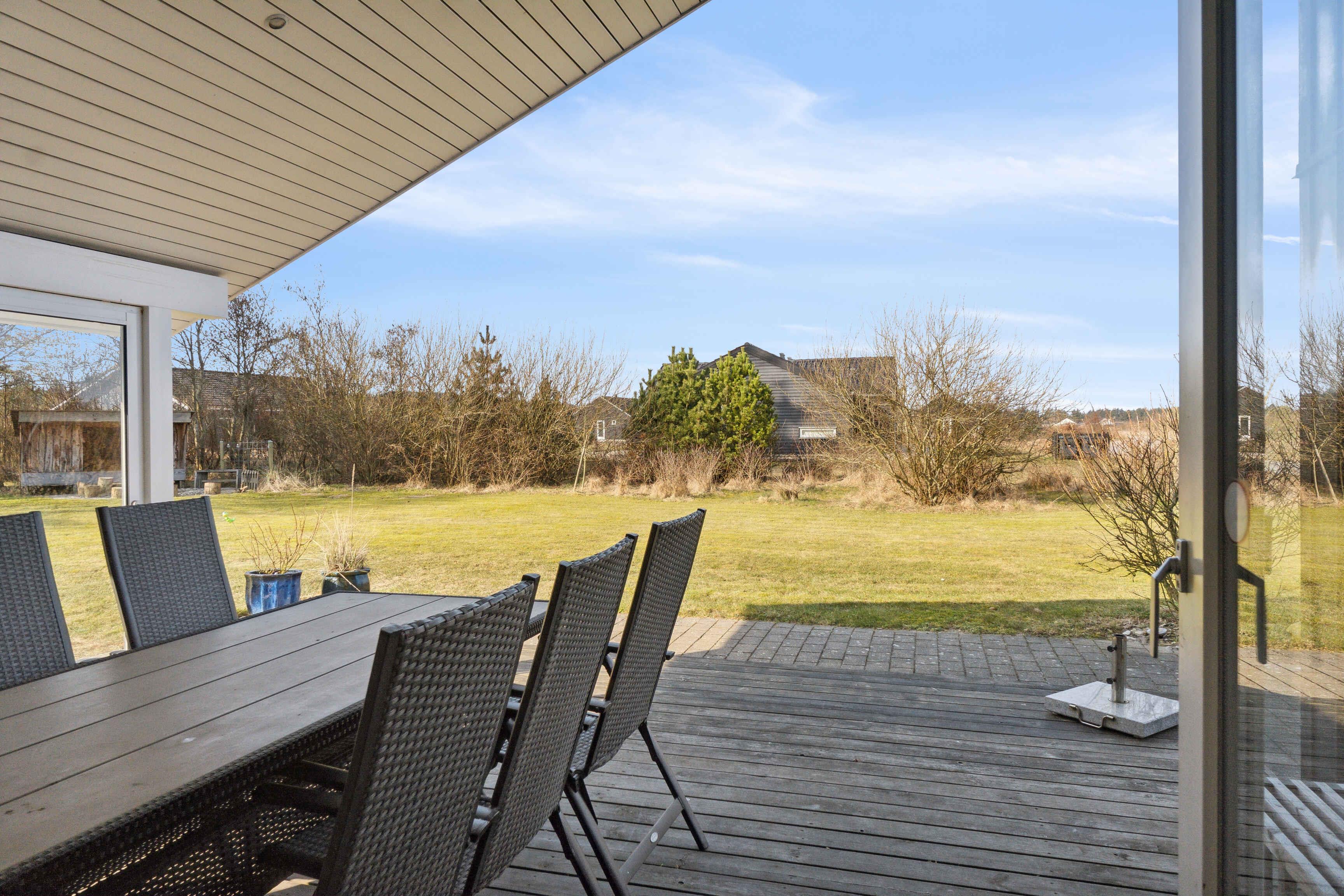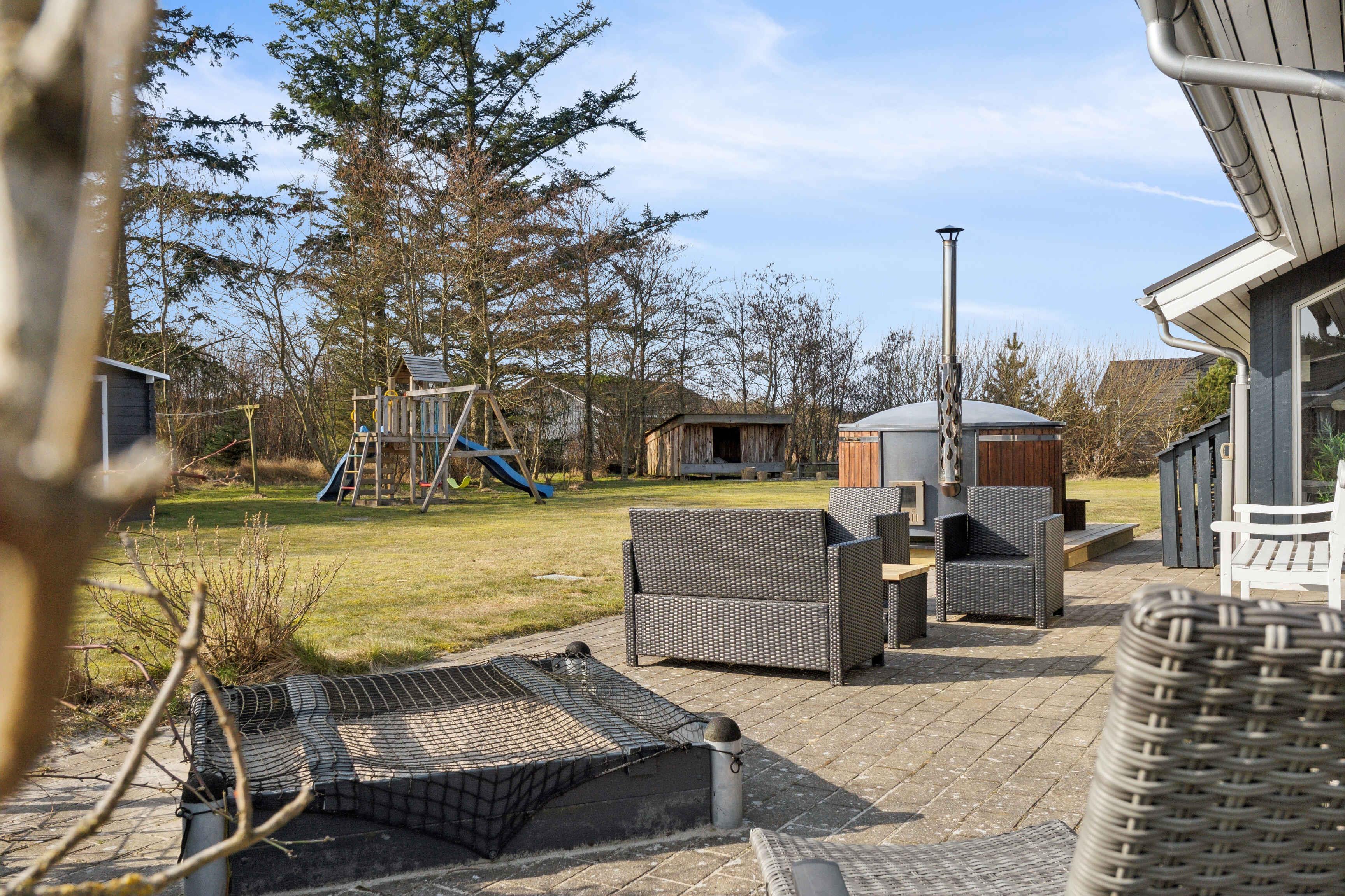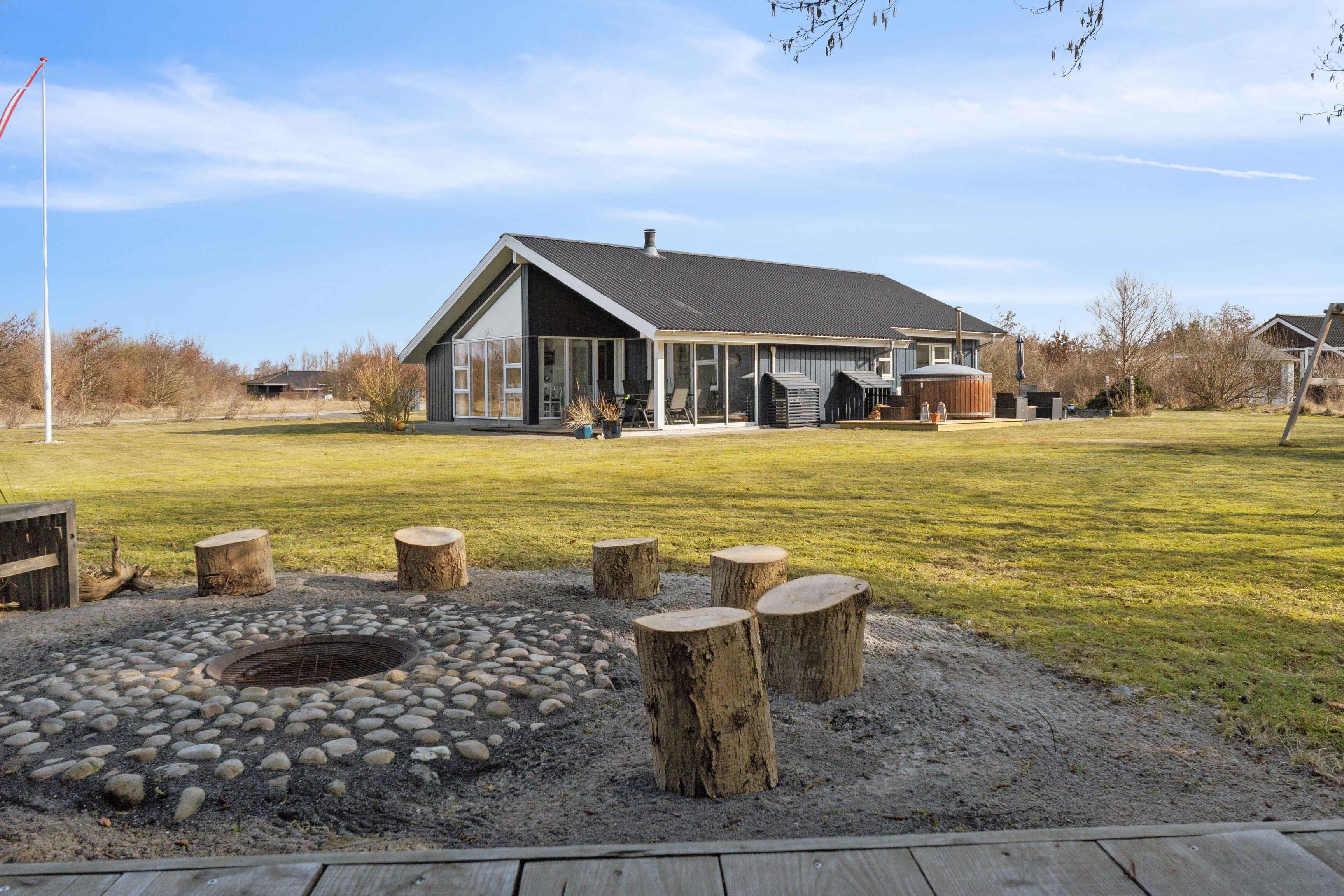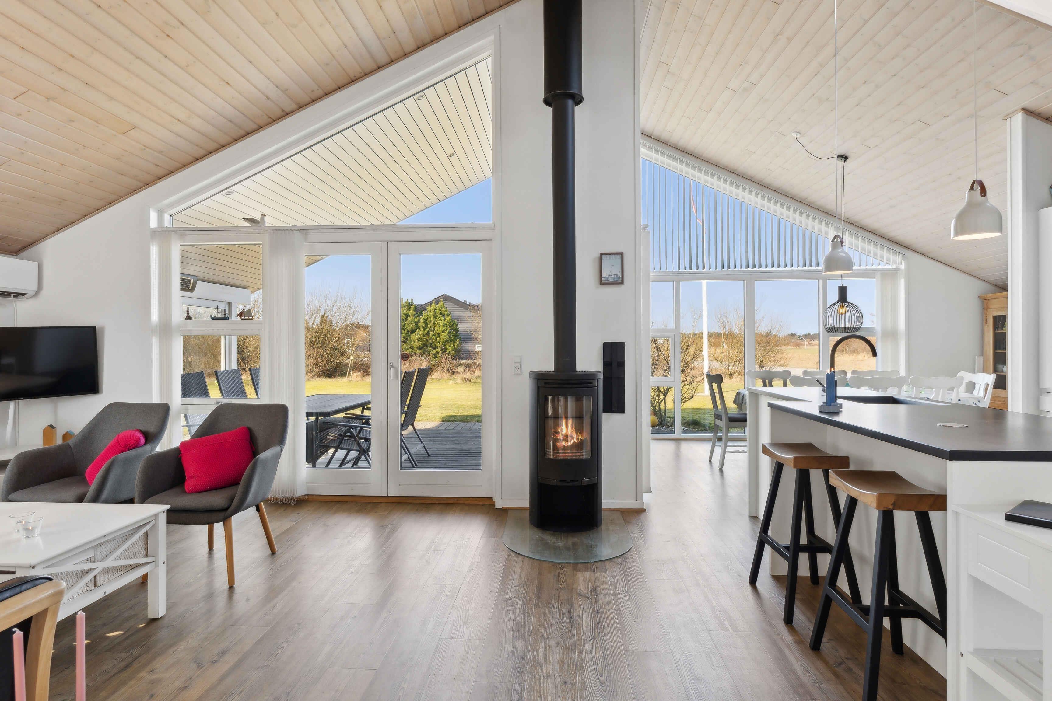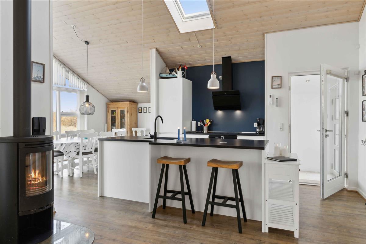 Dit vakantiehuis biedt alles wat je nodig hebt voor een ontspannen vakantie in een prachtige natuurlijke omgeving. Met 104 m² biedt het plaats aan 6 personen verdeeld over 3 slaapkamers. Het huis heeft een gezellige sfeer met een centraal geplaatste houtkachel die de keuken en woonkamer verbindt. Vanuit hier heb je toegang tot een overdekt terras, ideaal voor lange zomeravonden. Er zijn twee badkamers, waarvan één is uitgerust met een spa en sauna – een perfecte manier om de dag af te sluiten. Buiten vind je tuinmeubilair, een schommel en een vuurplaats. De omgeving biedt tal van activiteiten voor jong en oud. Probeer voetgolf, beachvolleybal of een bezoek aan de speeltuin. Alles is gemakkelijk bereikbaar. De westkust ligt op slechts 3 km afstand en biedt lange zandstranden en ruige golven. Geniet van het strand, wandelingen en prachtige zonsondergangen. Een ideale plek om te ontspannen.