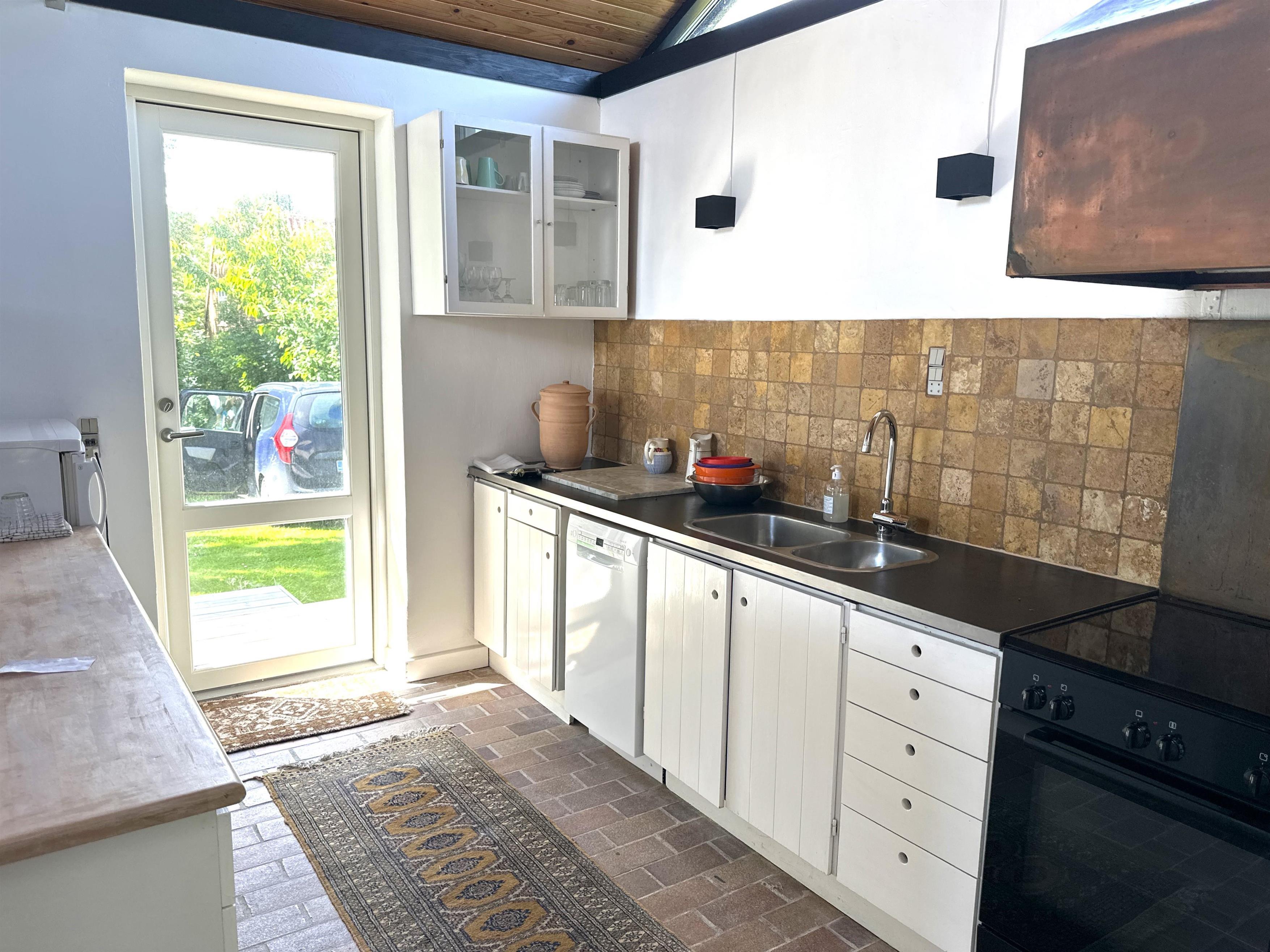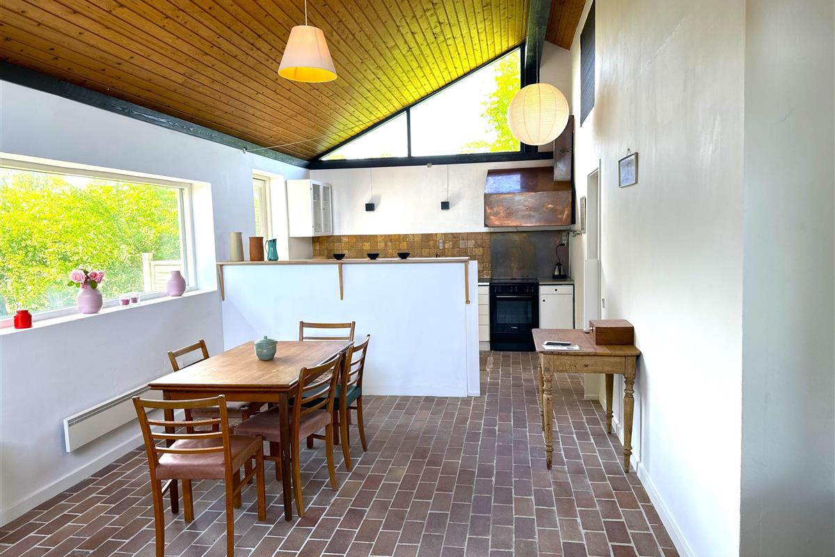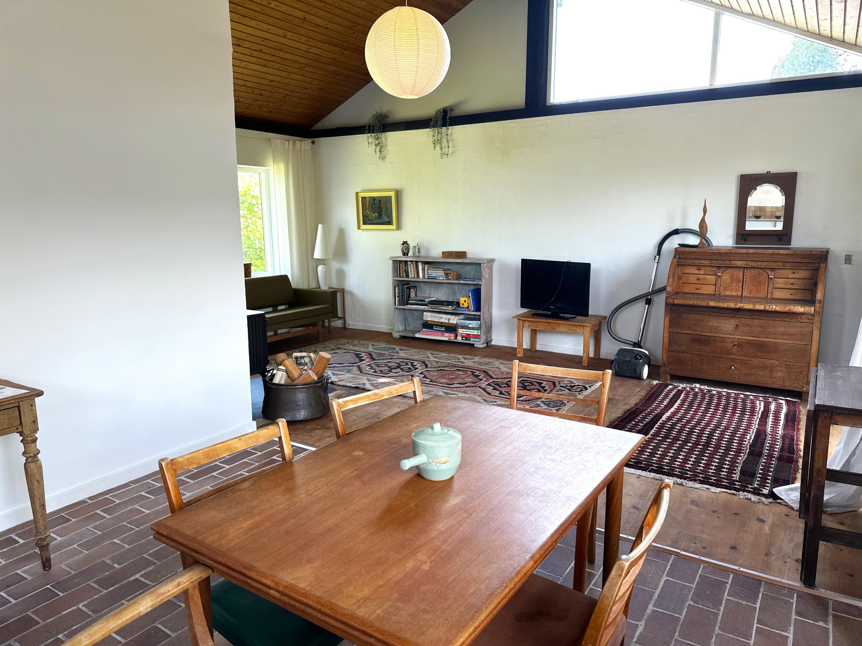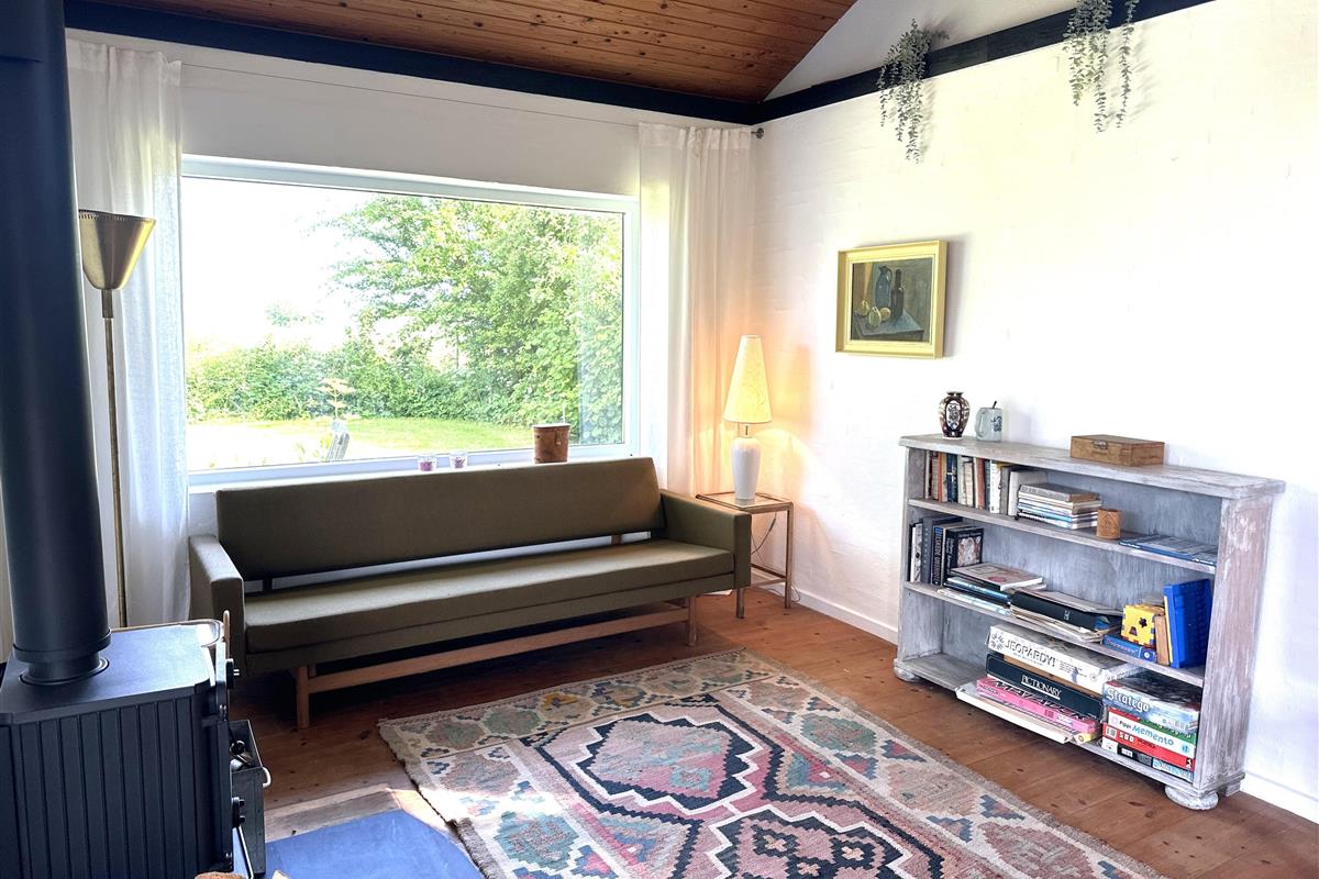 The house offers a cosy and inviting atmosphere with a bright kitchen-dining area, where you will find both a dining nook and a sofa corner – as well as a lovely wood-burning stove that spreads warmth and cosiness on cool days.