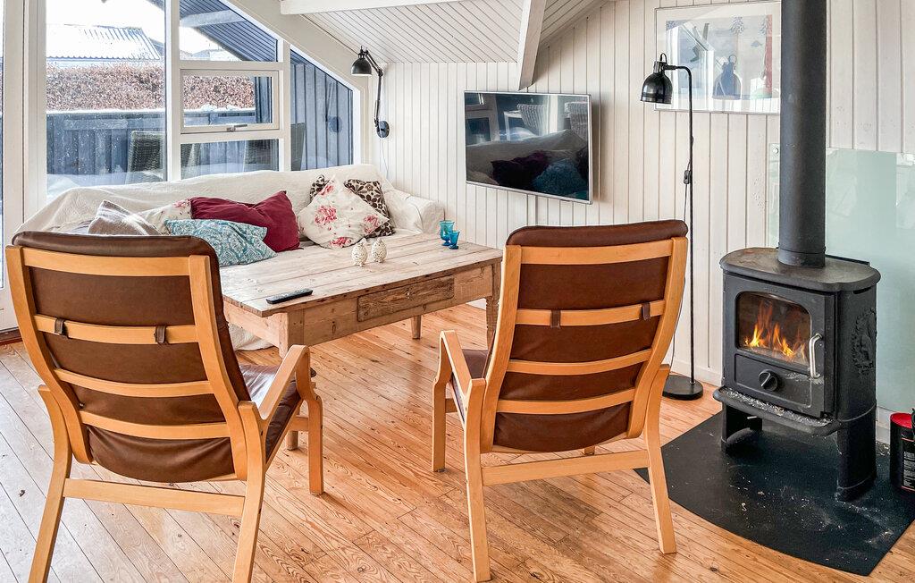 Kom binnen in het open interieur en geniet meteen van de lichte, vriendelijke sfeer. Neem plaats op de bank en fauteuils in de woonkamer en laat je blik door de grote ramen naar buiten dwalen. Ontspan voor de houtkachel en geniet van de behaaglijke warmte op koelere dagen. Gebruik de woonkamer om 's avonds samen te kletsen, te lezen of tv te kijken. Bereid je maaltijden in de mooie keuken, die functioneel is uitgerust en veel werkruimte biedt.