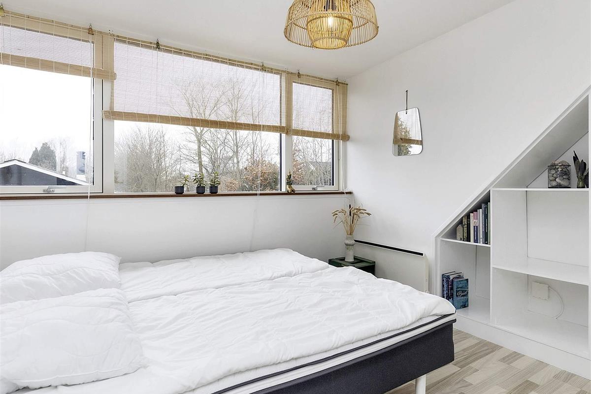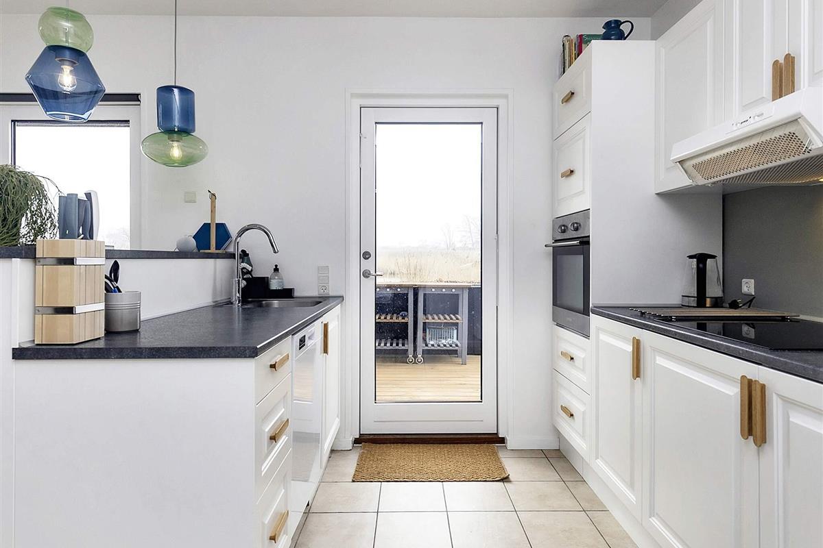 Im Erdgeschoss finden Sie zwei Schlafzimmer, ein Badezimmer, einen Hauswirtschaftsraum und eine große Wohnküche, die den Rahmen für alle Aktivitäten der Familie bildet. Vom Familienzimmer aus haben Sie direkten Zugang zur großzügigen Terrassenfläche, von der Sie den Blick auf einen kleinen See genießen können. Die Küche ist gut ausgestattet, u.a. mit Cerankochfeld, Heißluftofen und Geschirrspüler.