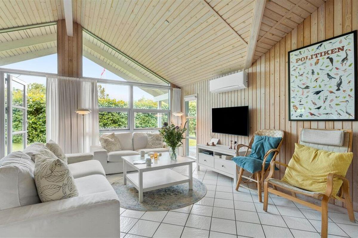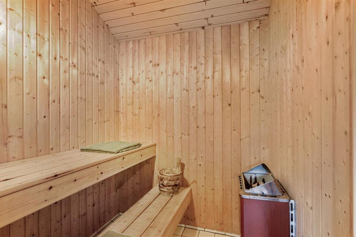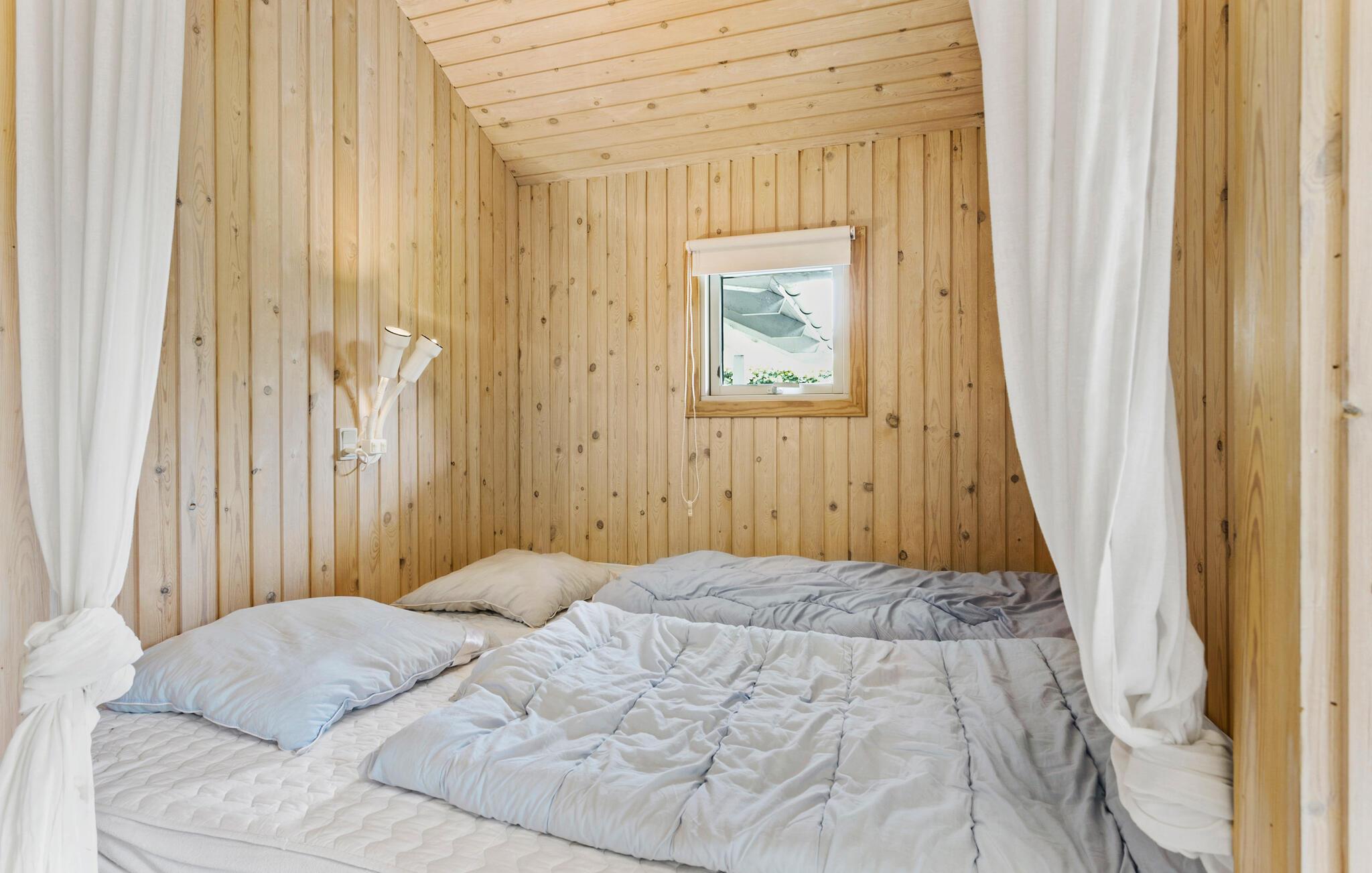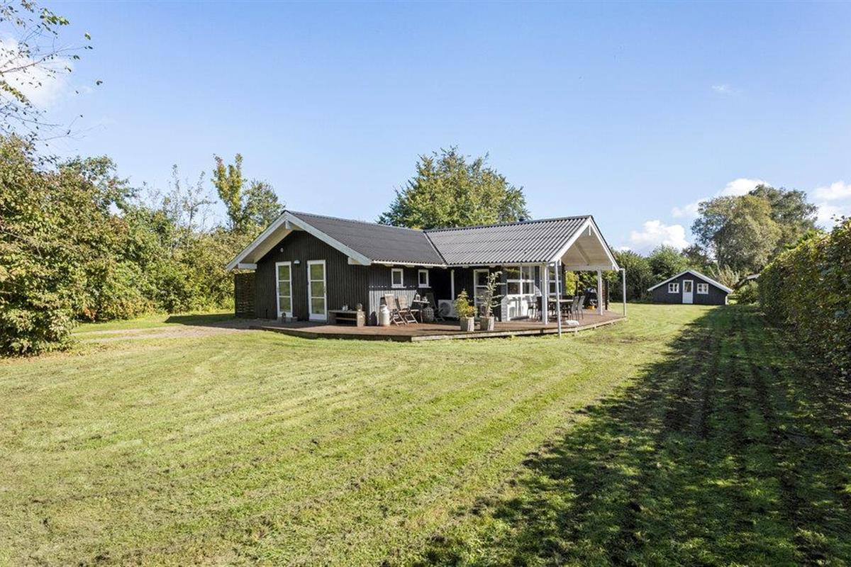 Mooie houten vakantiewoning in Bukkemose, dicht bij zee, golfbaan en vismeer, met sauna en bubbelbad.