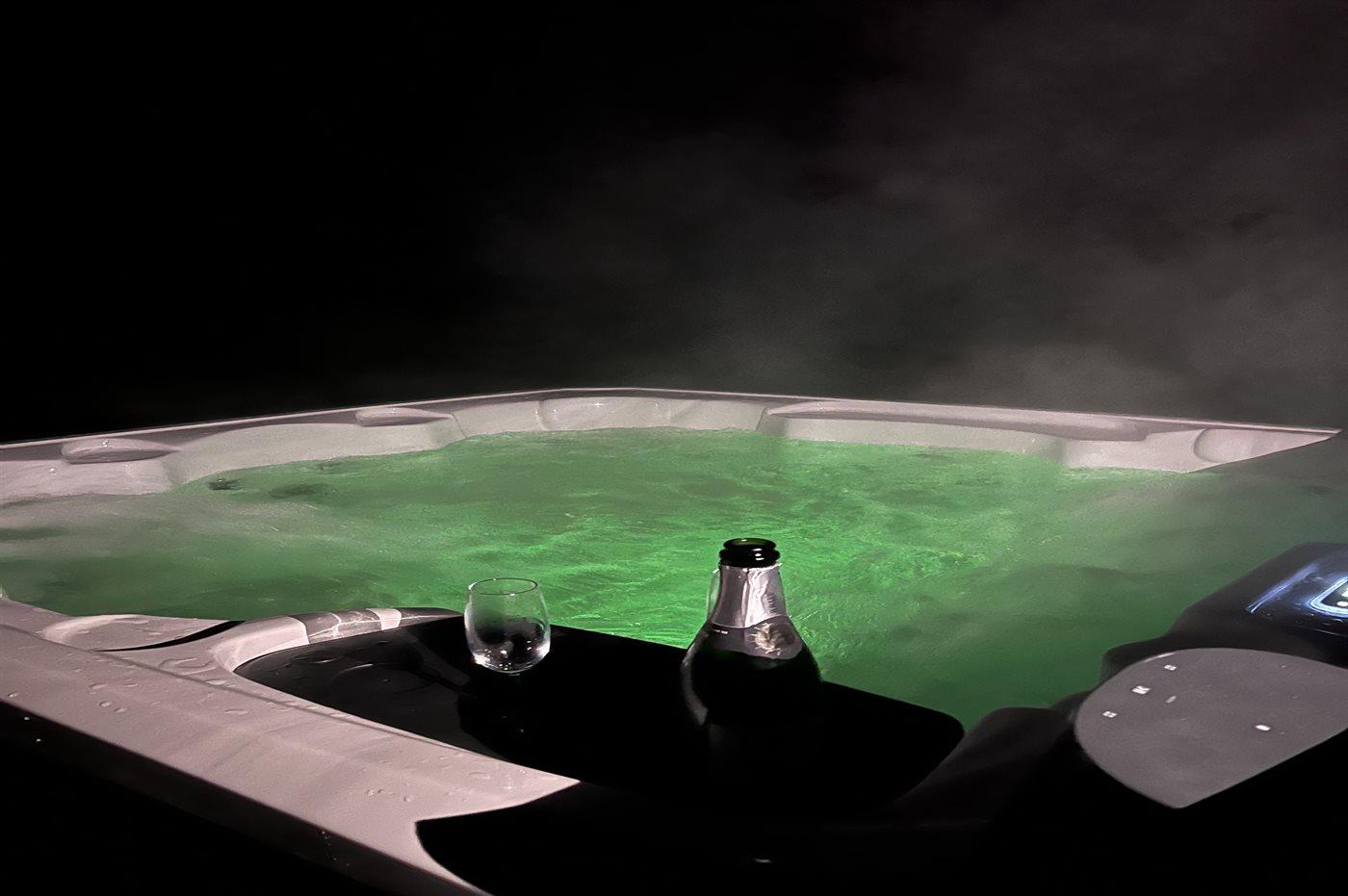 Het buitenbubbelbad (standwater) biedt ontspanning aan 6 personen.