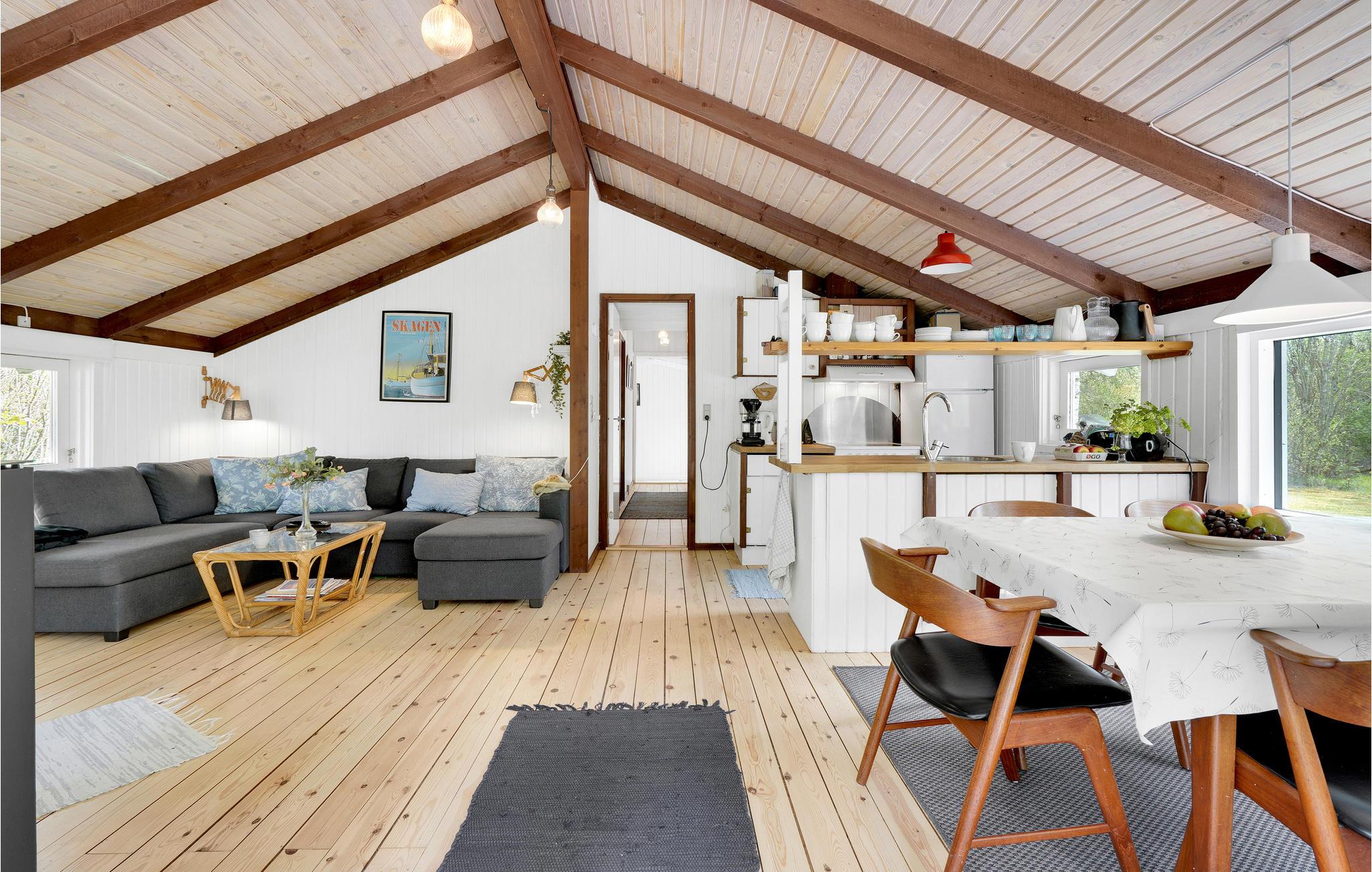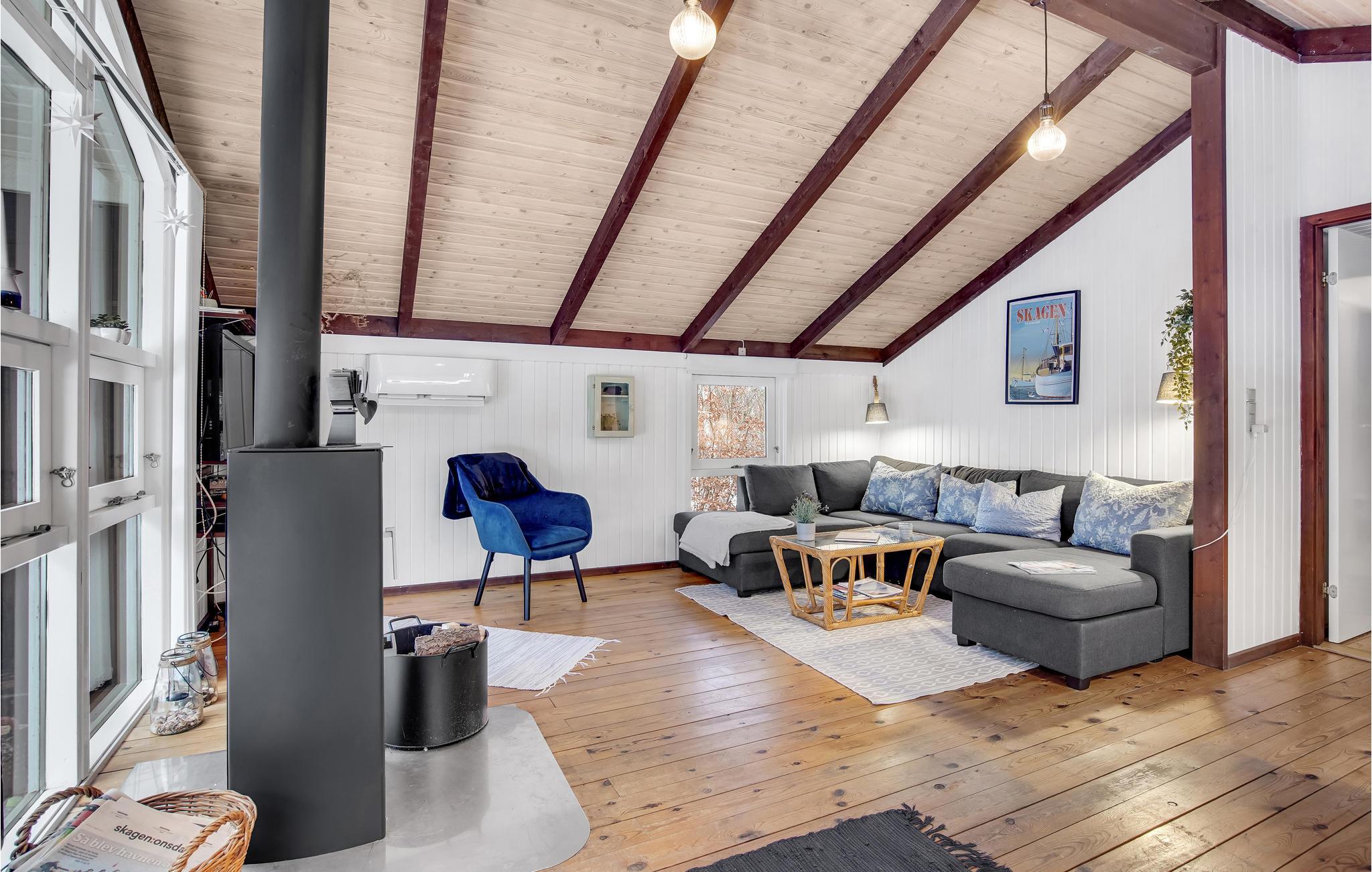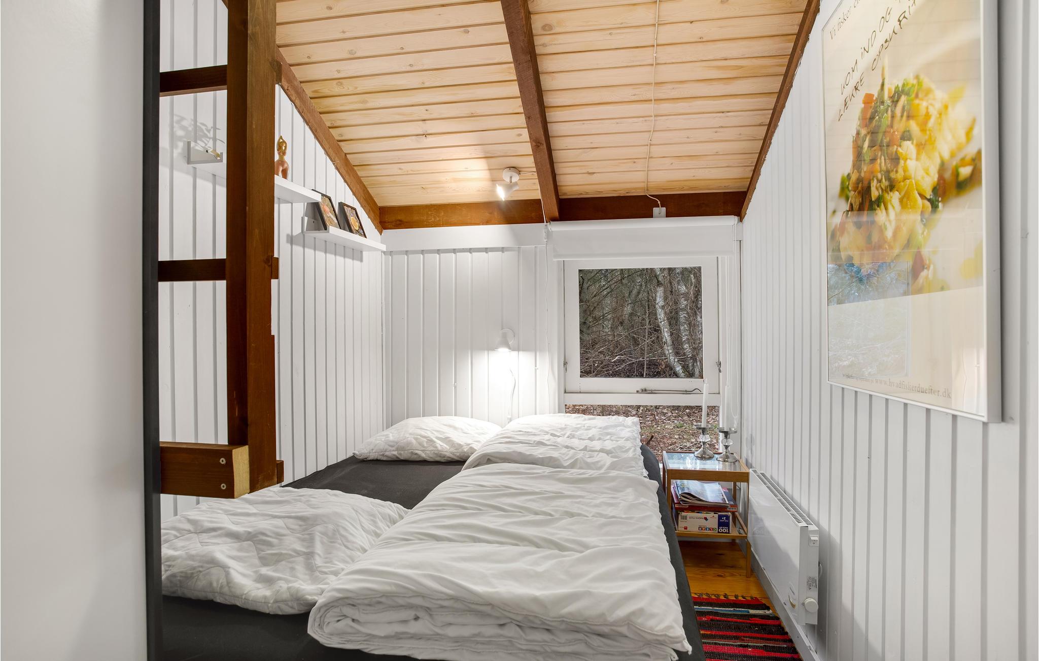 Ontdek dit knusse houten vakantiehuis met open haard en ruime vide, gelegen in de natuur nabij Bunken Strand.