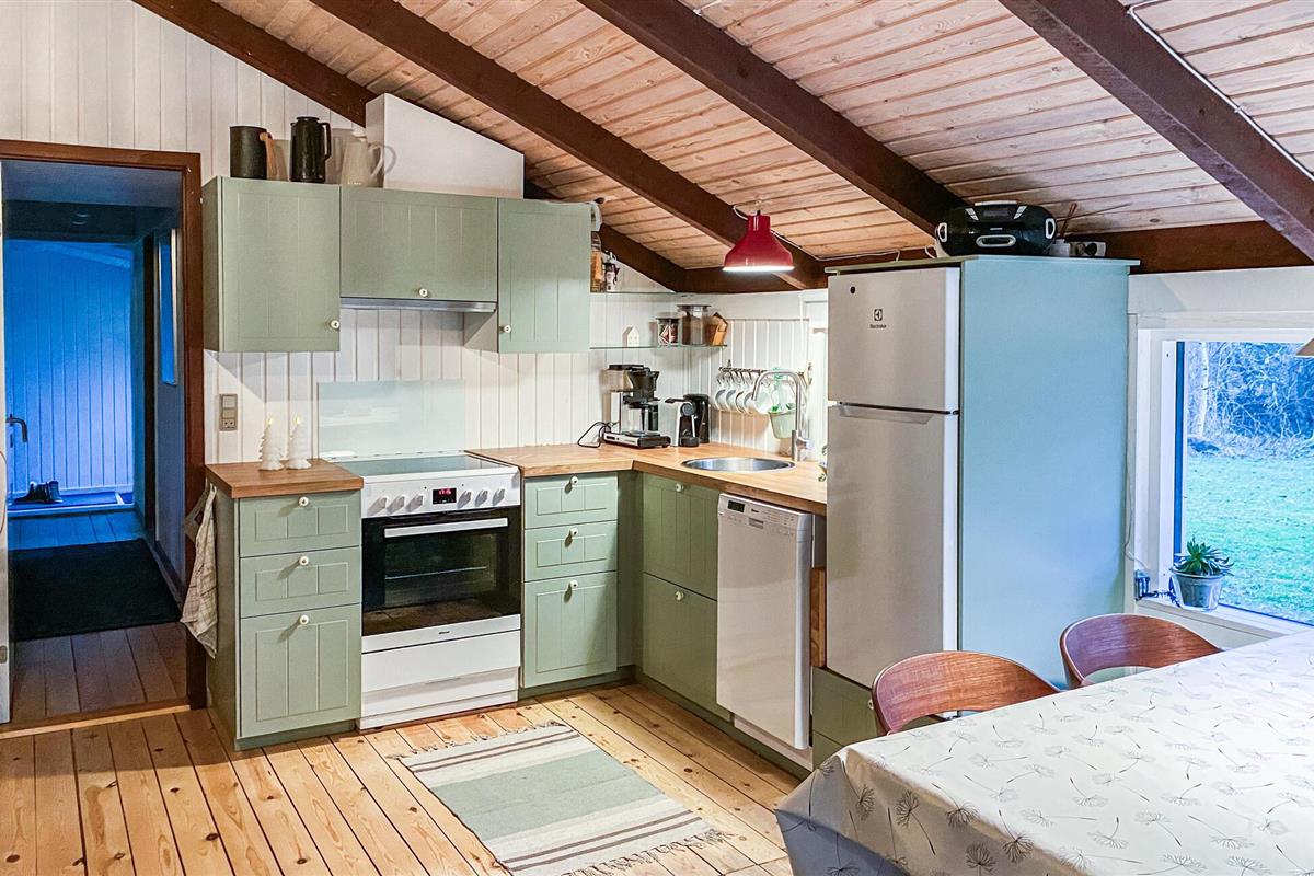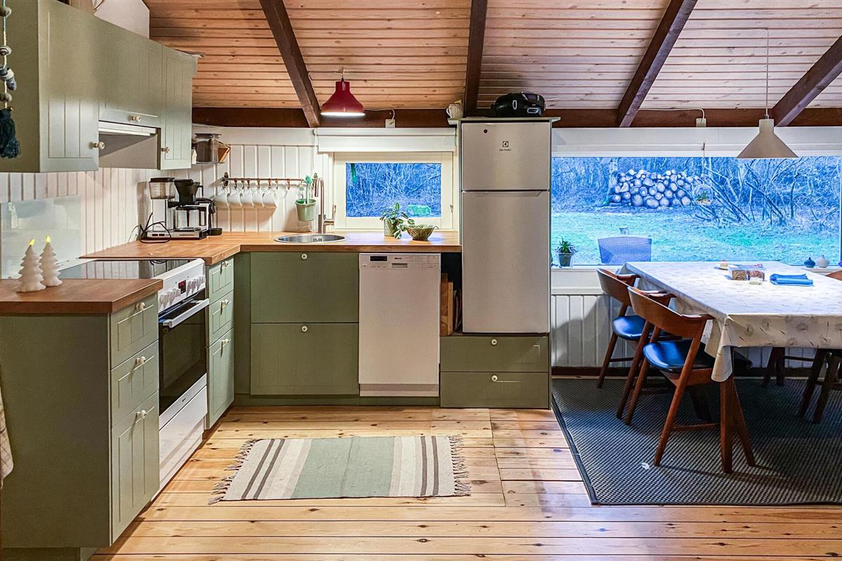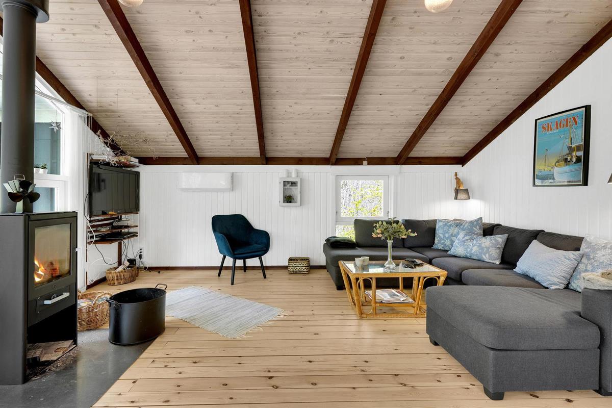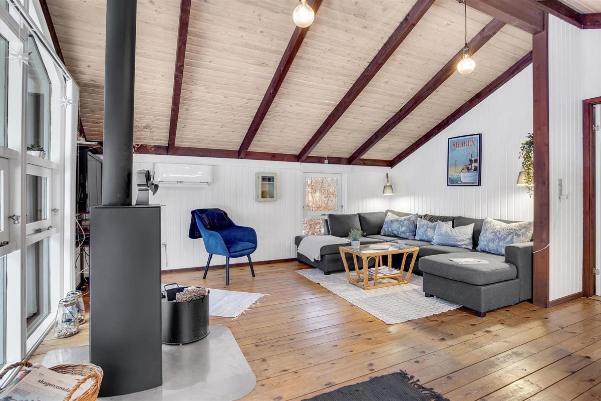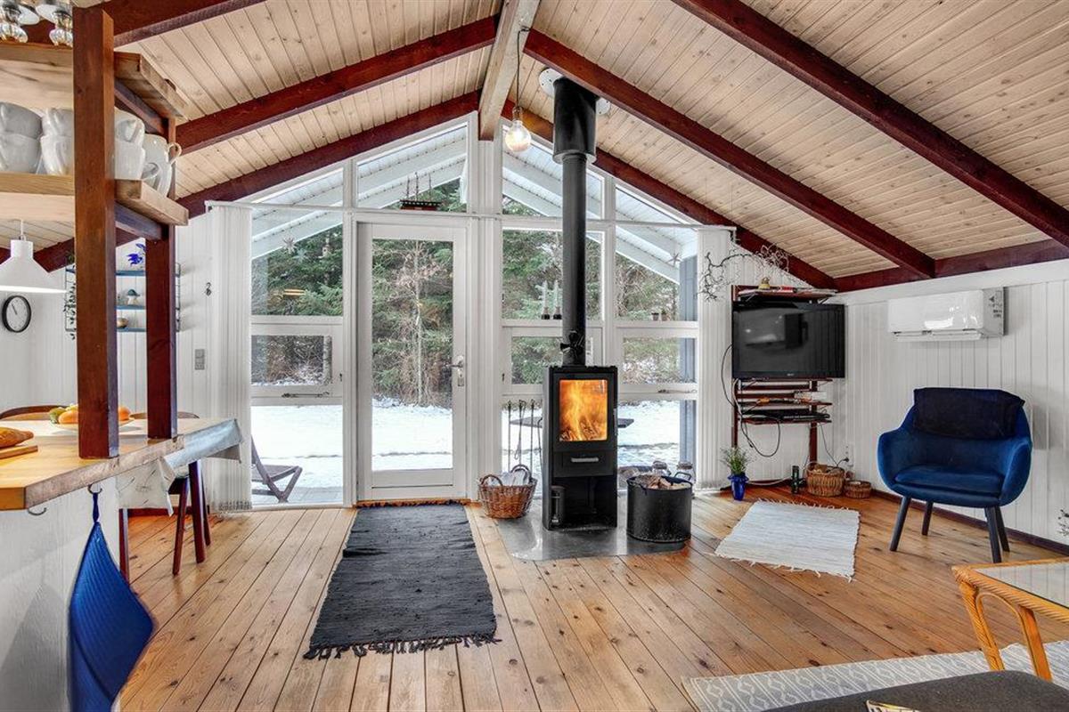 Het huis biedt jou en je geliefden een unieke gezellige vakantiesfeer. Je krijgt een bijzonder knus gevoel dankzij de verwarmende, knisperende open haard en een open ruimteconcept tot aan de puntgevel. Er is hier een vide met een grote matras, waar de kinderen misschien kunnen logeren? Het huis is volledig bekleed met hout en oogt modern, maar rustiek. Het goed onderhouden terrein rondom heeft terrassen, ruimte voor balspelen en gezelligheid rond het kampvuur.